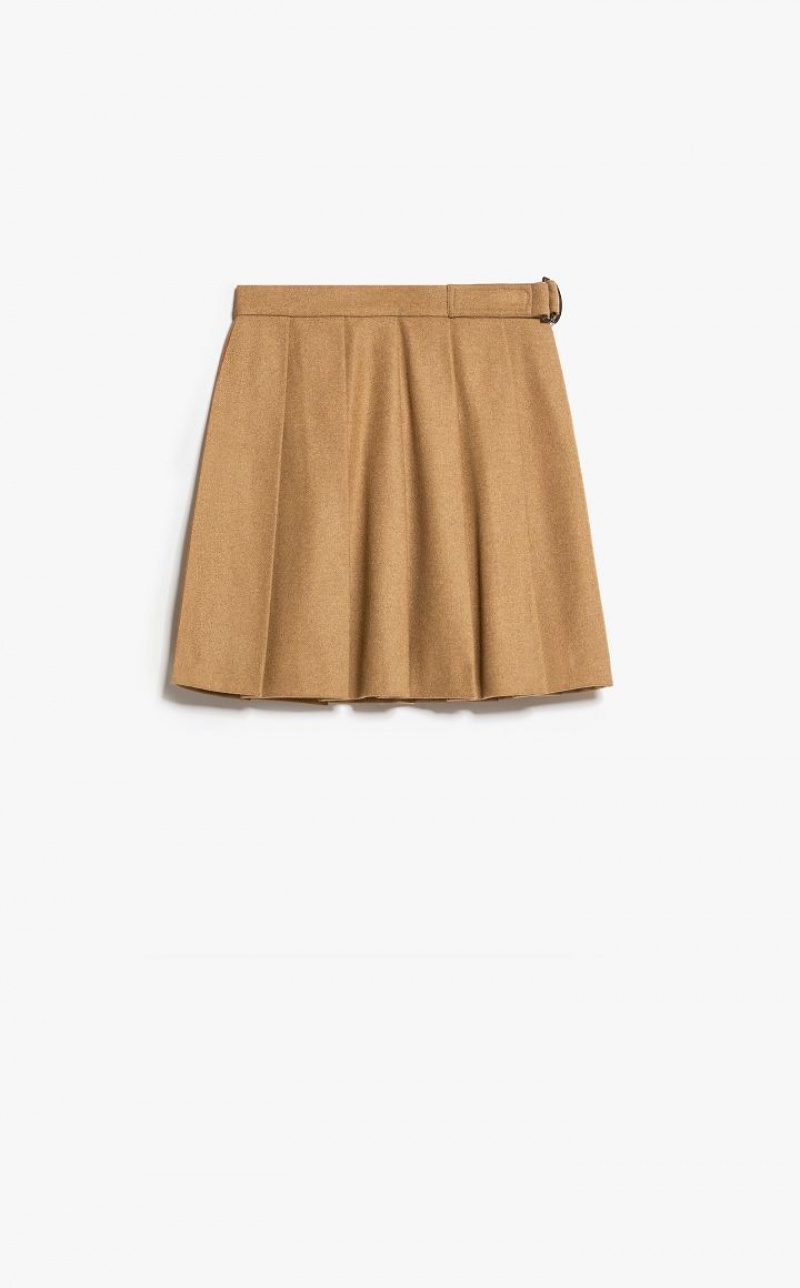 Pleated wool flannel skirt. Waistline defining ring buckle belt. Concealed zip fastening on one side. Length: 48 cm. Lined interior.
