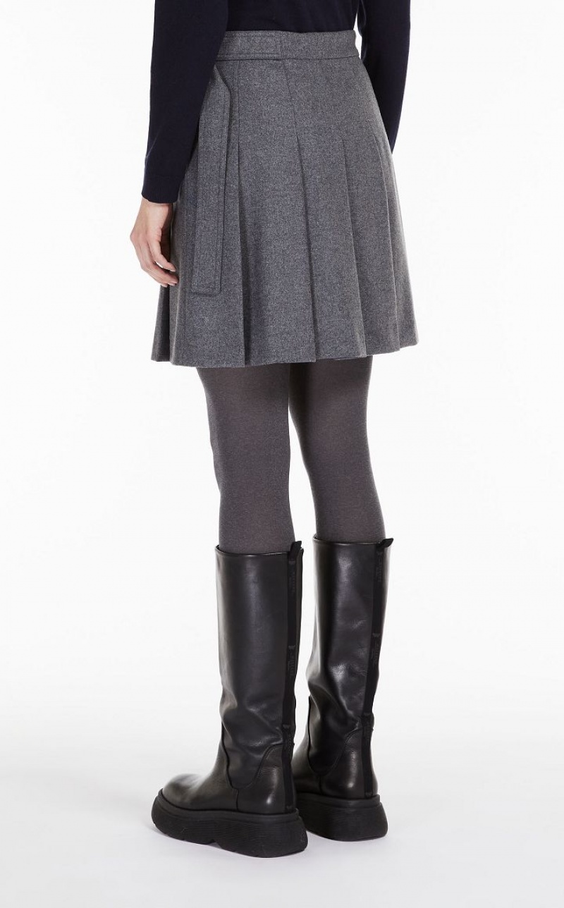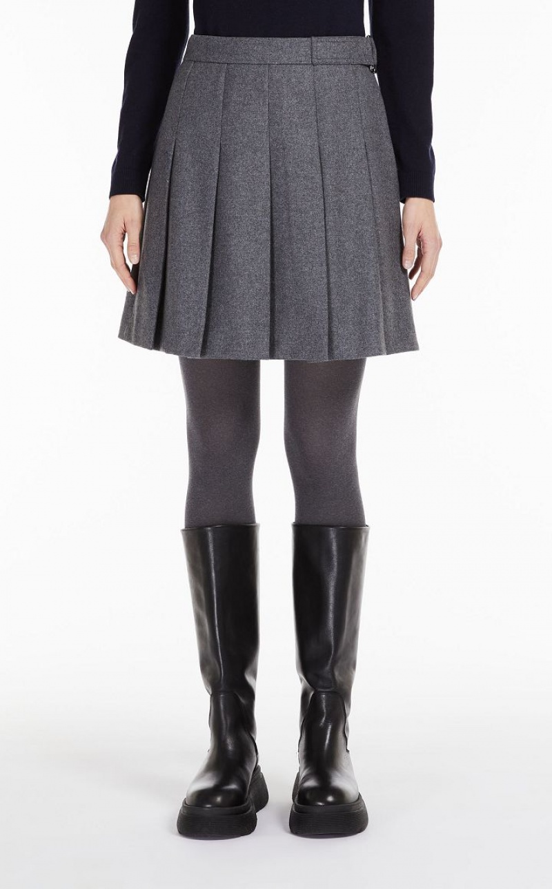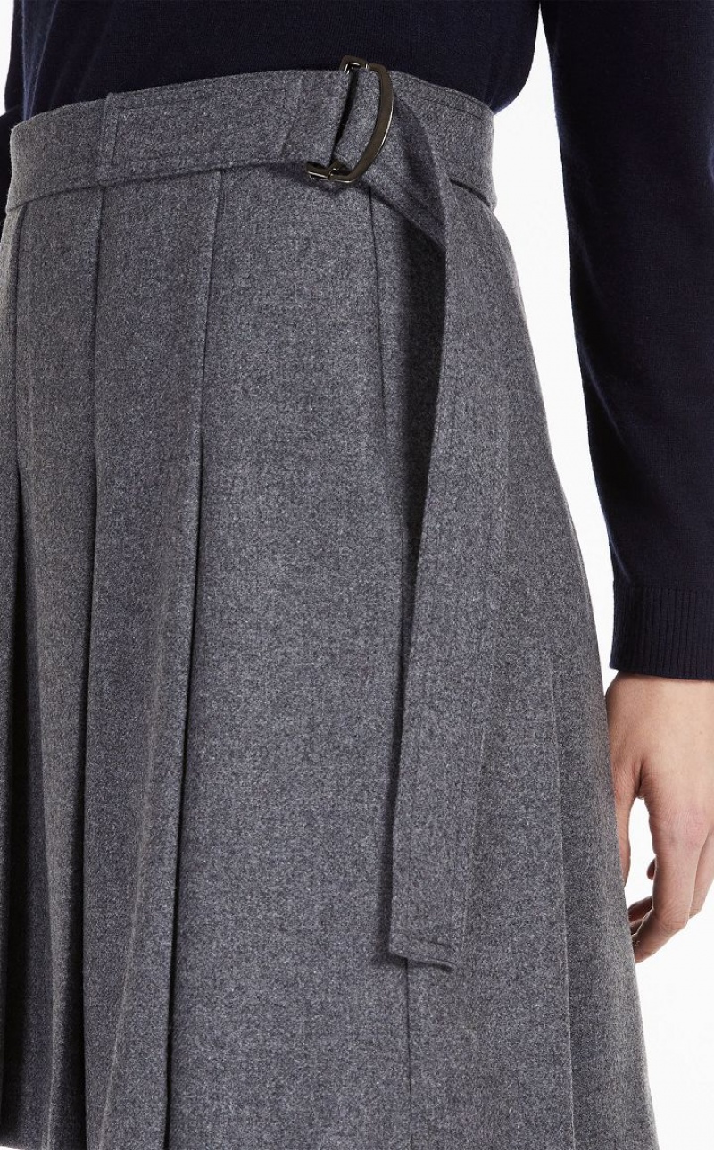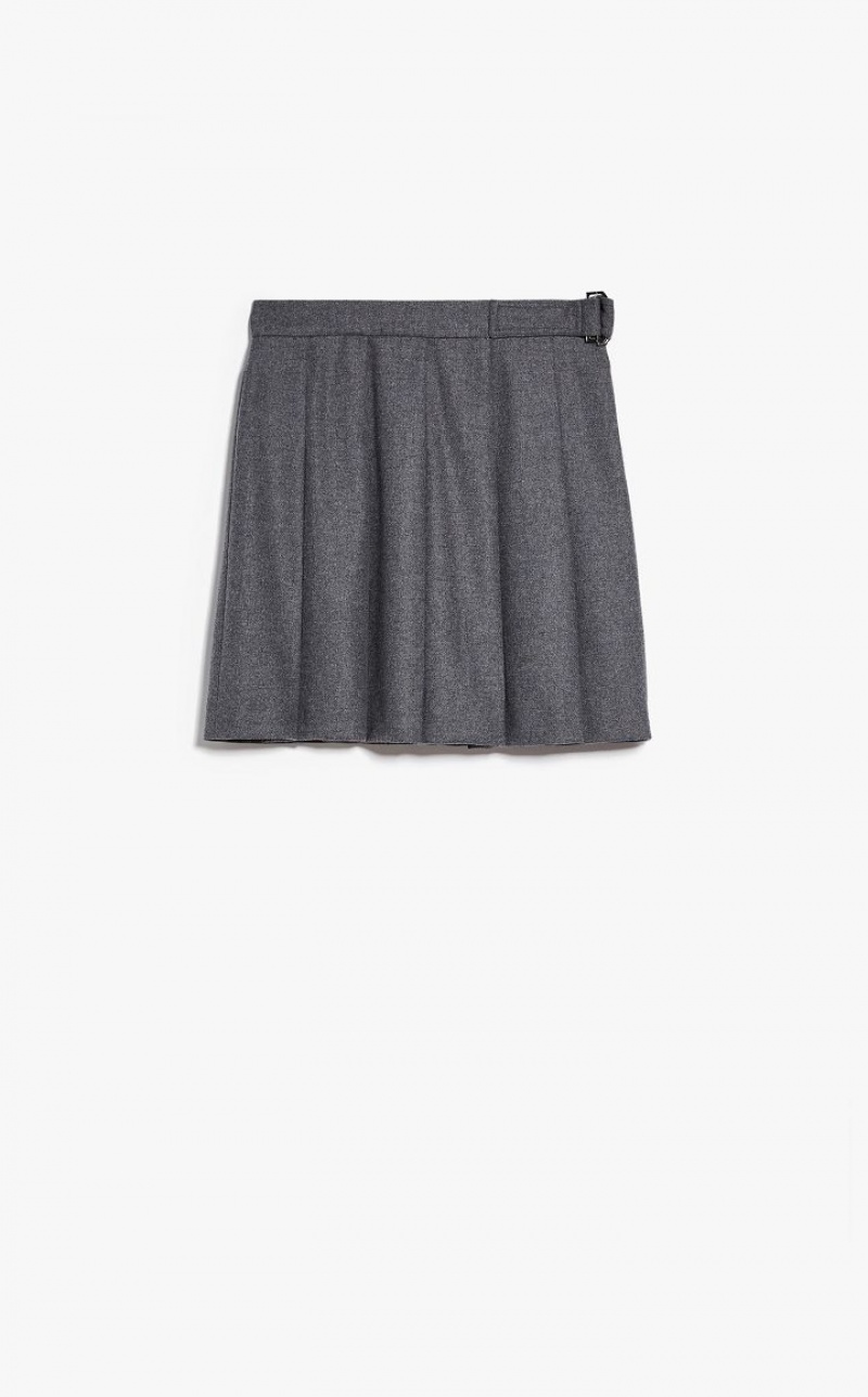 Pleated wool flannel skirt. Waistline defining ring buckle belt. Concealed zip fastening on one side. Length: 48 cm. Lined interior.