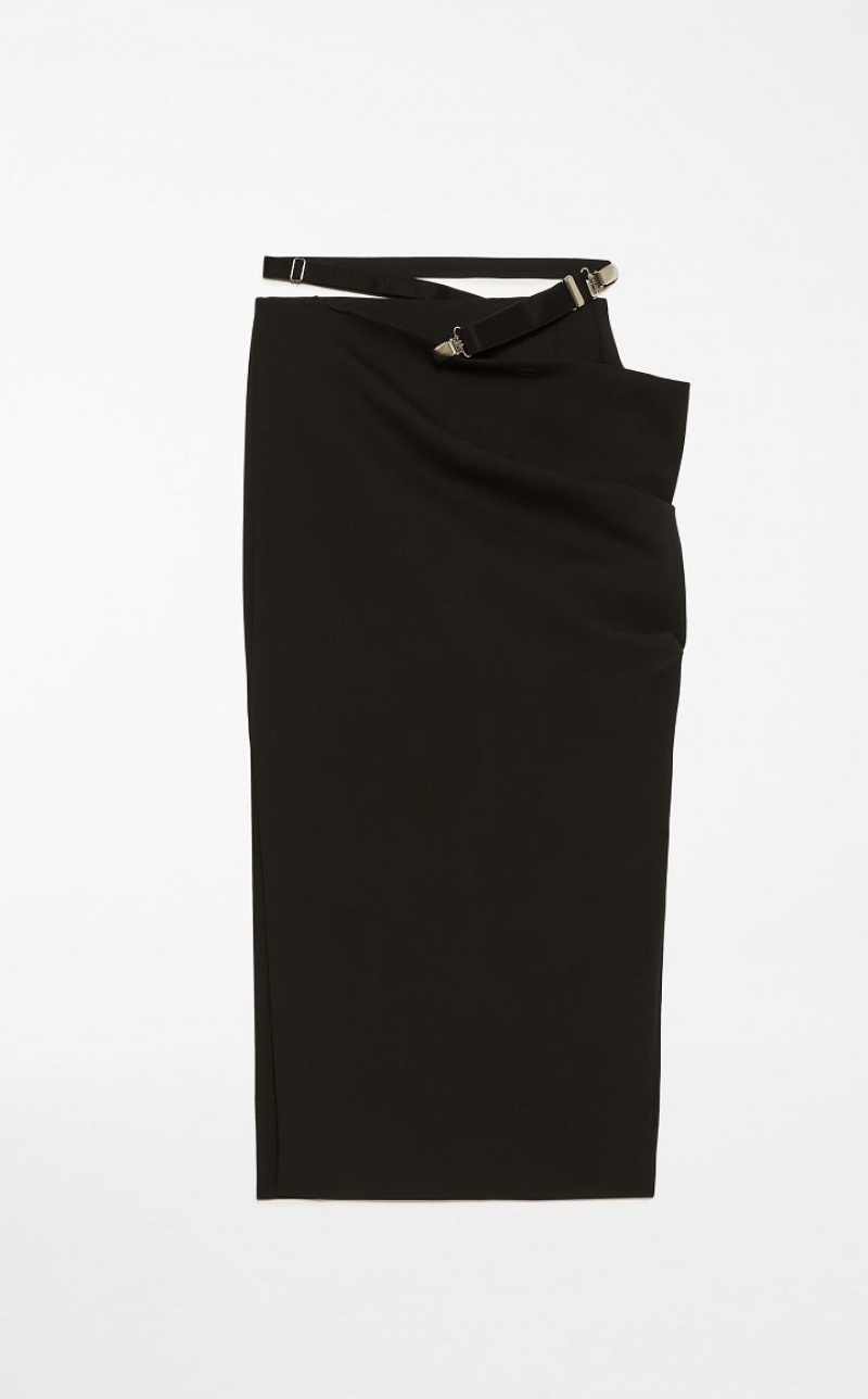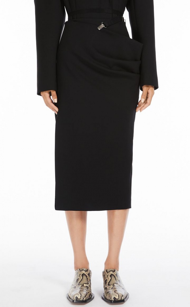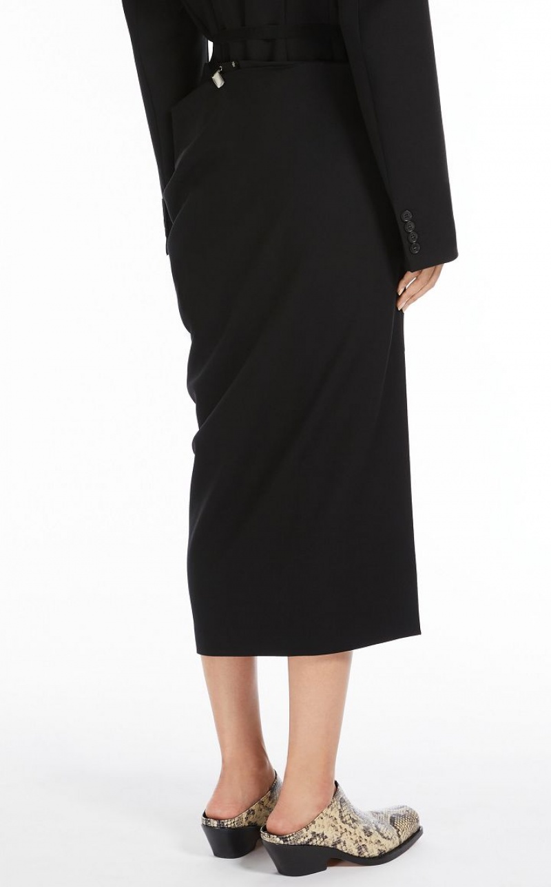 Wool midi skirt. The draped pattern on one side creates a feminine silhouette. The style features a contrasting strap that accentuates the waist, and a slit on one side. The piece is completed by the viscose and technical fabric lining. Length: 88 cm.