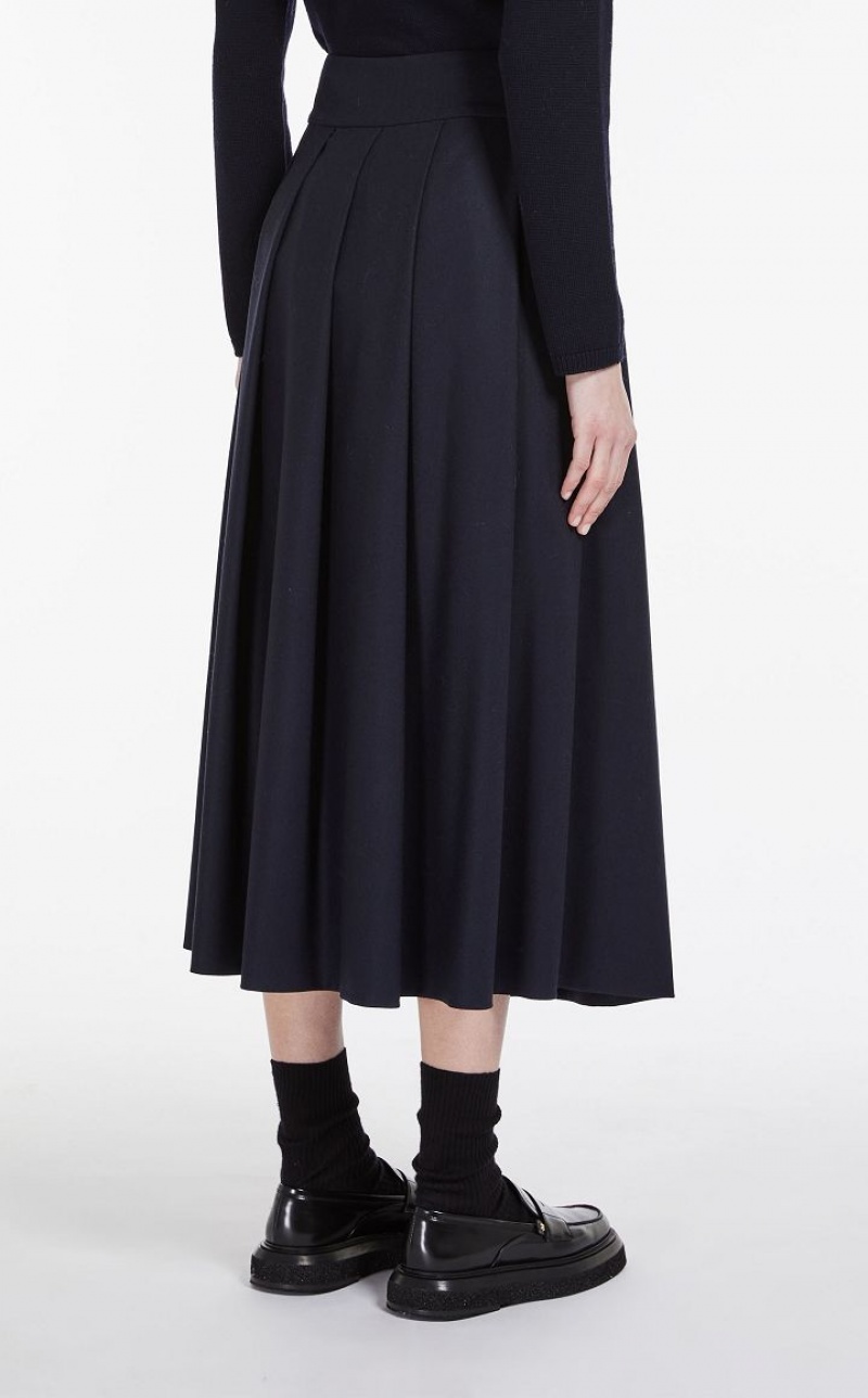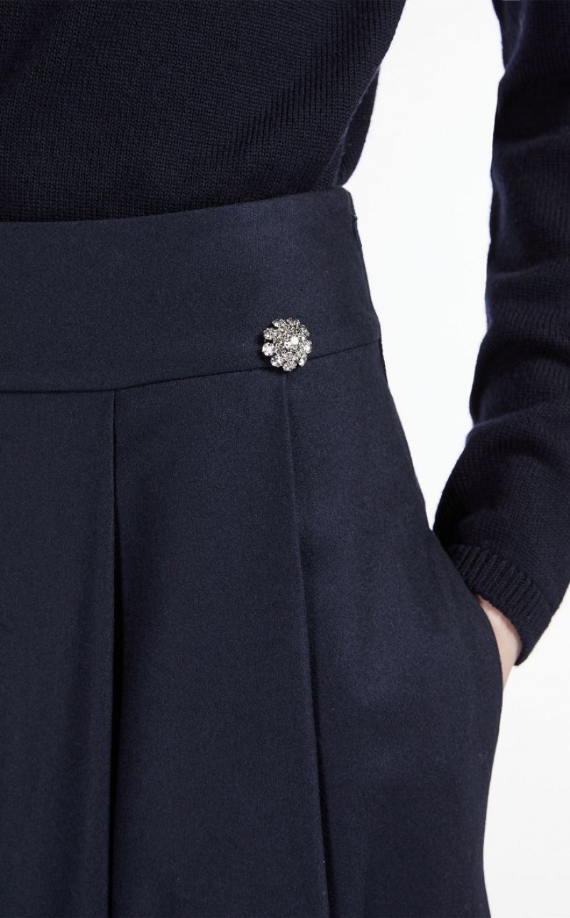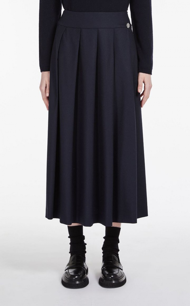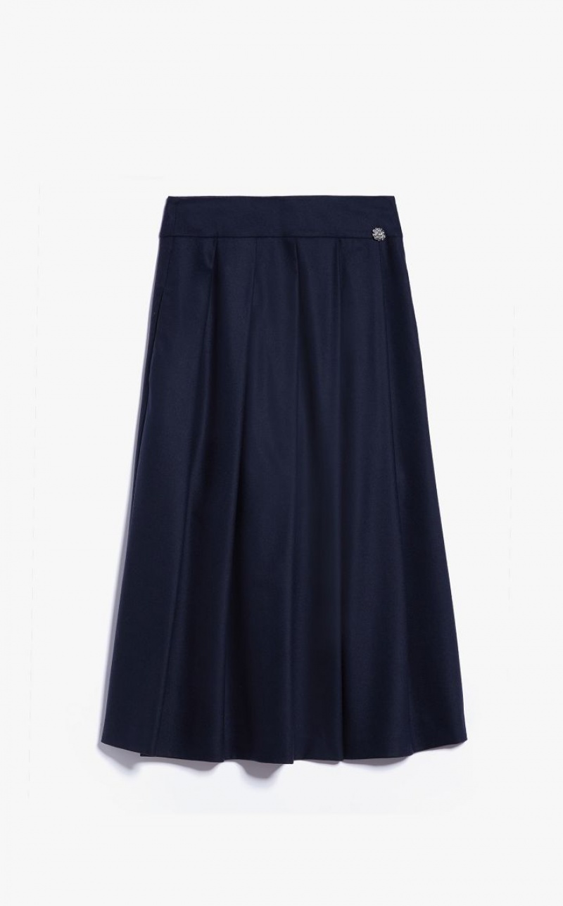 Flared midi skirt made of soft, warm pleated wool flannel. The construction features slant pockets on the sides and a matching belt with jewel embroidery, to embellish and accentuate the waist. Side concealed zip fastening. Length: 88 cm.
