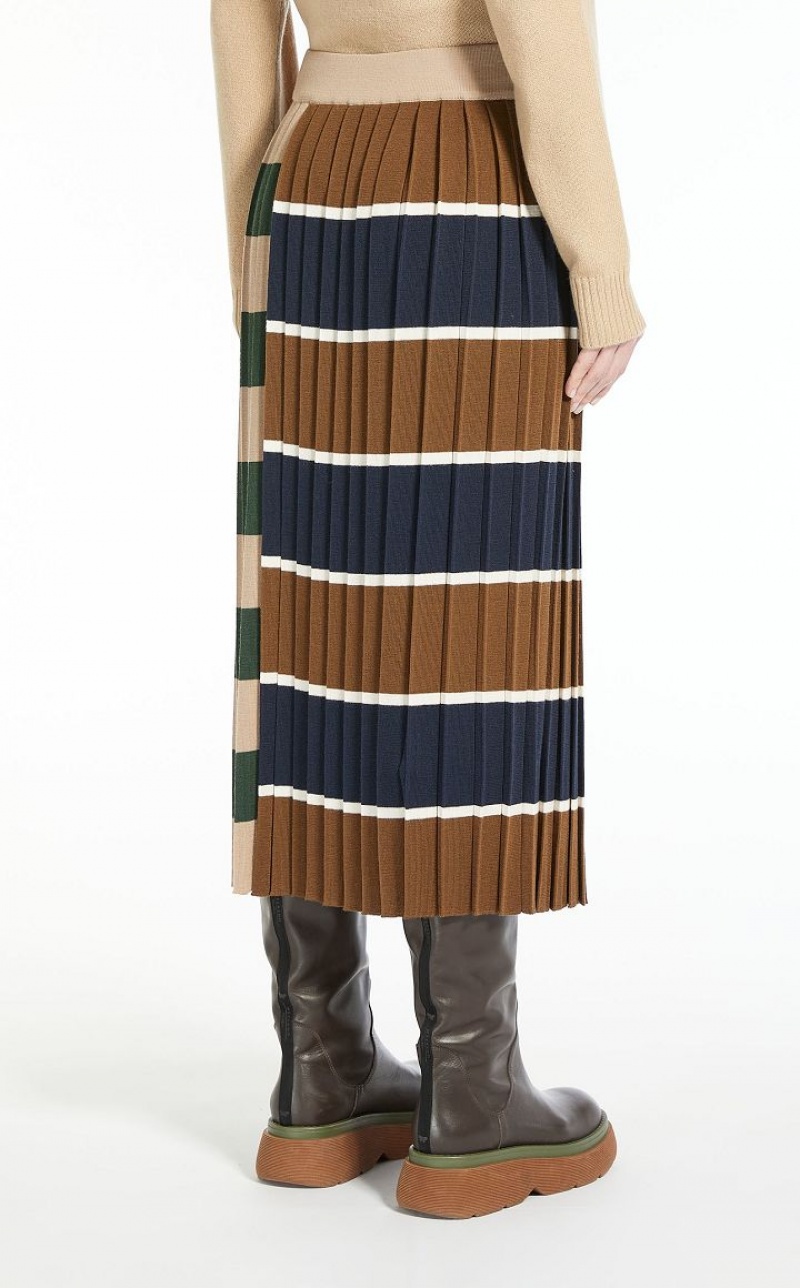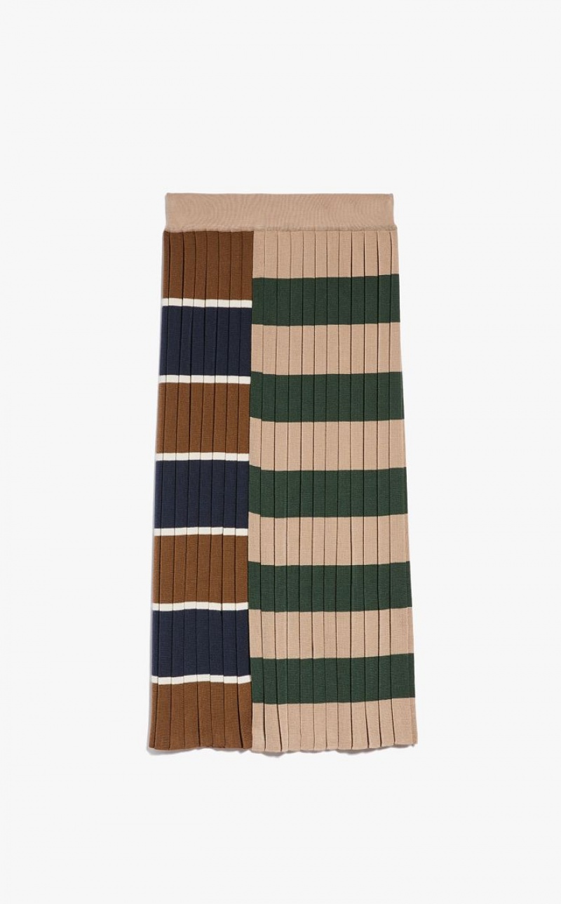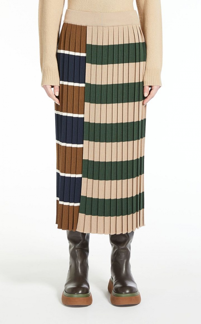 Wool blend yarn skirt featuring waistband detail. Movement bestowing full length pleated and patchwork detail. Length: 85 cm.