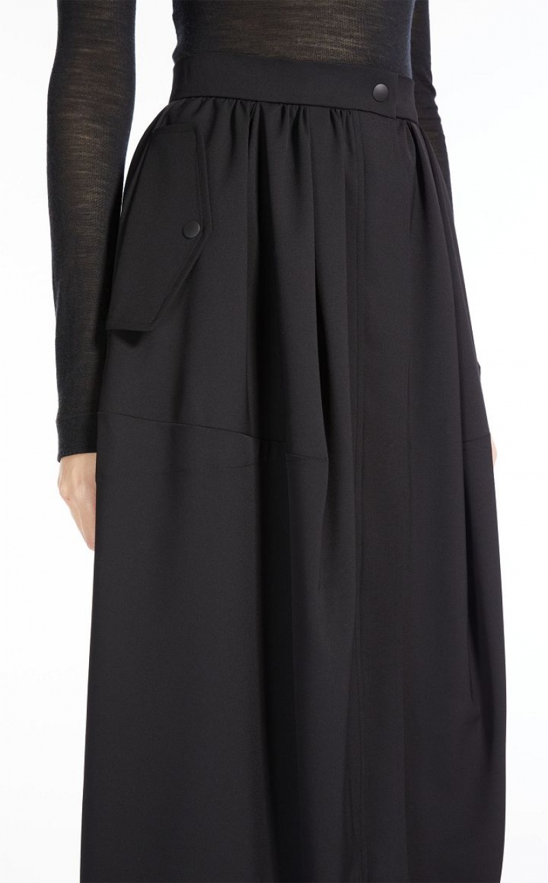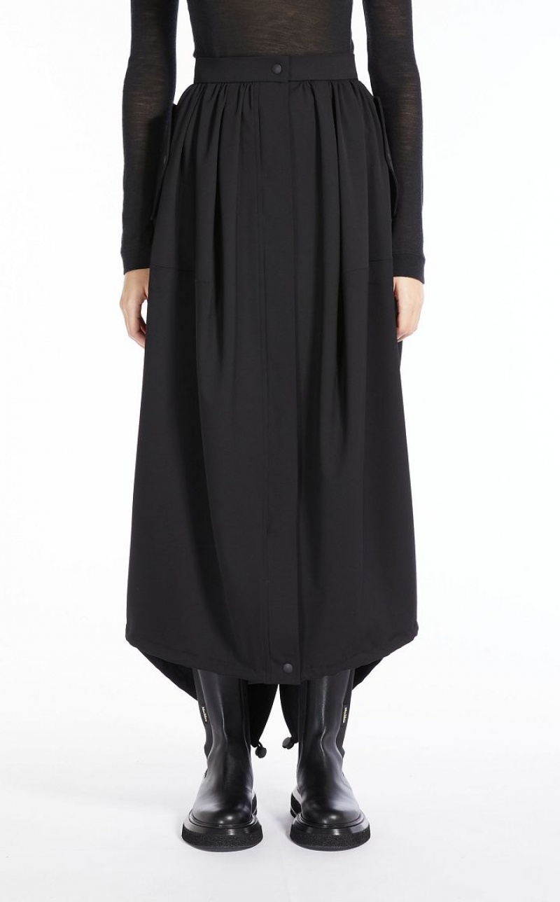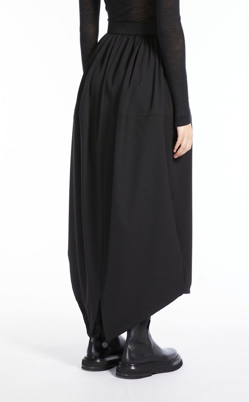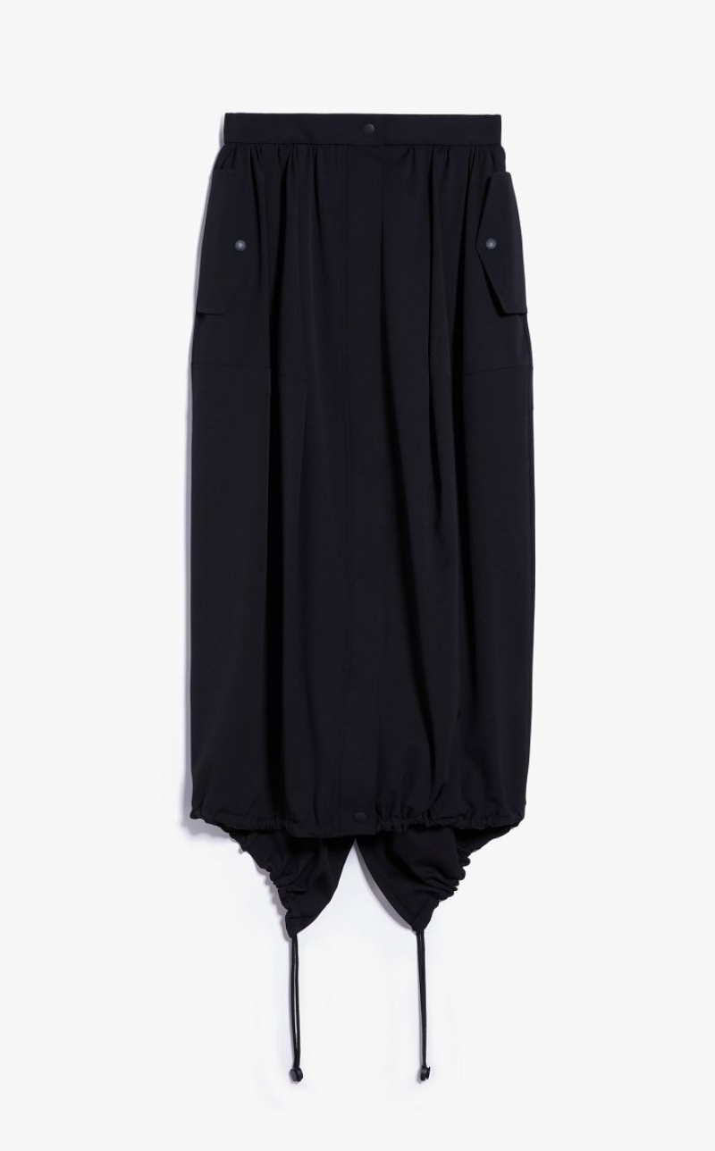 Long skirt in gabardine wool with a parka-inspired construction and asymmetric hem, drawstring and small V-shaped slit on the back. Unlined style with balloon volume and gathered motif at the waist, side pockets with flap and snap button. Front fastening with covered double-slider zip and snap button at the waist and at the hem. Length: 110 cm.
