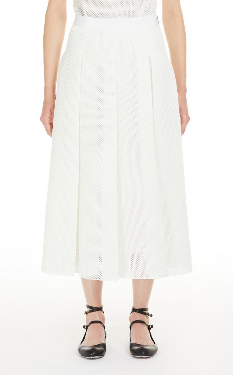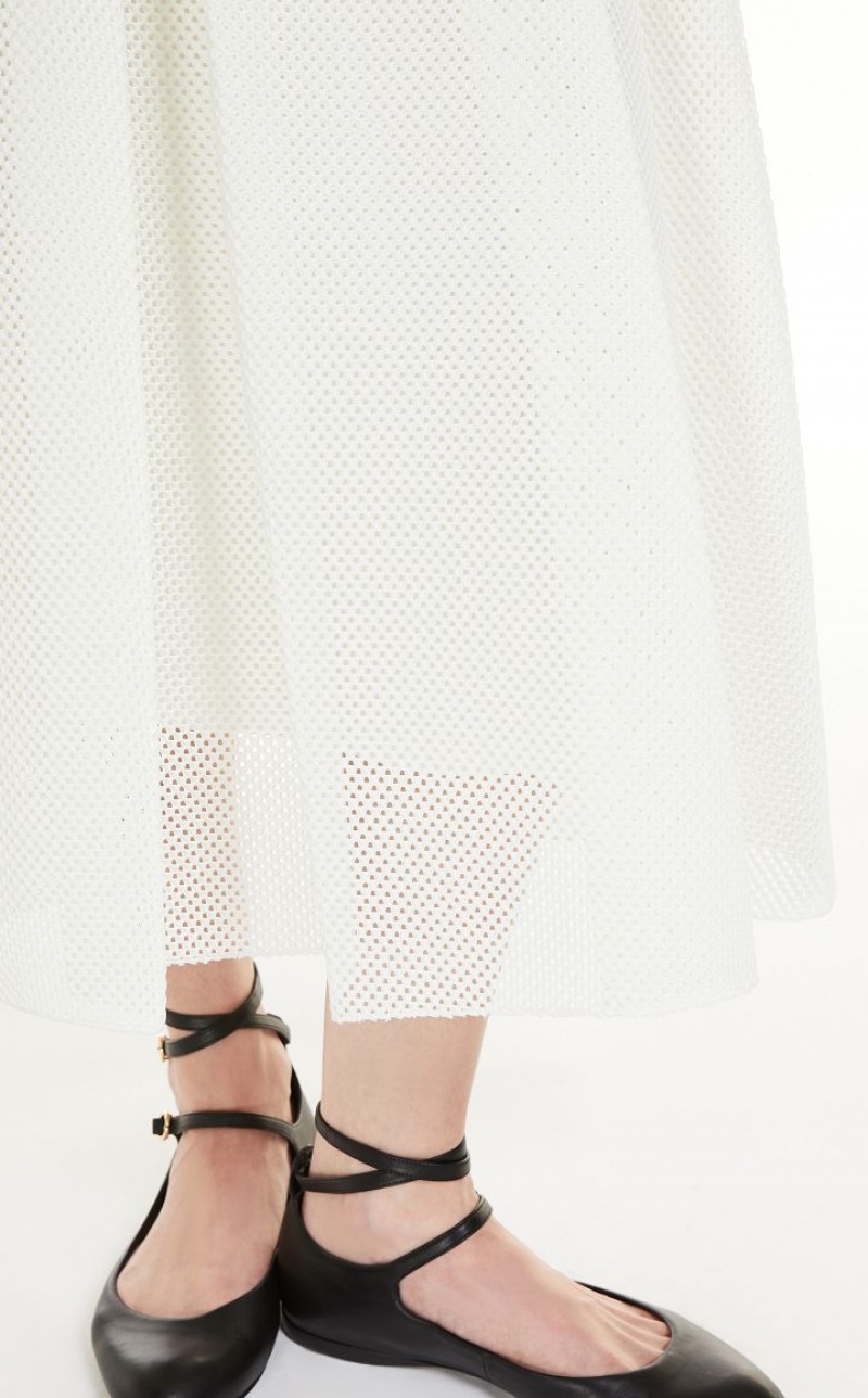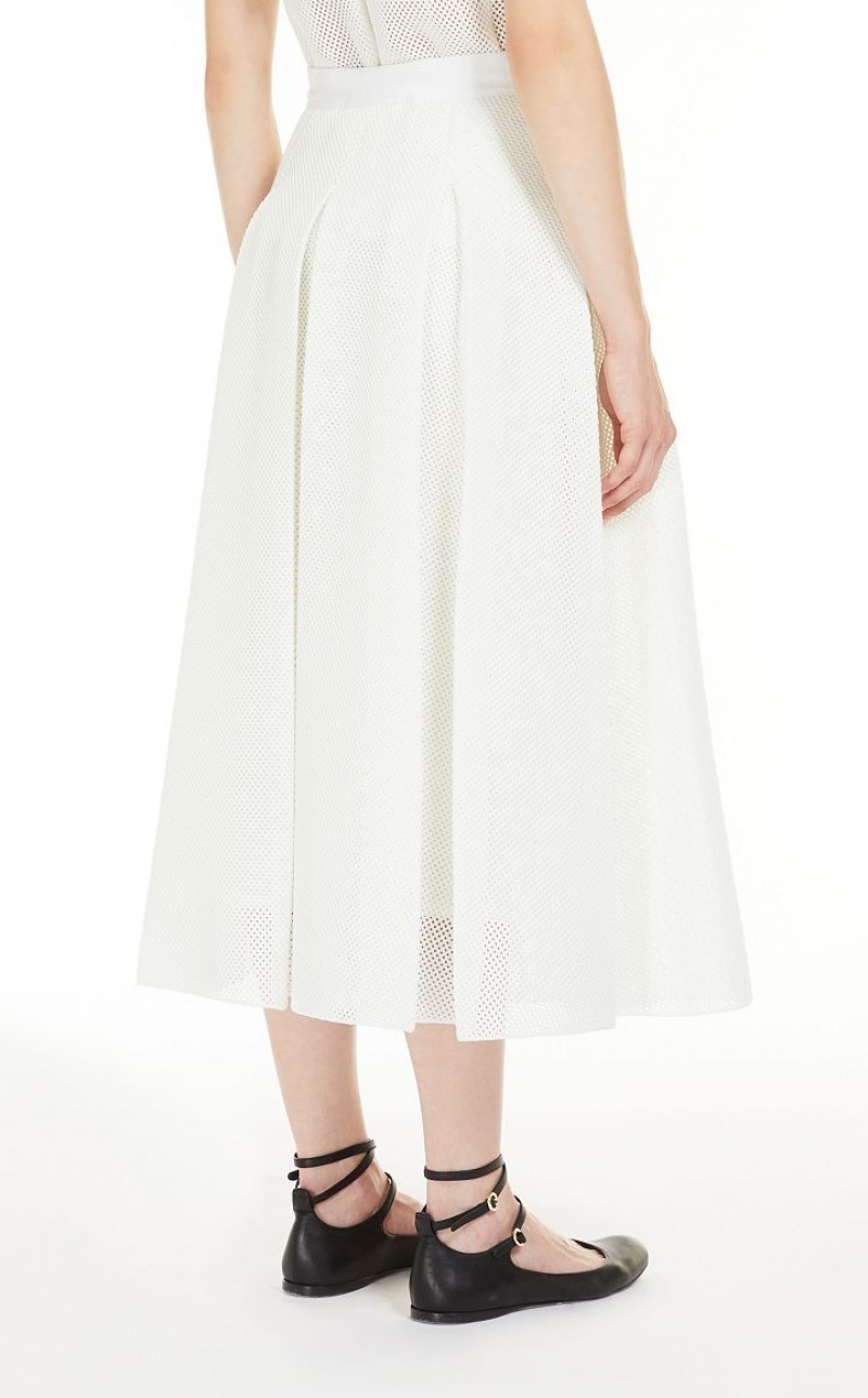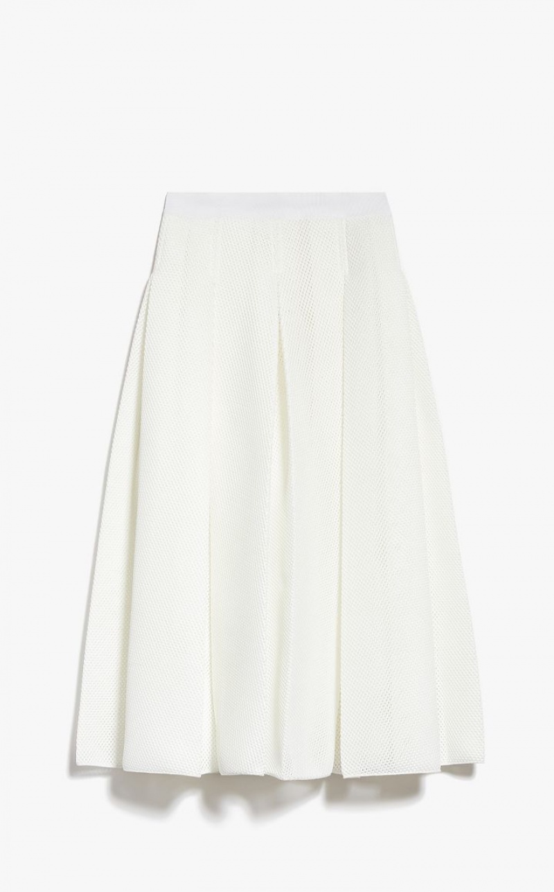 Midi skirt made of mesh-effect technical fabric, with by a fifties-inspired full volume featuring a high waist in grosgrain with semi-stitched pleats. The model comes with a removable stretch viscose jersey tube slip. Side fastening with zip and customised slider. Length: 80 cm.