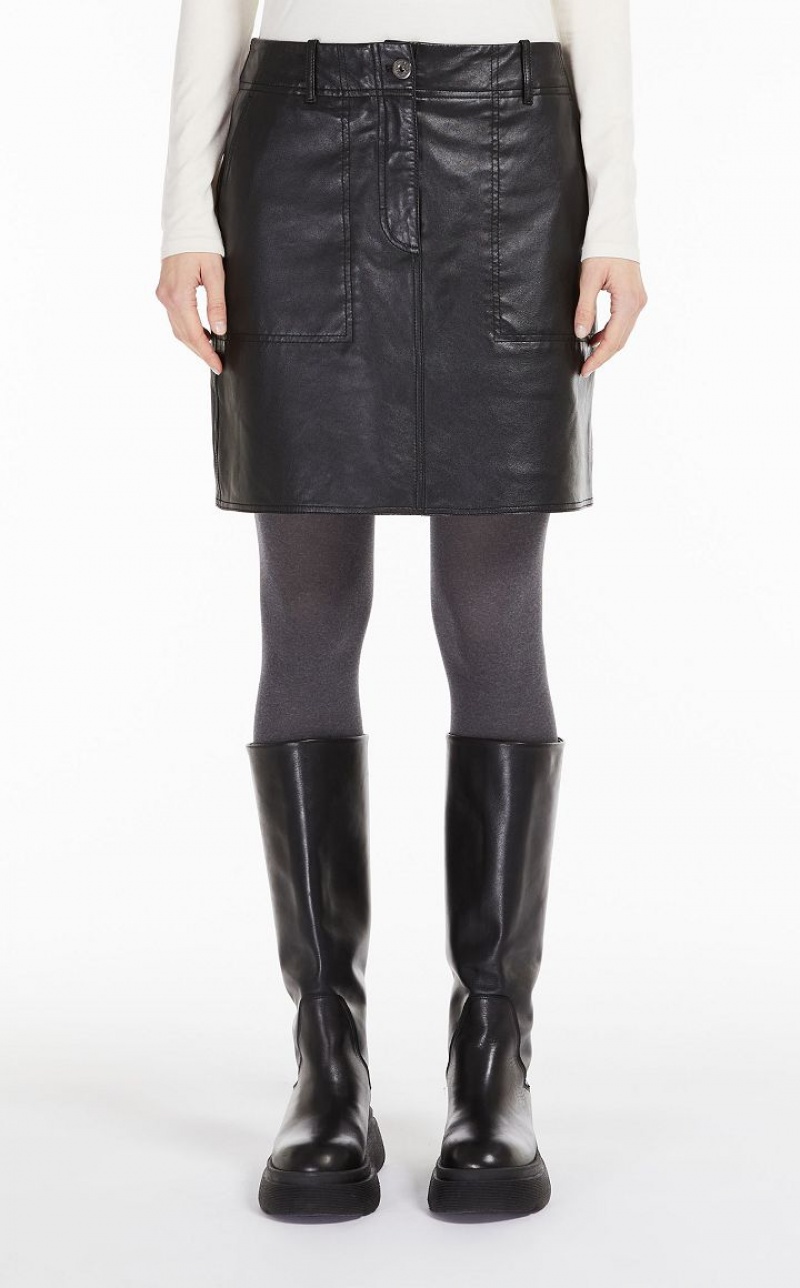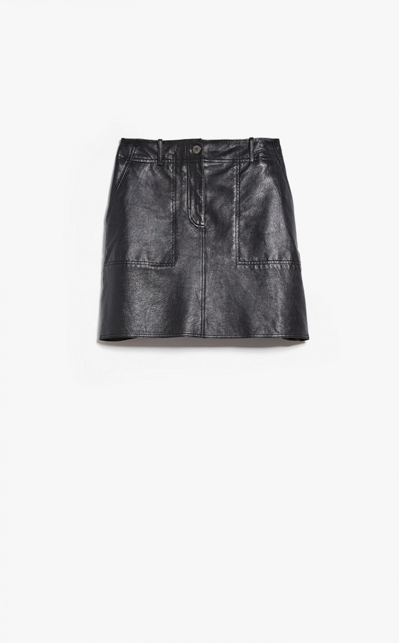Nappa leather mini skirt featuring topstitched belt loop detail, slant front pockets and patch rear pockets. Zip and button fastening. Slight A line fit. Length: 48 cm. Lined interior.
