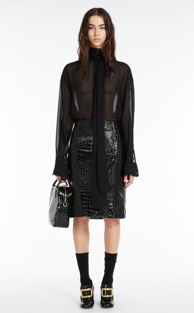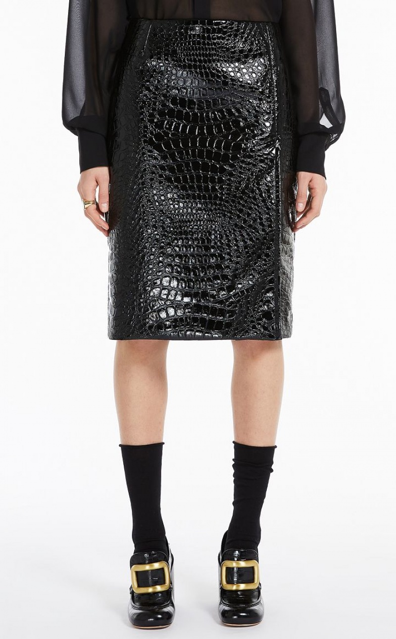 Straight pencil skirt without a waistband but with a deep overlapped slit on the side. Made of a cotton blend fabric with an all-over crocodile-embossed motif. Concealed zip fastening on the back. Lined.