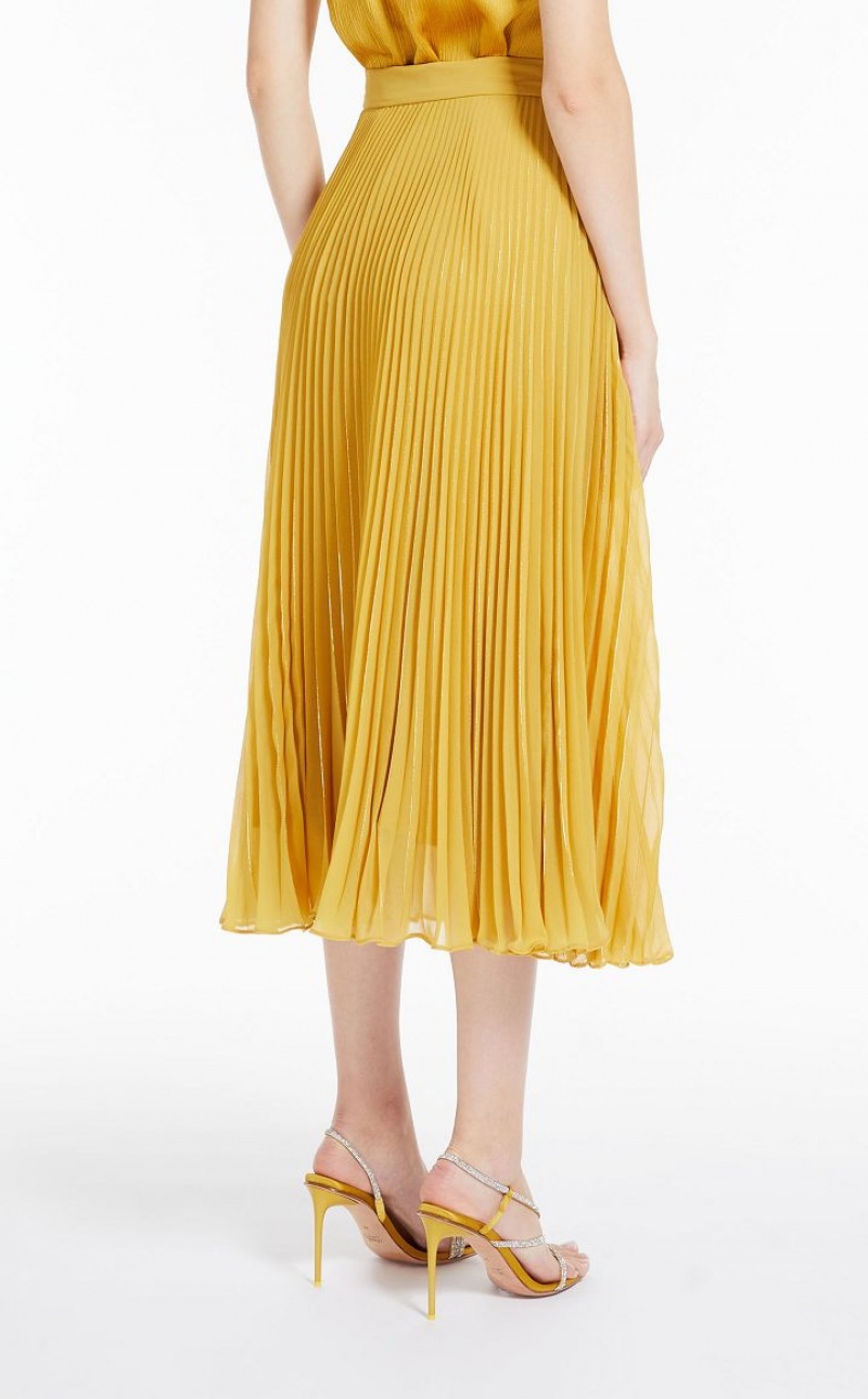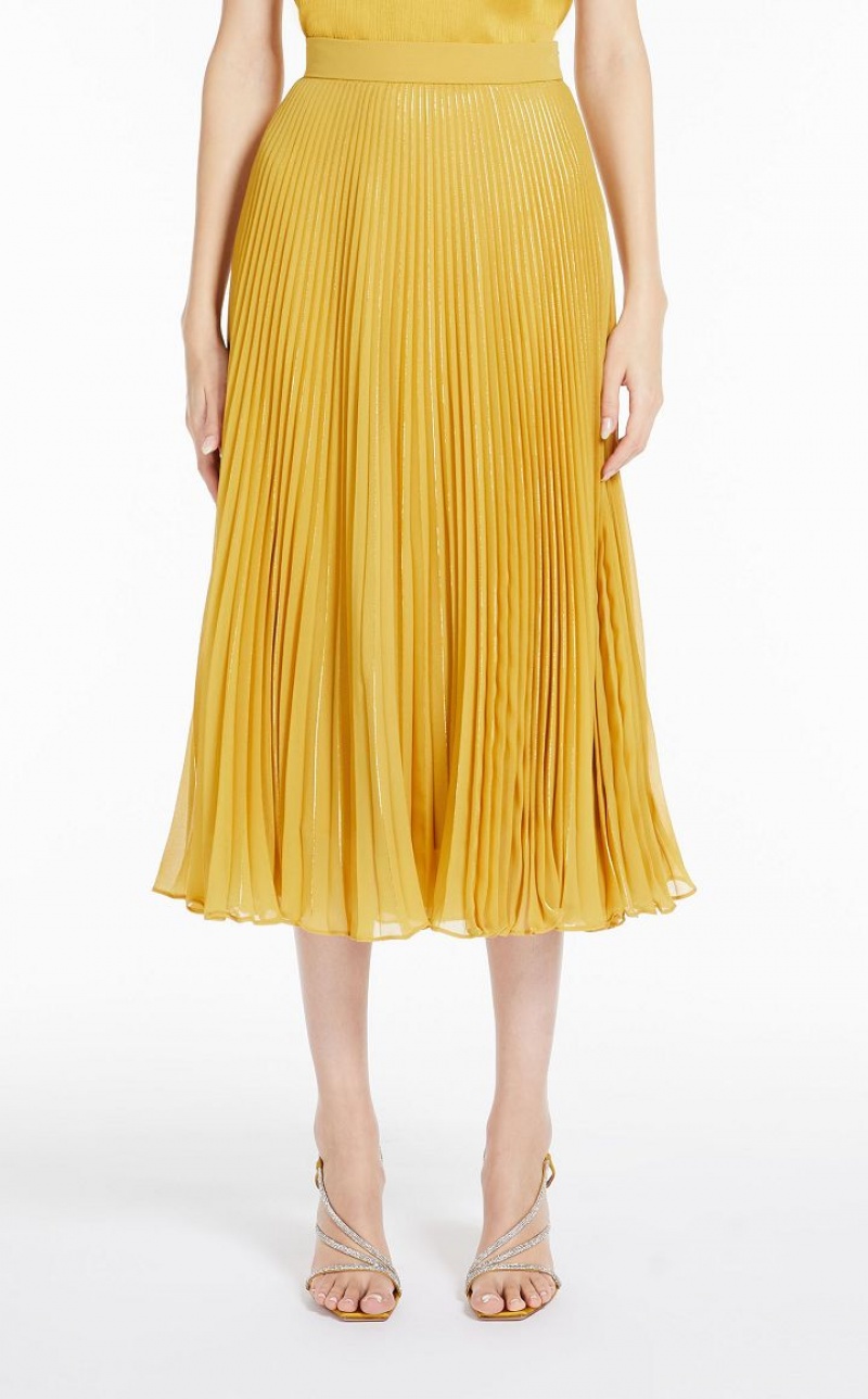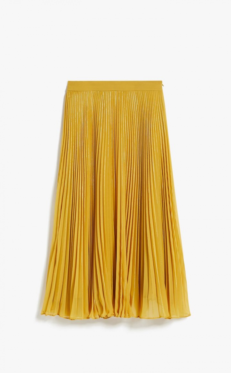Long flared skirt in fine pleated georgette fabric featuring a fabric waistband. Side zip fastening. Lined model. Length: 80 cm.