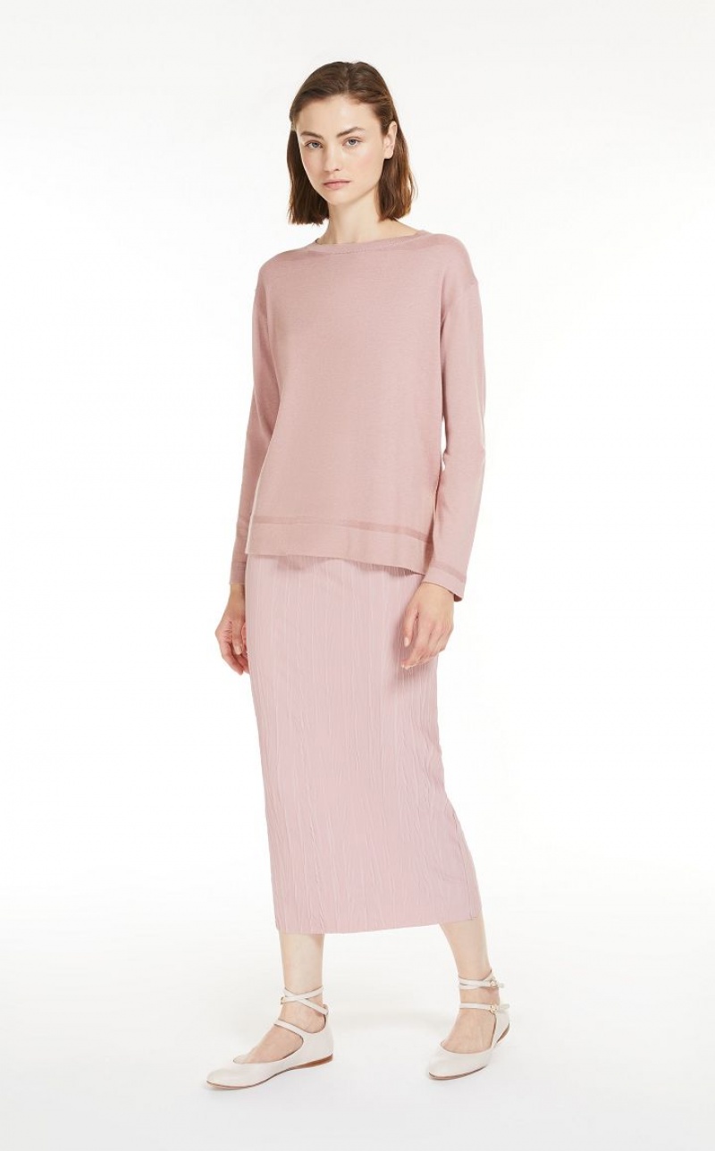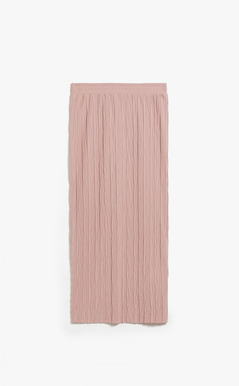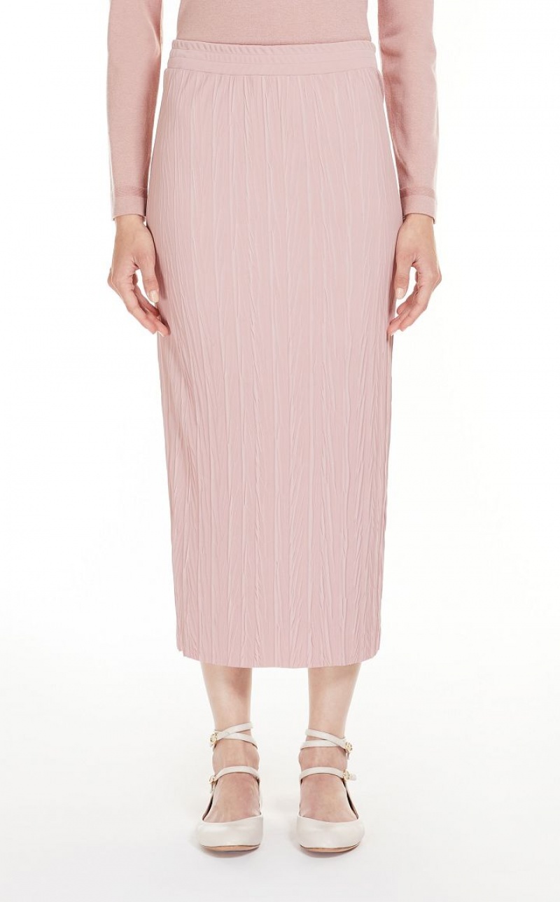 Midi skirt in two way stretch jersey fabric featuring bark look vertical pleat detail. The model boasts an ultra feminine pencil silhouette, in addition to an elasticated waistband for added comfort.