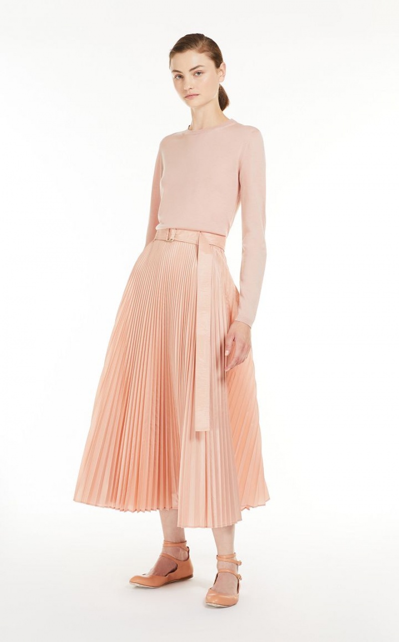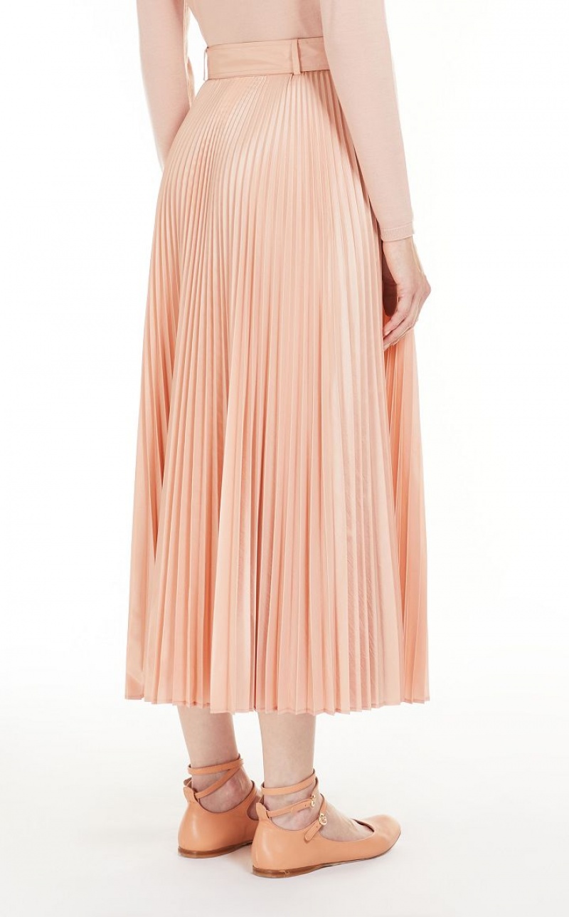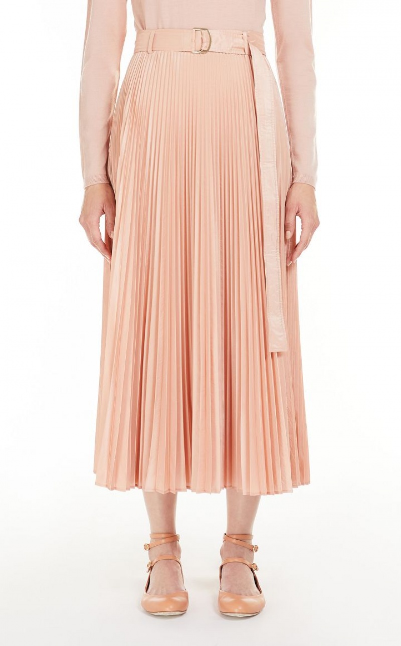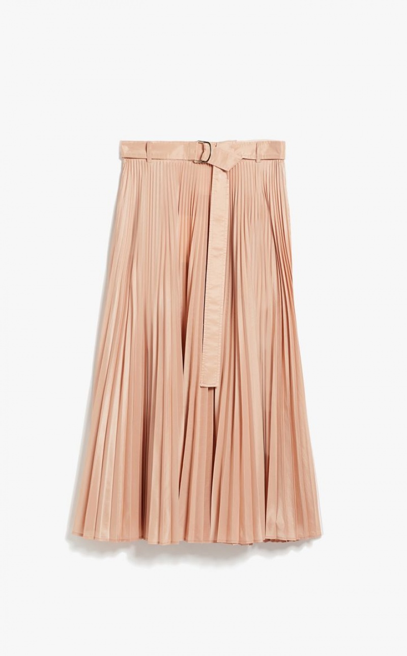 Long flared skirt made of fine yarn-dyed silk-blend fabric. The technical texture is enriched by an elegant, pleated pattern that gives the garment a flowing form. Unlined style, finished with zip pockets on the sides and belt to tie at the waist with metal ring buckle. Length: 85 cm.