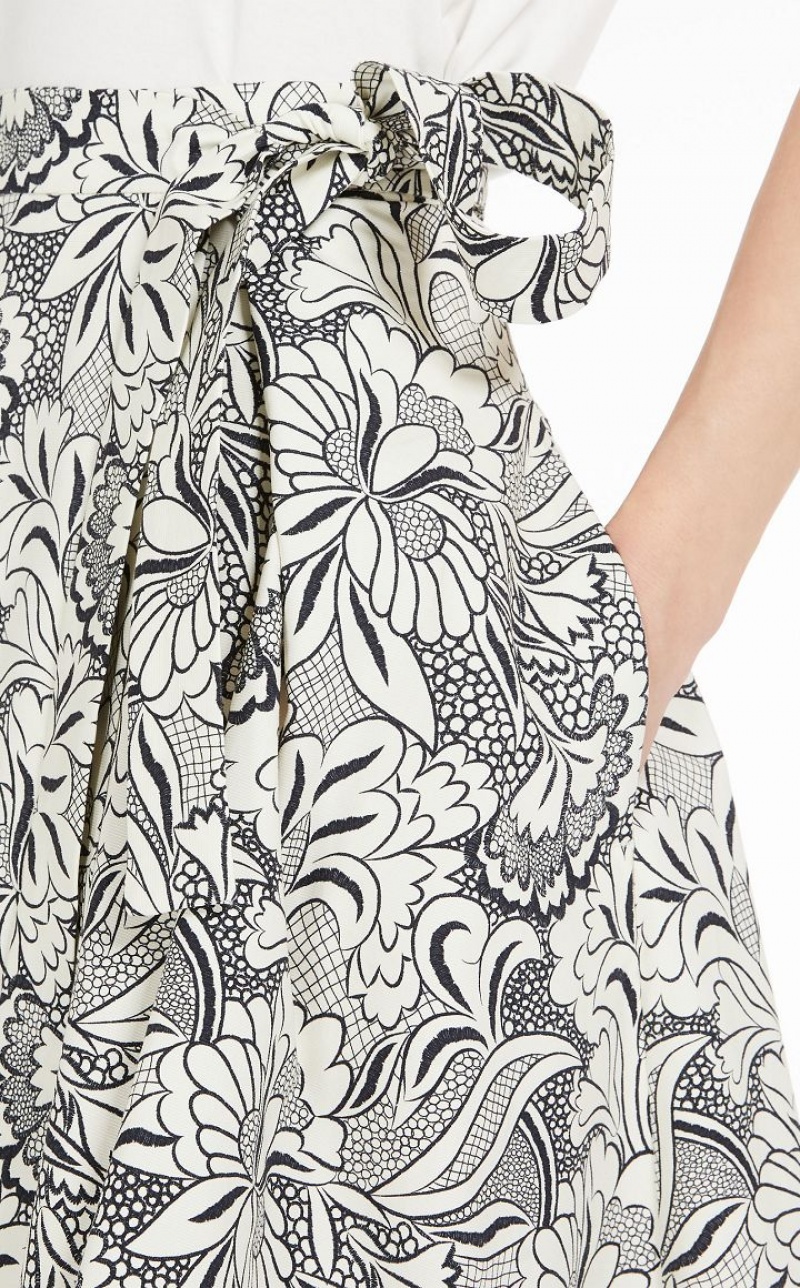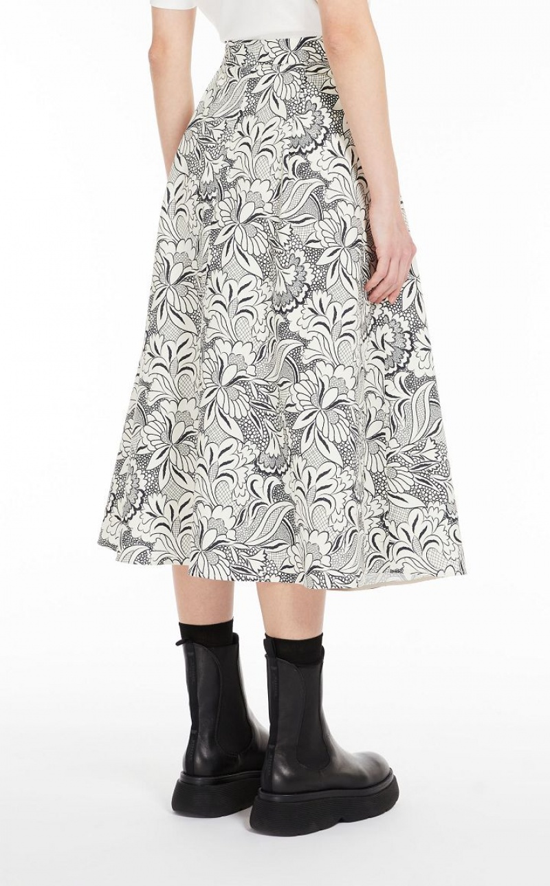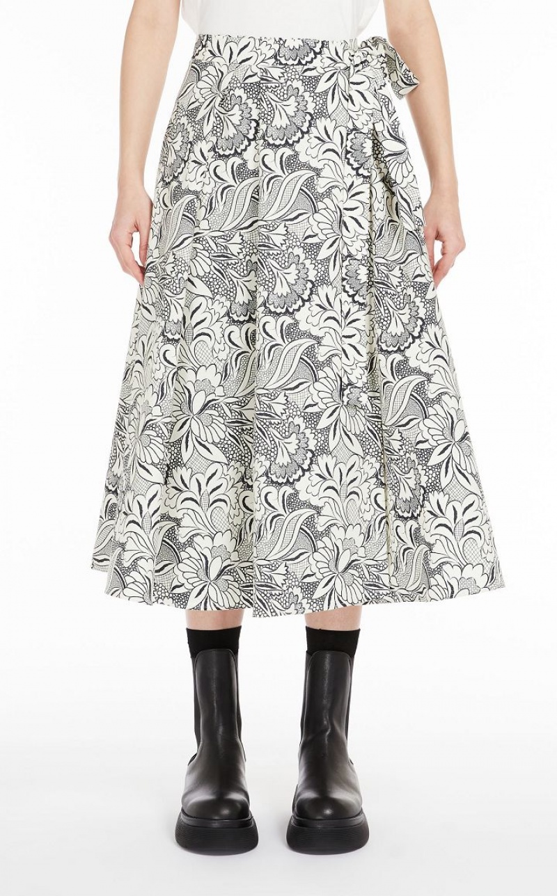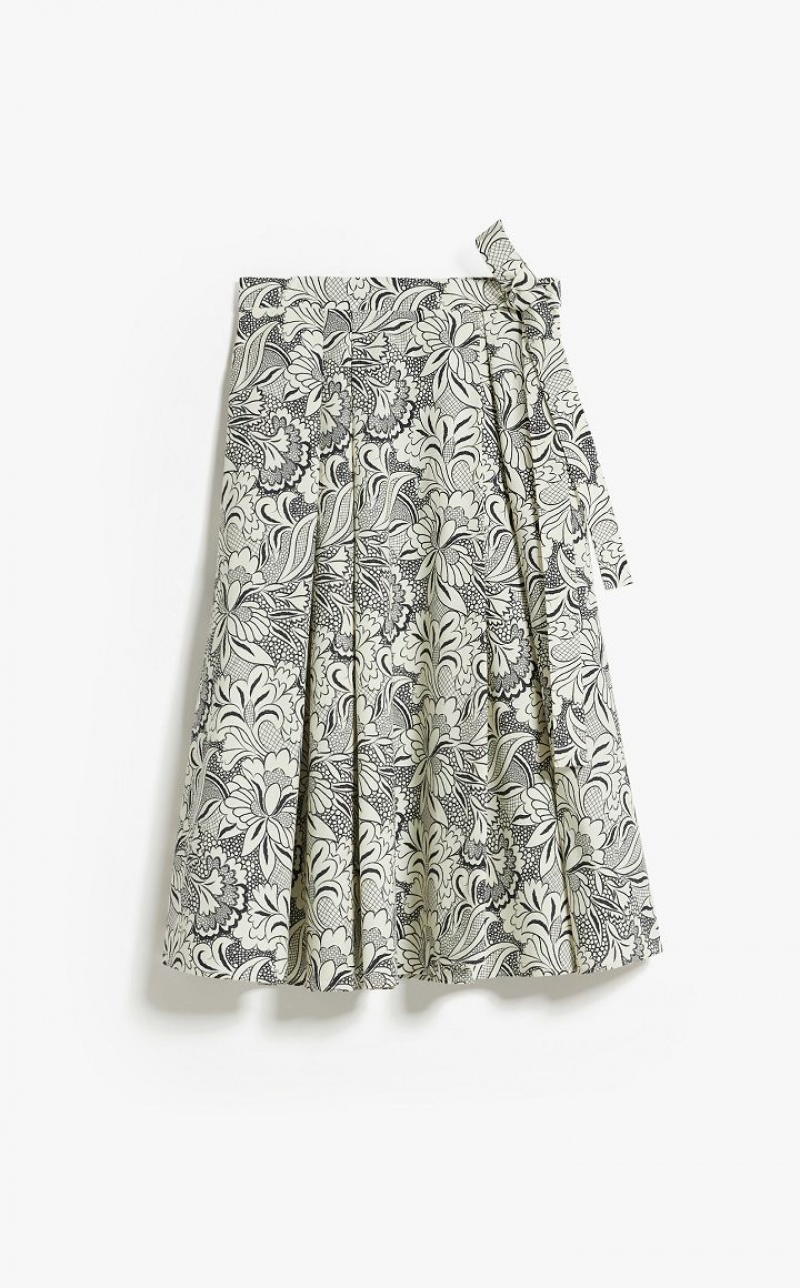 Wrap skirt in lightweight stretch cotton faille with all-over printed motif. Loose volume style emphasised by the pleating on the front, trimmed with side pockets and sash belt tied on the side to accentuate the waist. Side fastening. Length: 80 cm.