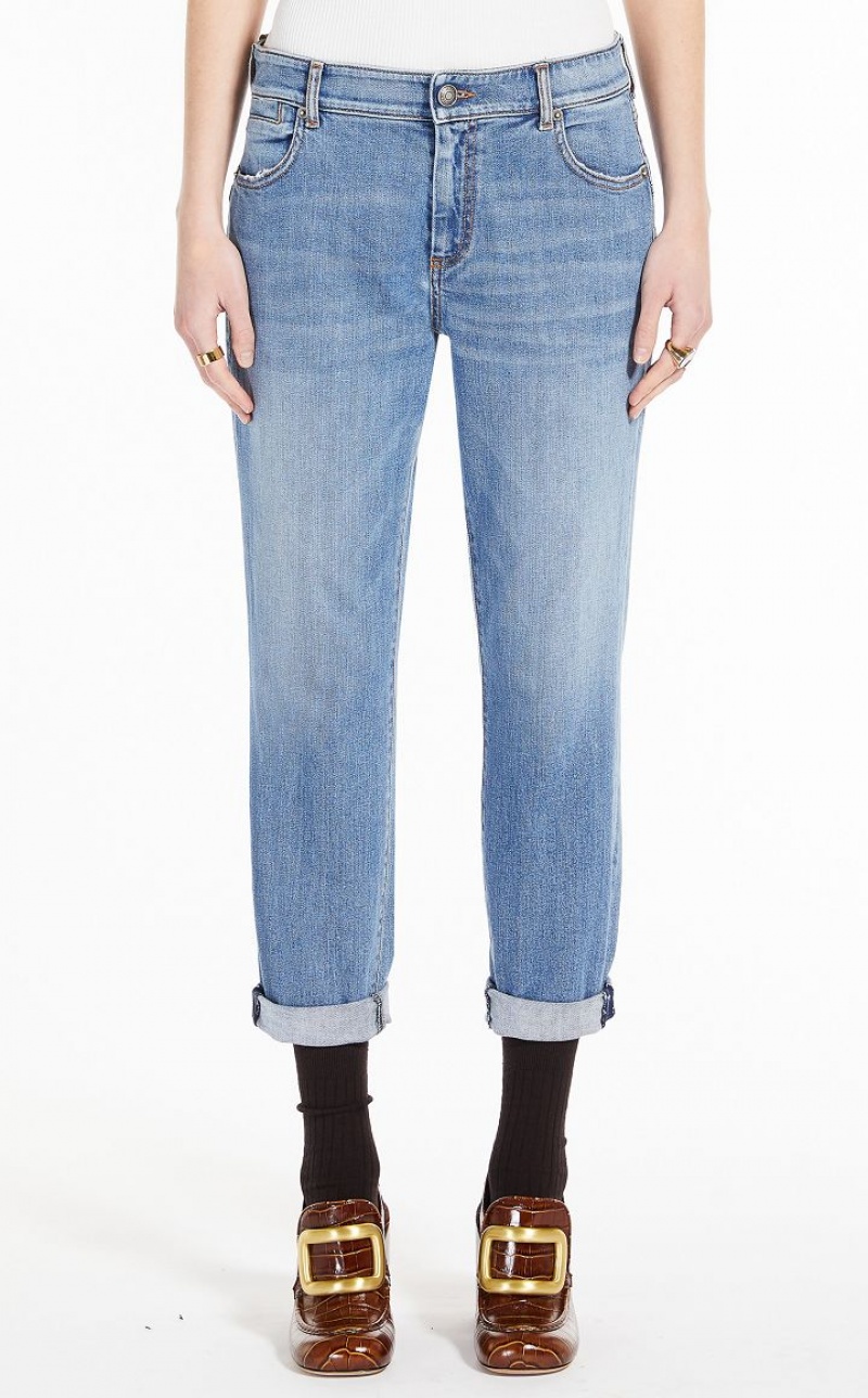 Five-pocket jeans in indigo stretch denim, garment processed with a gently vintage, dark treatment. Cigarette cut, low waist and turn-ups at the ankle. The whole garment features contrasting stitching with tobacco-coloured thread.