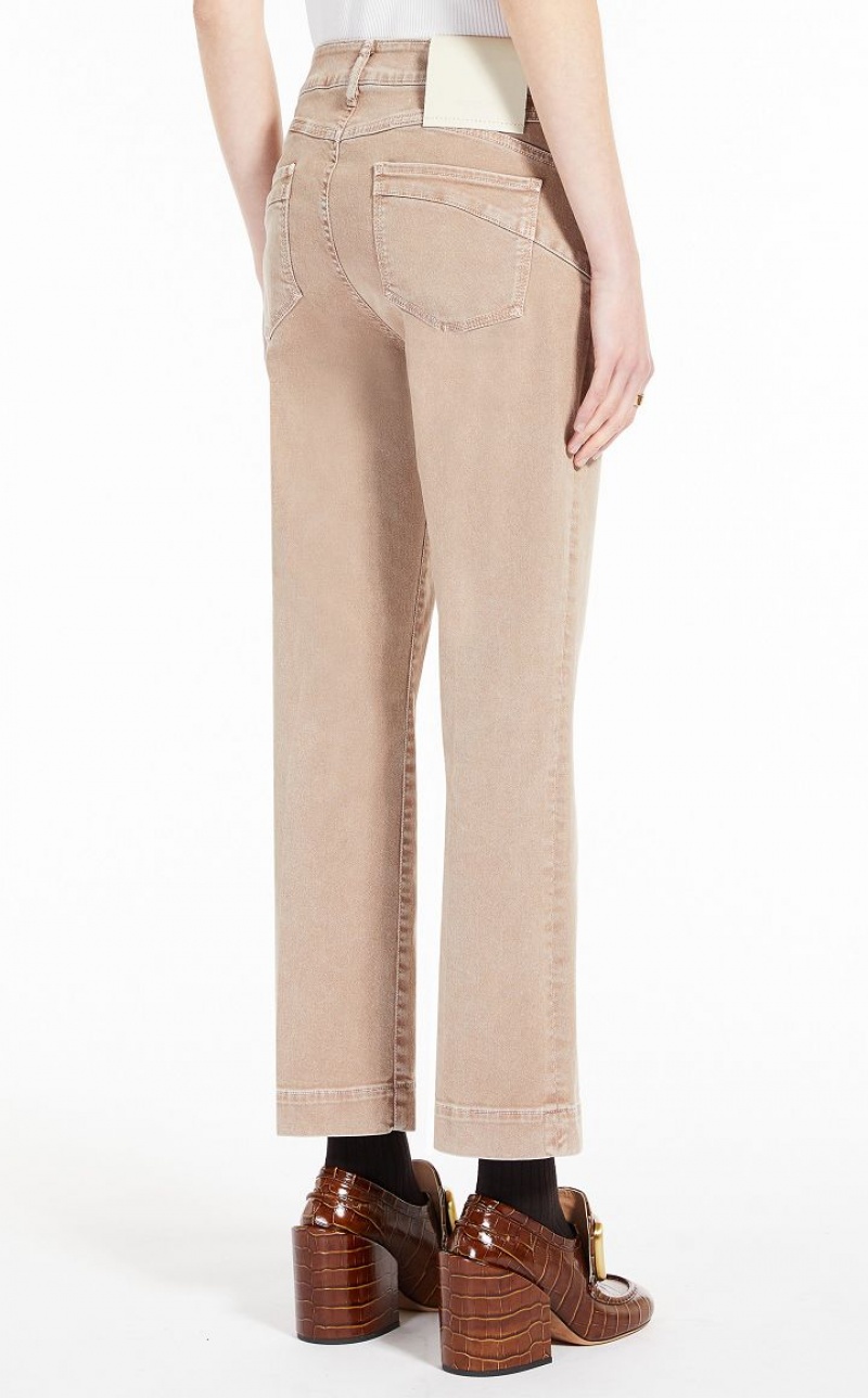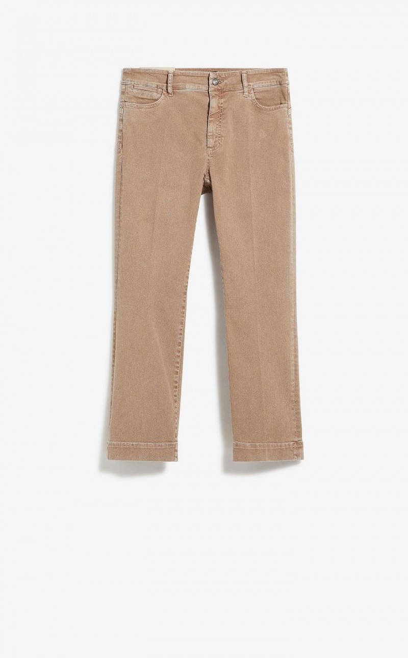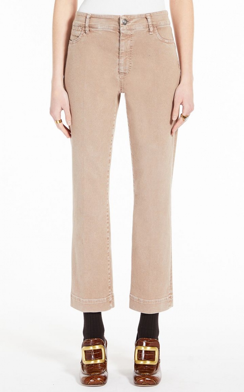 Garment-dyed stretch denim jeans featuring a slightly flared hem. Low rise with a metal tack button fastening. Pressed pleat on the front and back of the legs.