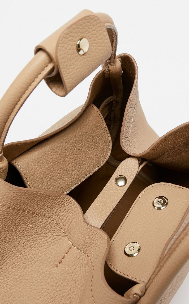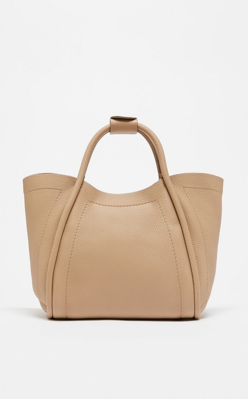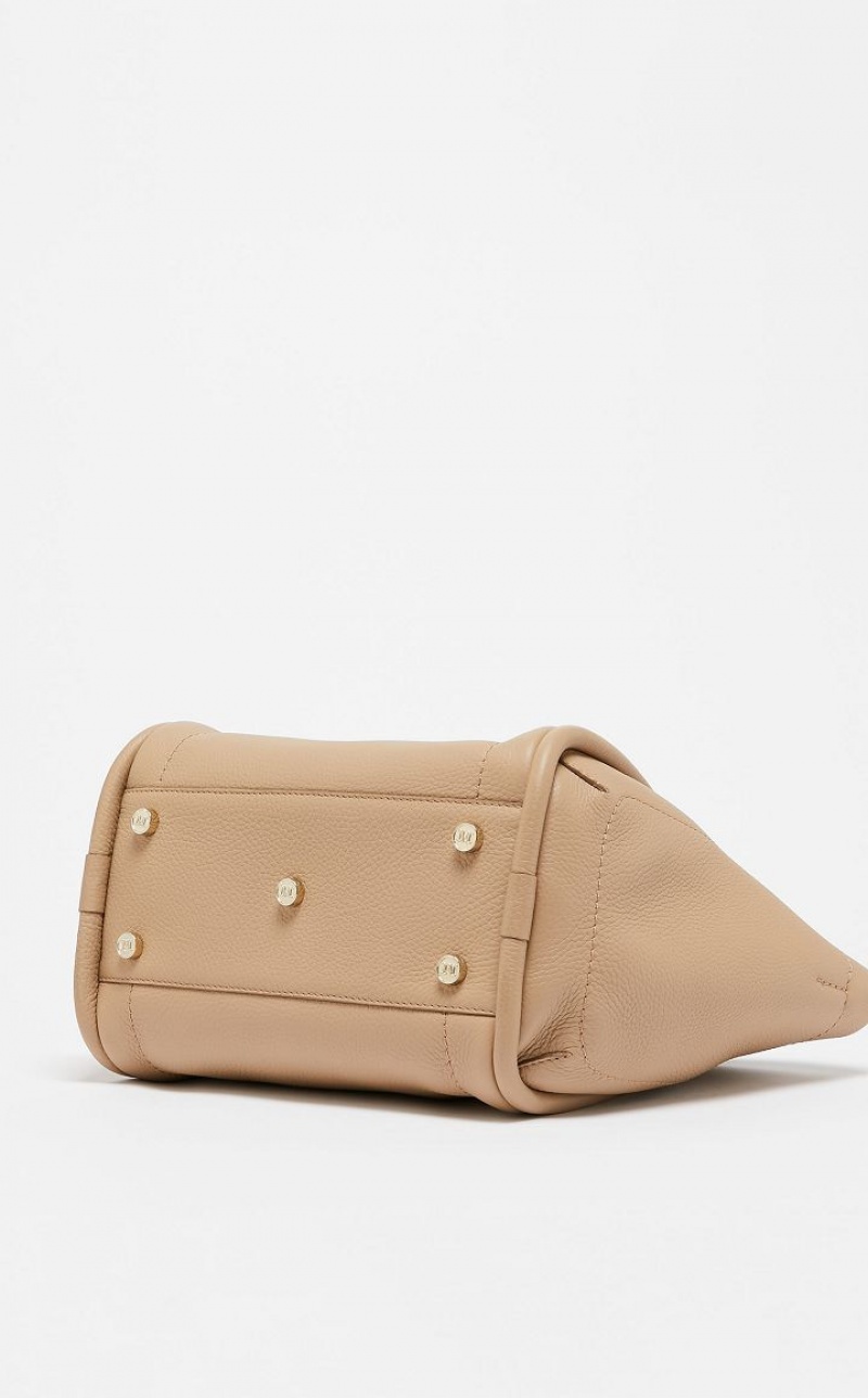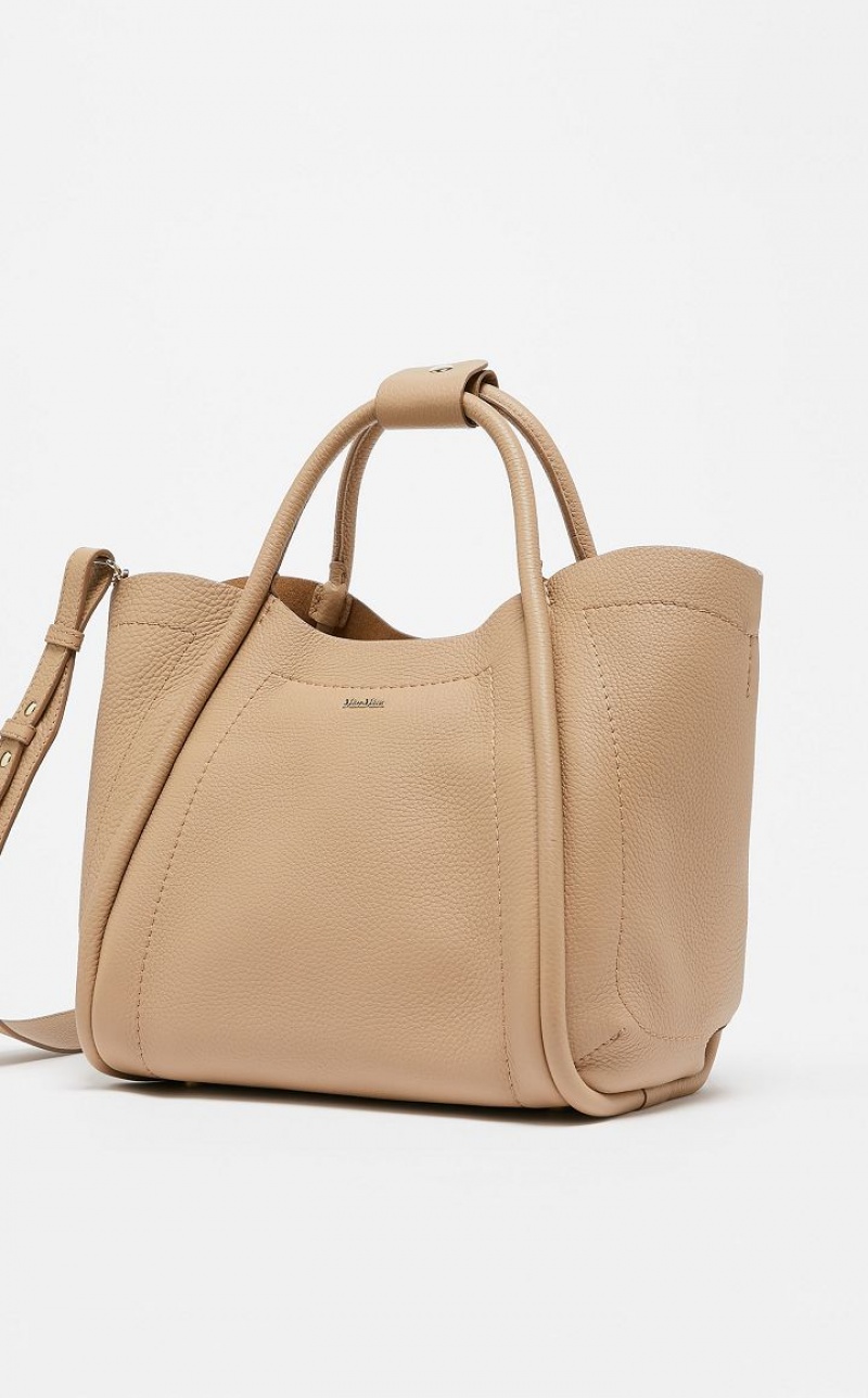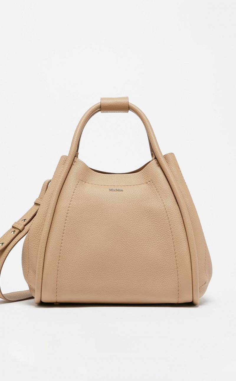 Marine S bag in tumbled calfskin with its characteristic natural texture. A rounded shape and generous dimensions make this exclusive creation stand out, enhancing its versatility. The iconic tubular handles and the adjustable strap with snap buttons allow it to be carried by hand or on the shoulder. Unlined, double fabric bonded effect, with two large pockets on the sides of the inner shell, one flat and the other with zip. Structured and soft, it is finished with long