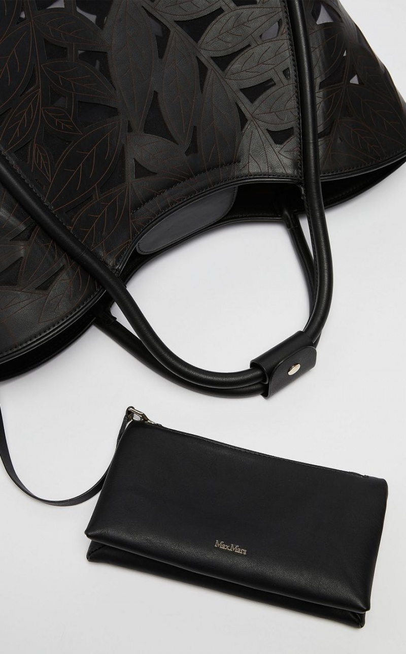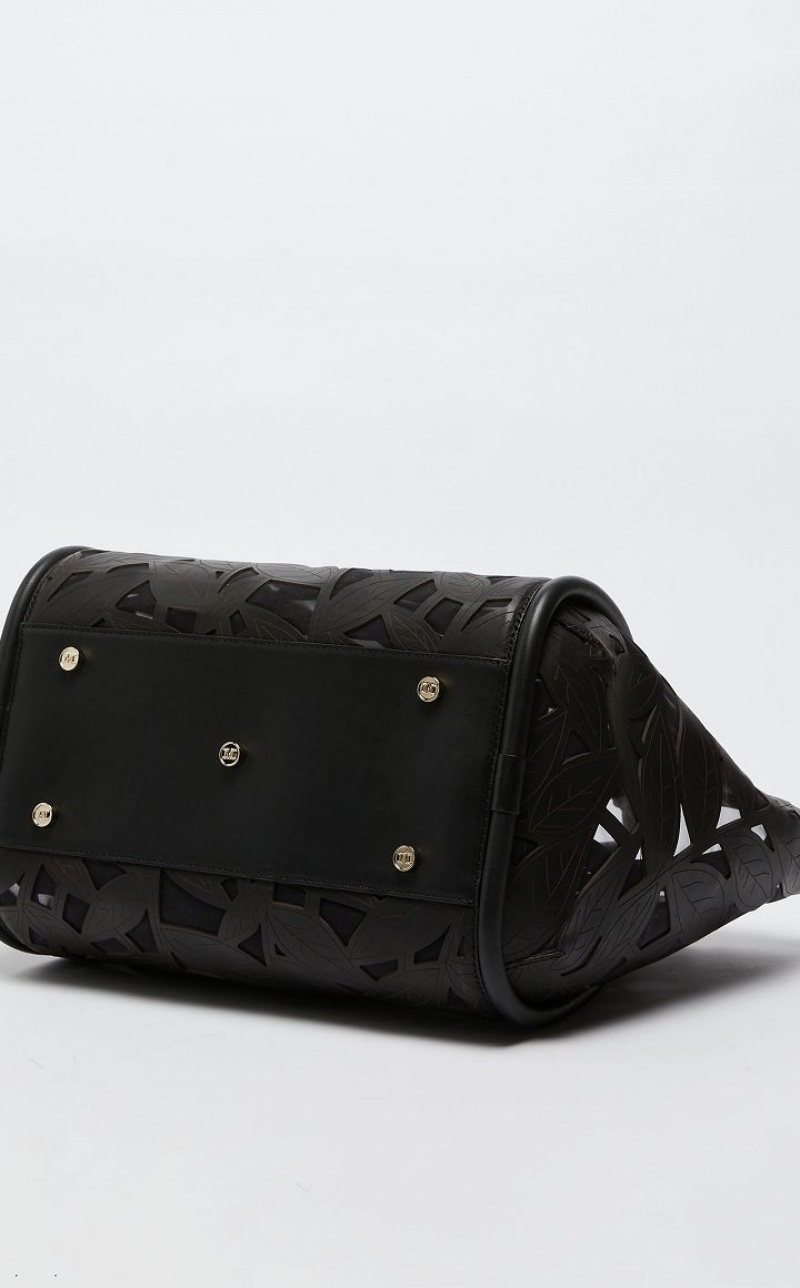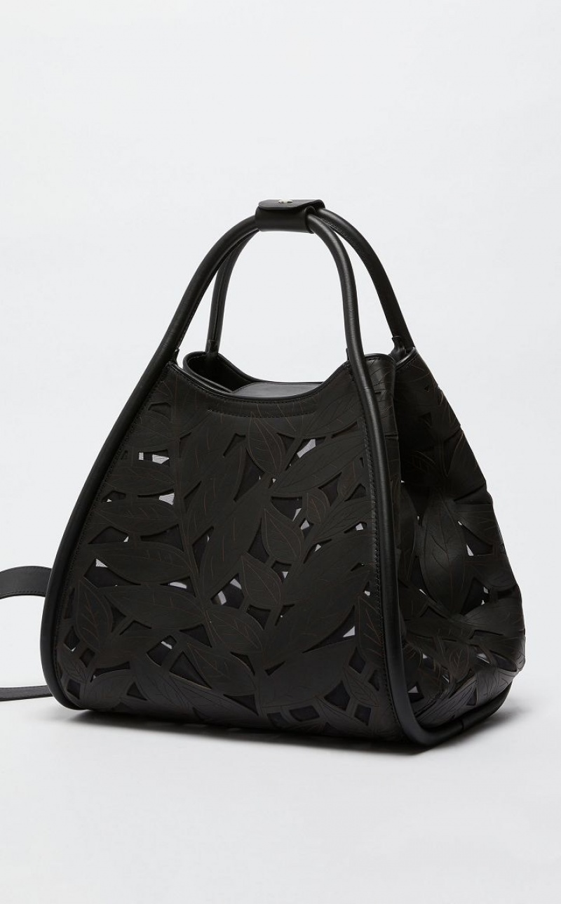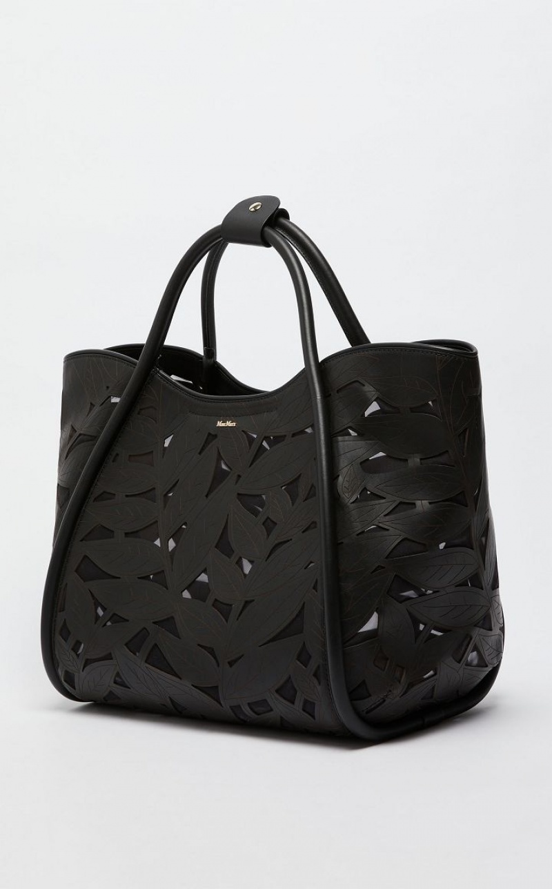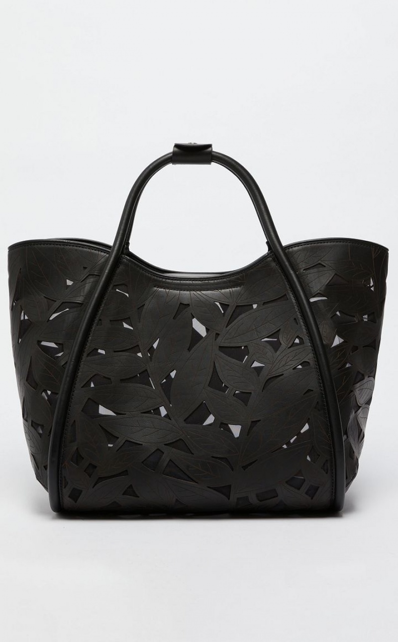 Marine tote bag in carved, laser cut leather with with foliage motif, on a very light mesh base with a see through effect. The style has a double handle, side strap to close the sides and a detachable shoulder strap with internal ring, so it can be carried by hand or on the shoulder. Unlined interior with removable zip pouch. Embellished with metal lettering, leather bottom and metal feet. Measurements: 47 x 26 x 30 cm.