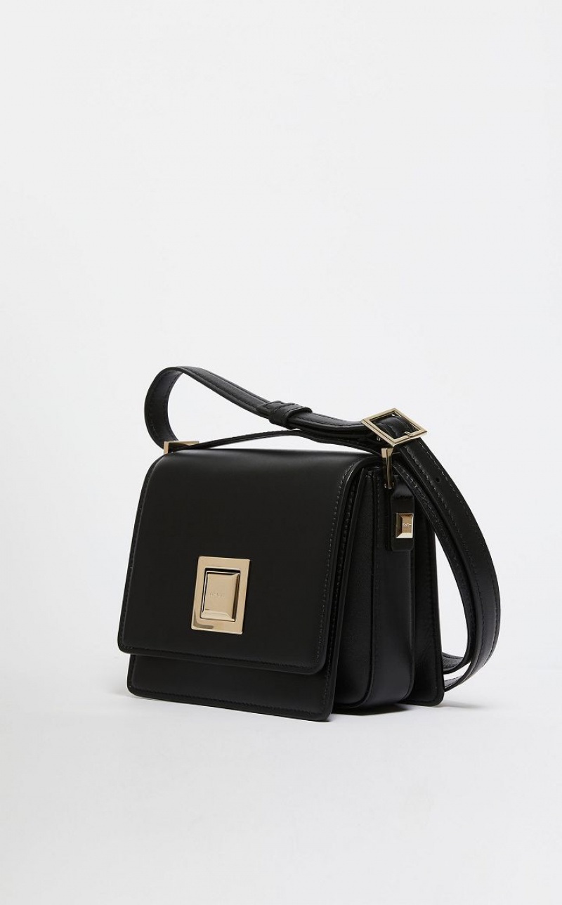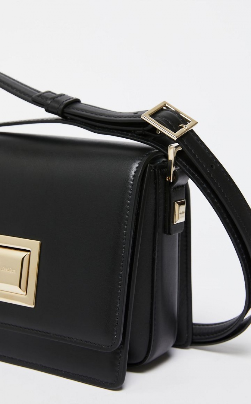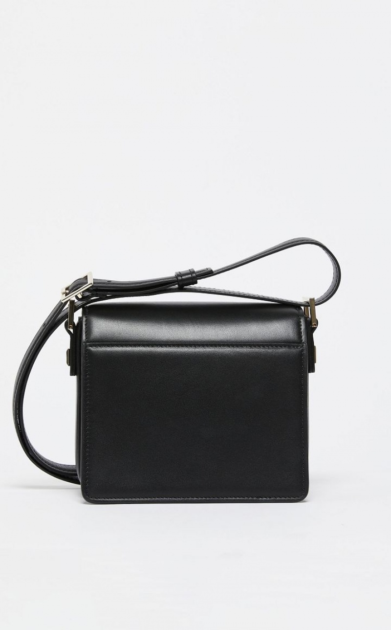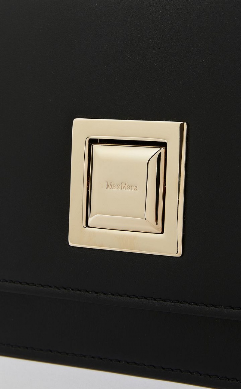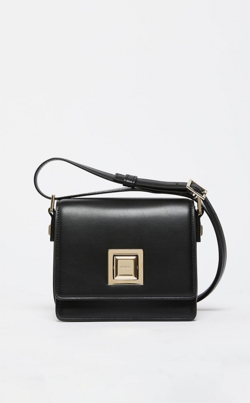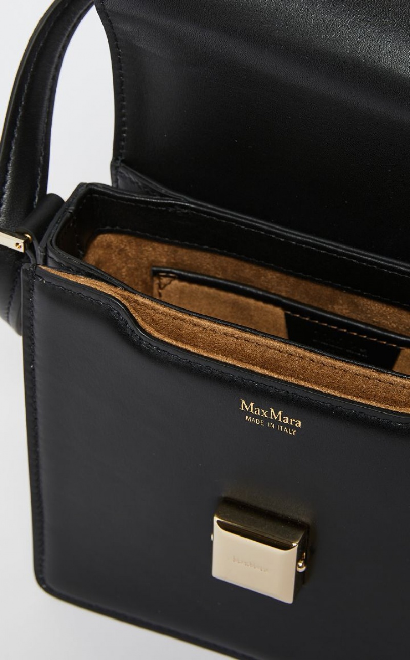 Small MM bag in smooth matte calfskin. The distinctive square shaped design, square models and geometric metal clasp are reminiscent of the Max Mara headquarters’ architecture. The camel coloured suede effect interior is divided into two gusseted compartments with a piped pocket. Complete with an adjustable shoulder strap for on the shoulder or crossbody wear. Button fastening. Size: 18 x 9 x 18 cm.