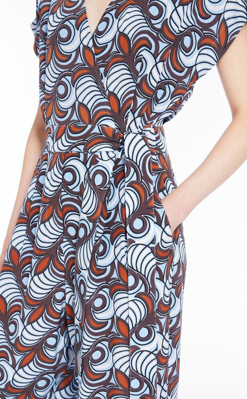 Elegant jumpsuit with crossover V neck in a luxe pure silk crepe de chine. The silhouette features wide-leg trousers and small kimono sleeves, with slanted pockets on the sides and a matching belt to emphasise the waist.