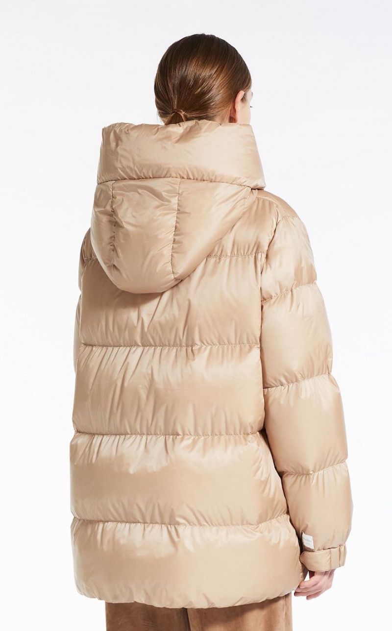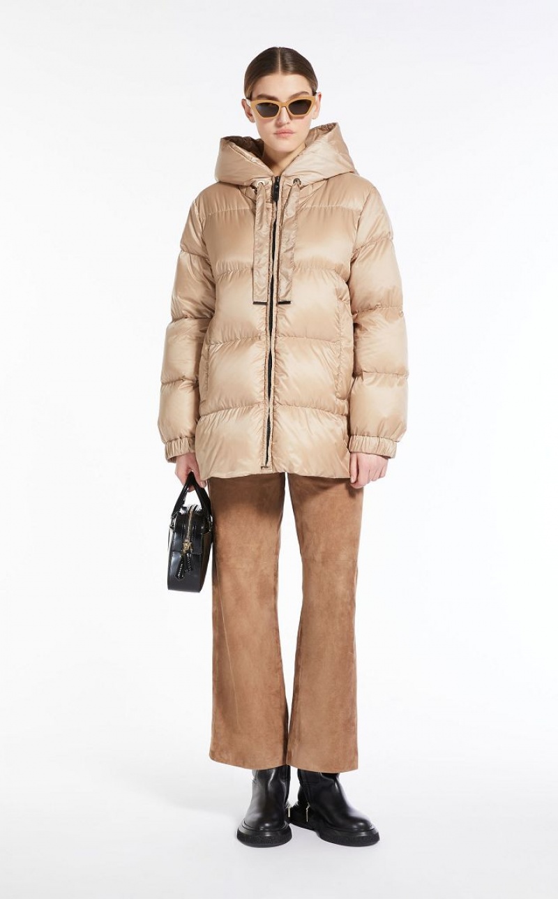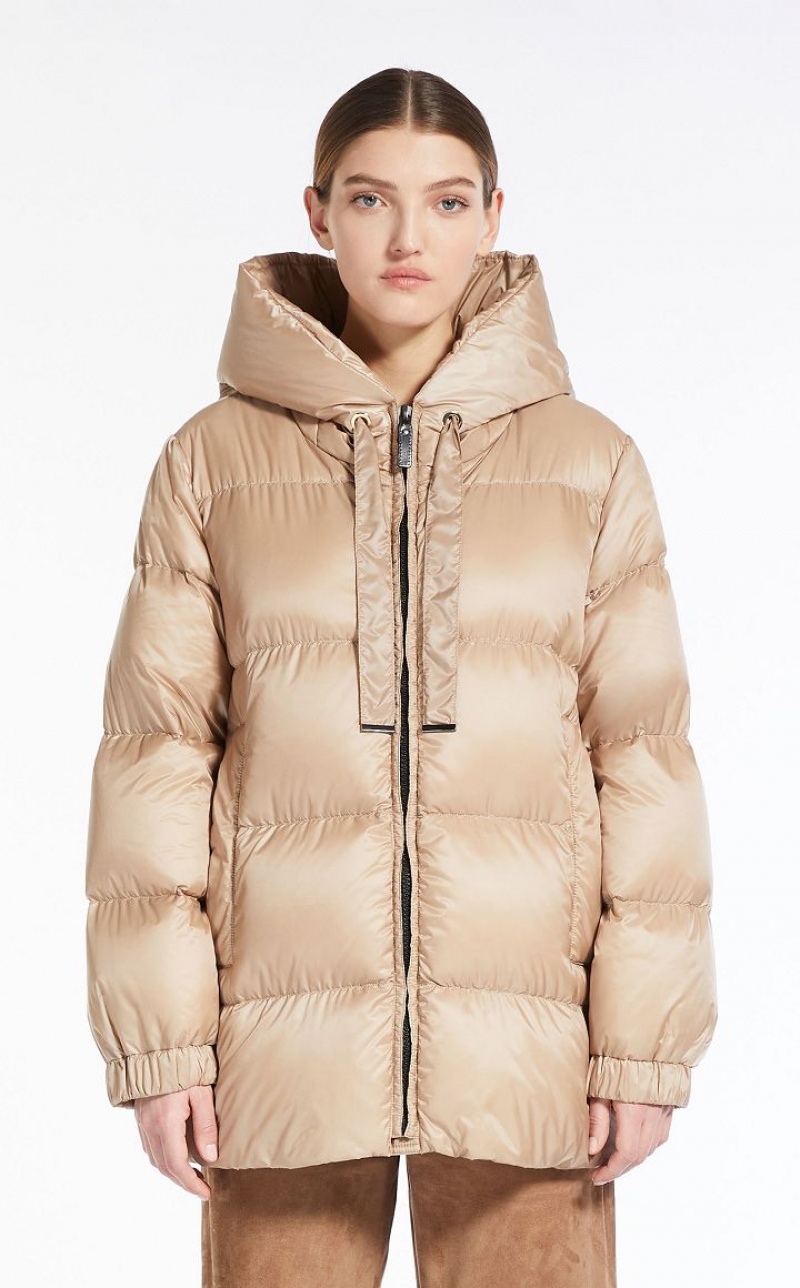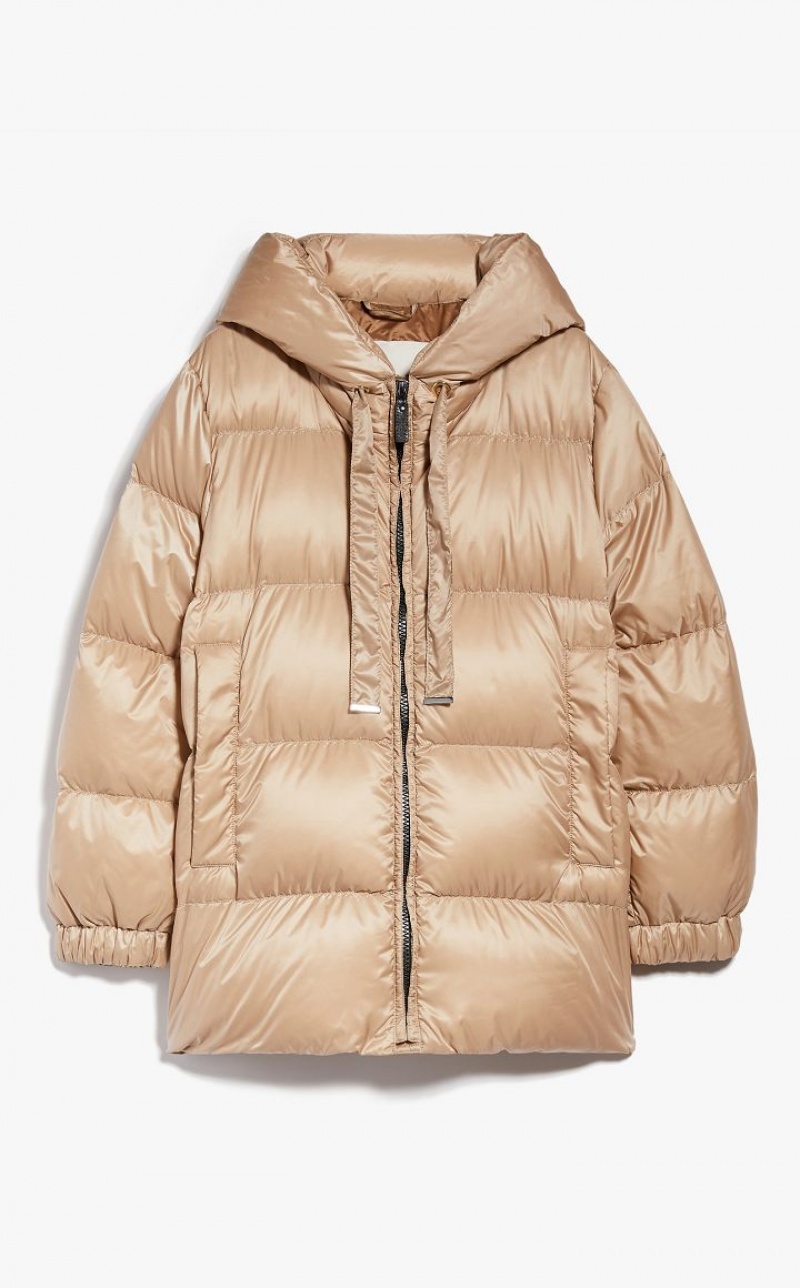 Short goose down jacket made of Upcycling water-resistant technical canvas, with a horizontal quilted pattern and drawstring hood with metal ends. The style is finished with side welt pockets and elasticated cuffs. Zip fastening and leather slider. Length: 74 cm.