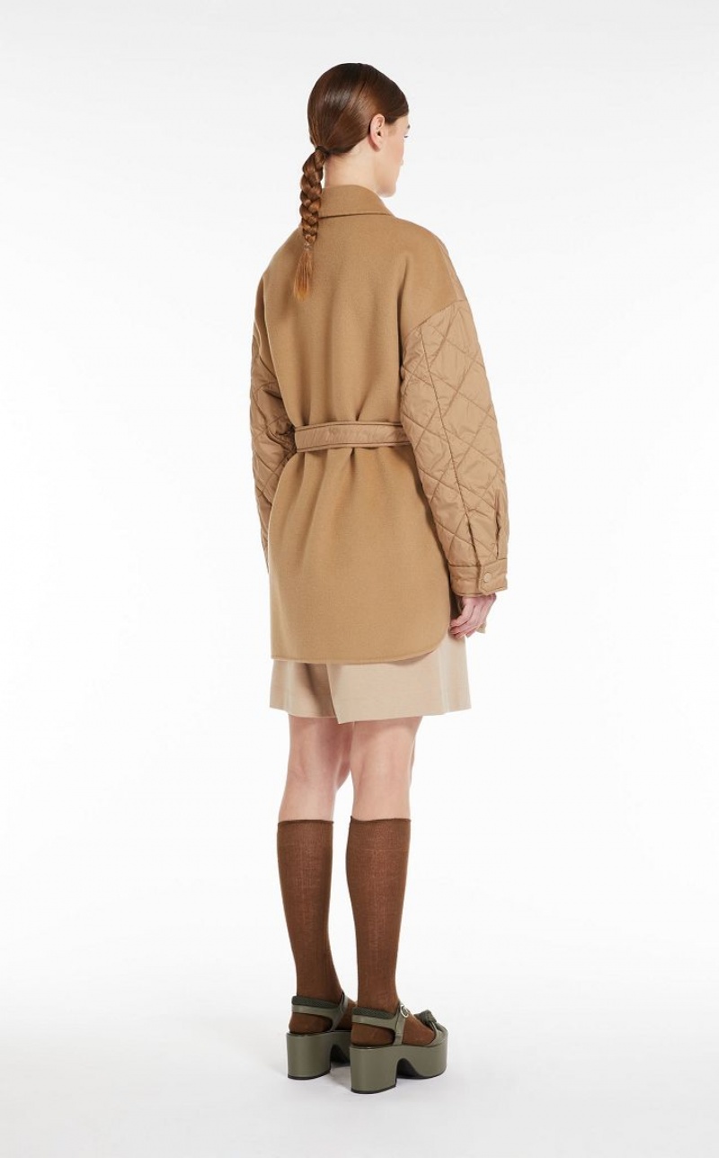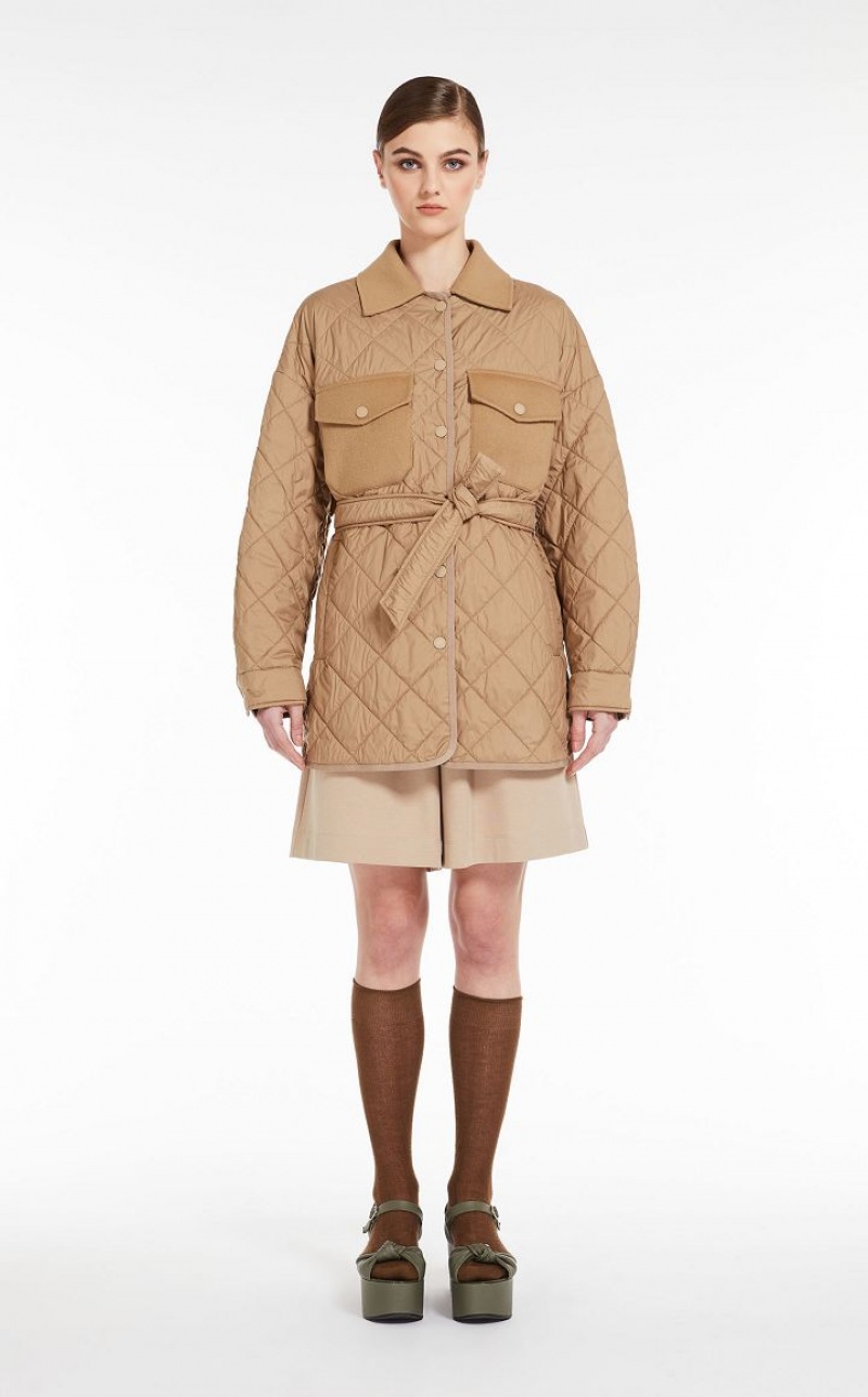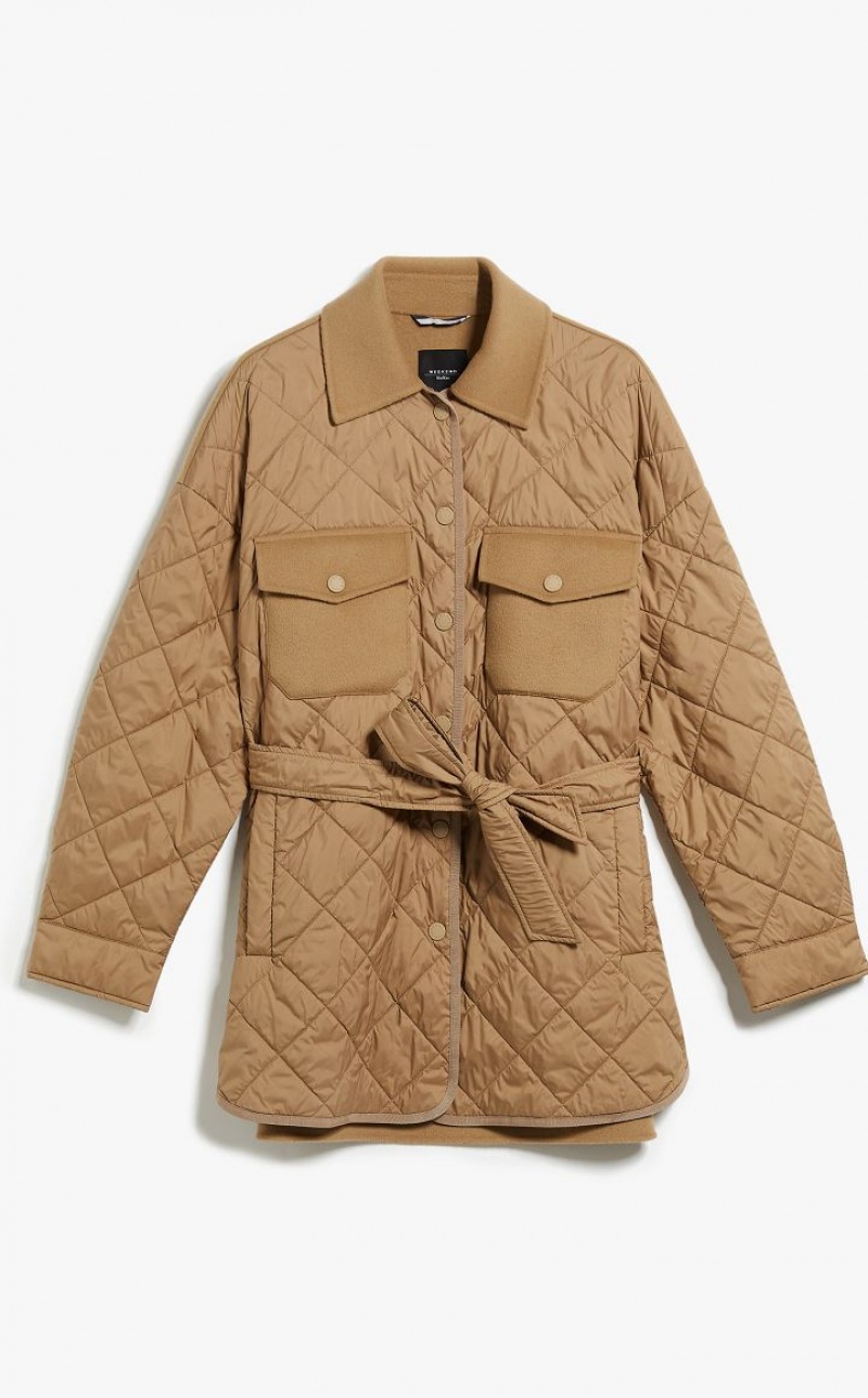 Shirt-style jacket in technical fabric with diamond quilting on the front and an insert in luxe hand-sewn double-layer wool fabric on the back. Maxi patch pockets with flap on the front, side pockets, long sleeves with cuffs and rounded hem. Front fastening with press studs and matching belt to emphasise the waistline.