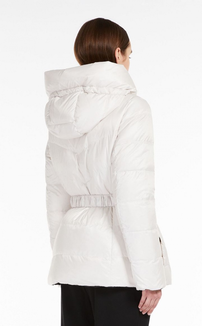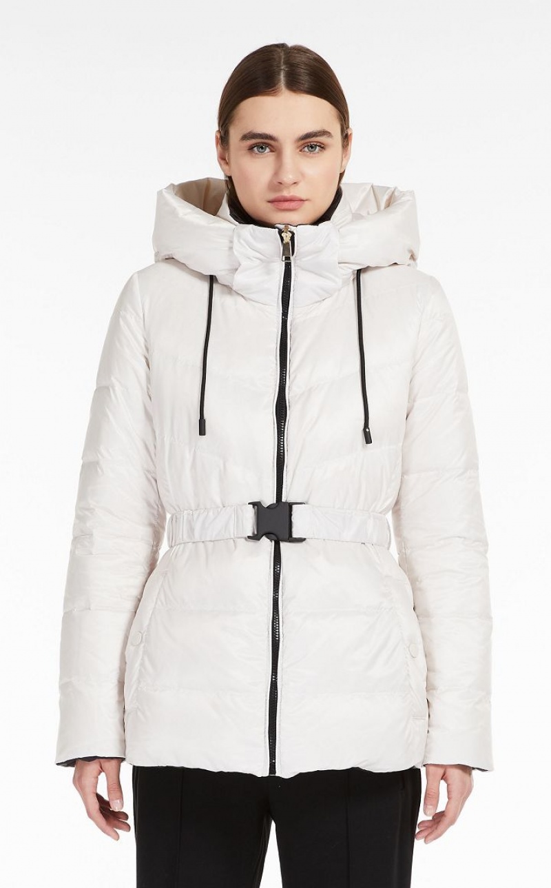 Reversible down jacket in water repellent canvas featuring 80 g goose down padding. Removable hood embellished collar, long sleeves, press stud fastening welt pockets and an elasticated waist belt, complete with a side release buckle. The garment comes with a second smooth fabric belt. Concealed zip fastening. Length: 70 cm.