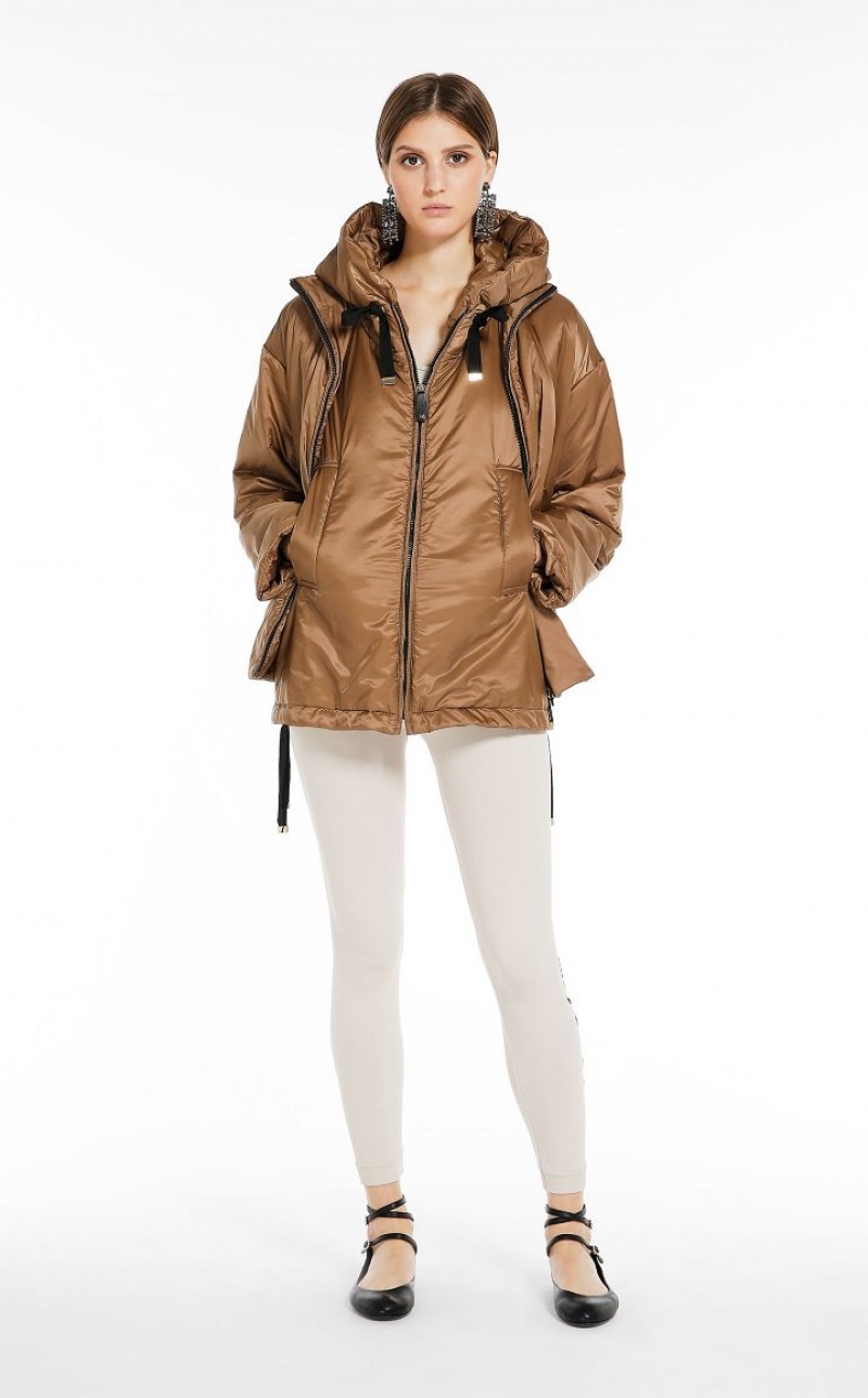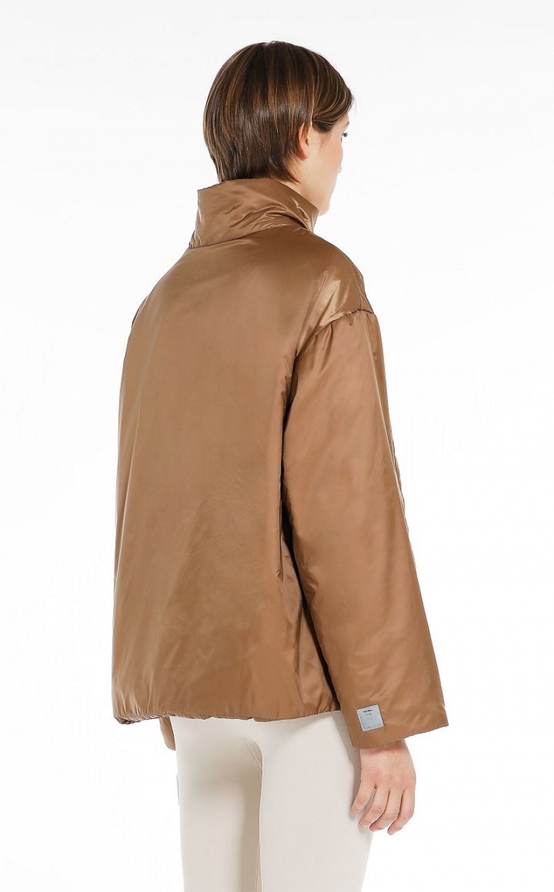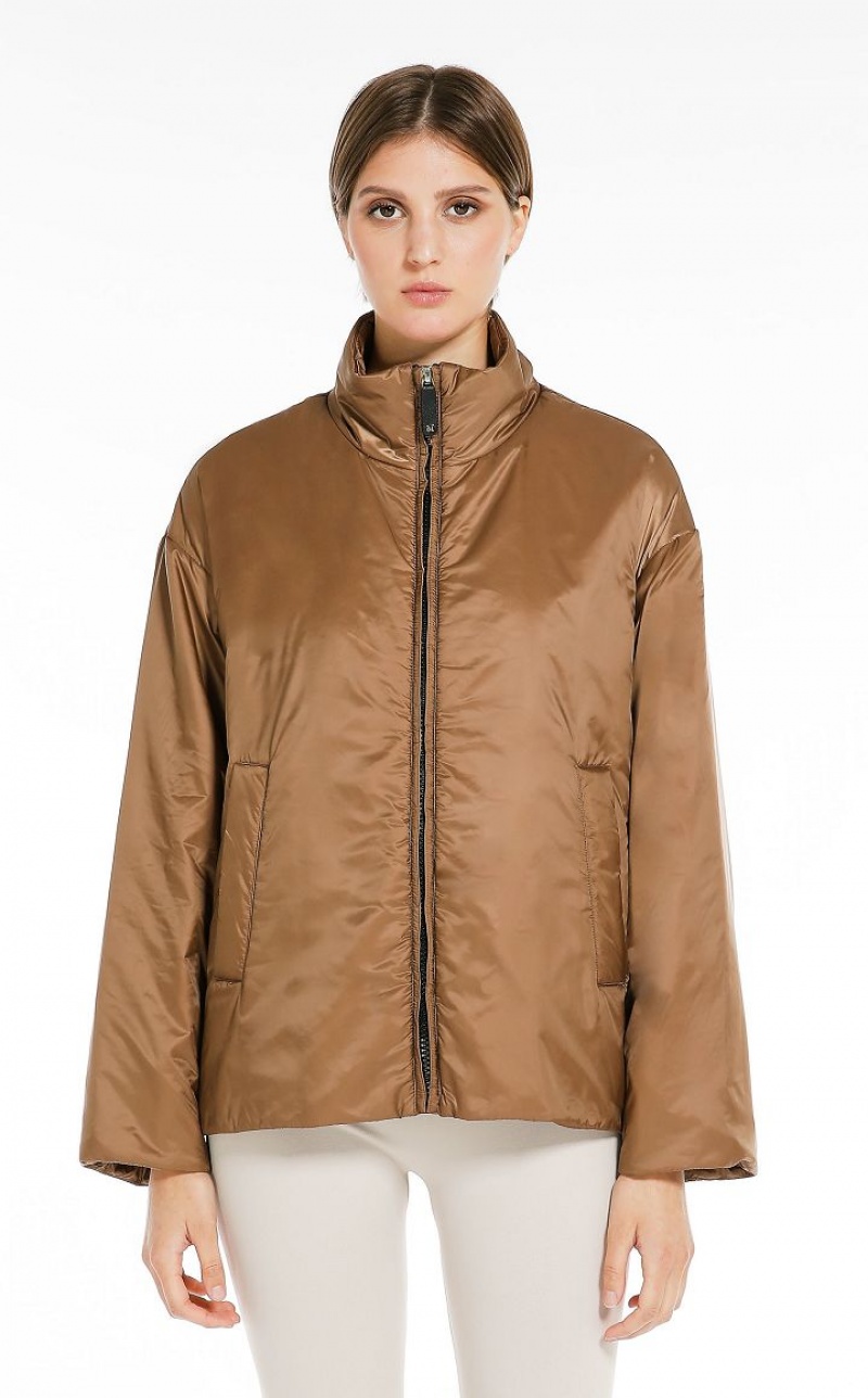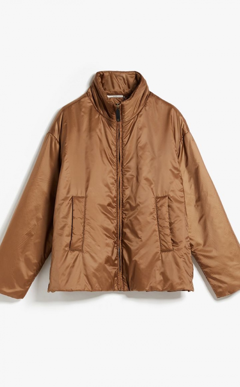Short padded jacket in water-repellent technical canvas featuring a high collar and metal press stud-fastening side slits. Welt front pockets. Zip fastening. The Cameluxe padding sets the garment apart: a new frontier as far as upcycling processes are concerned, since any surplus material leftover from the process of cutting the pure camel fabrics for our legendary coats, is recovered. These pieces of fabric are then reused to create a special padding material that boasts the same insulating properties as virgin materials, without needing to use any more raw materials. Length: 65 cm.
