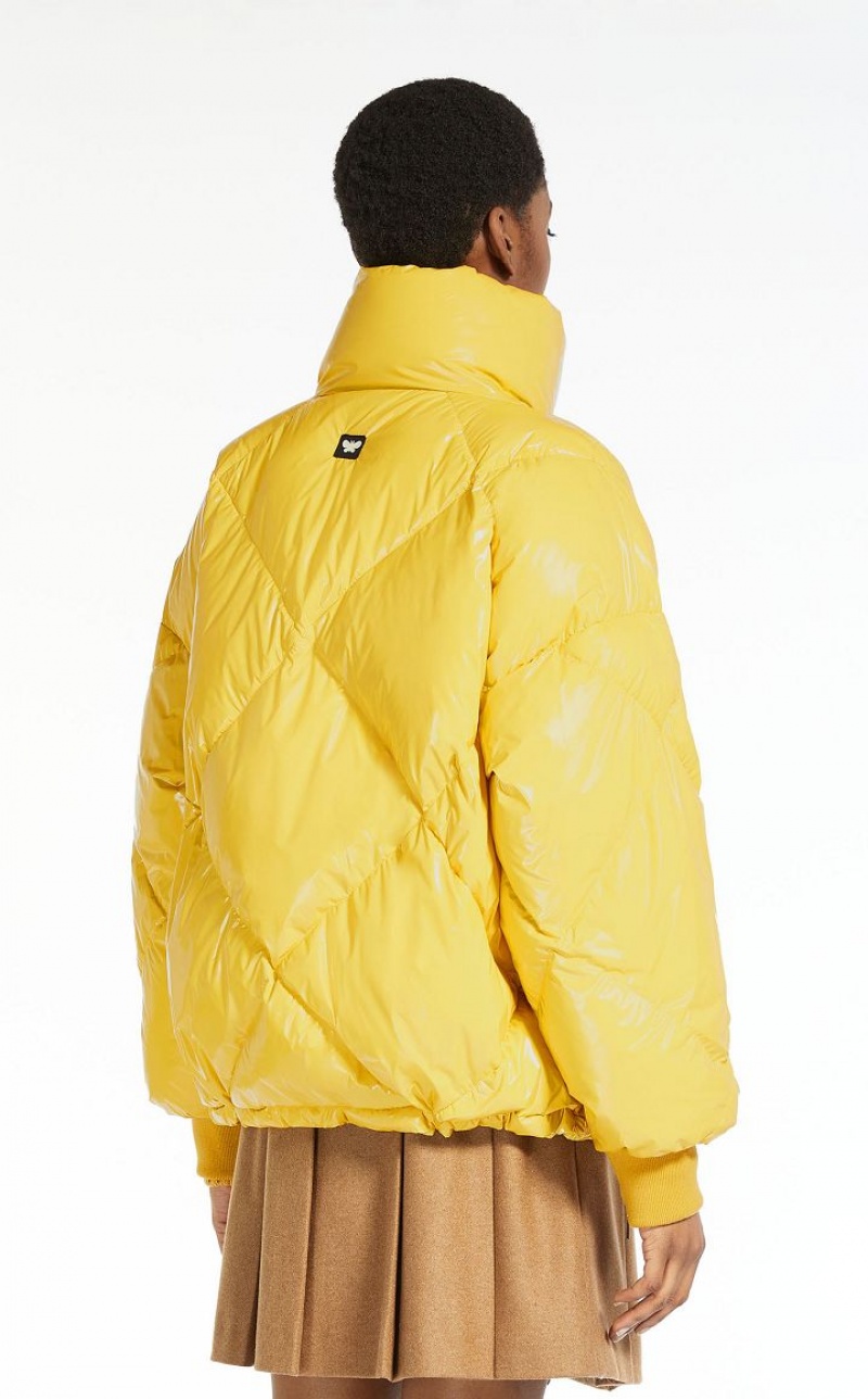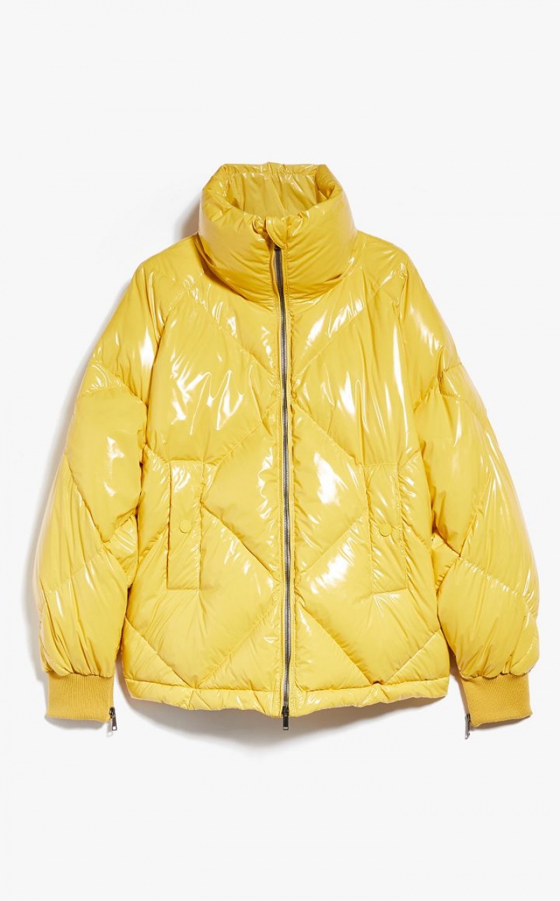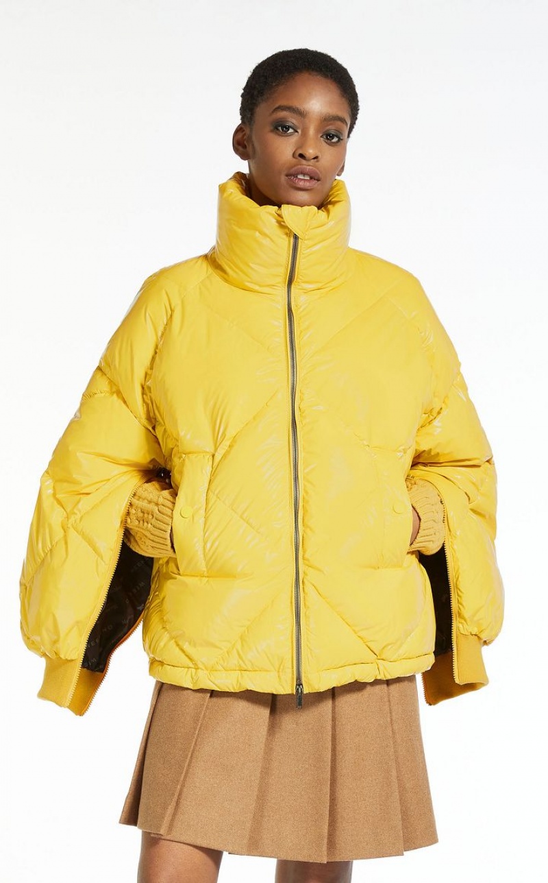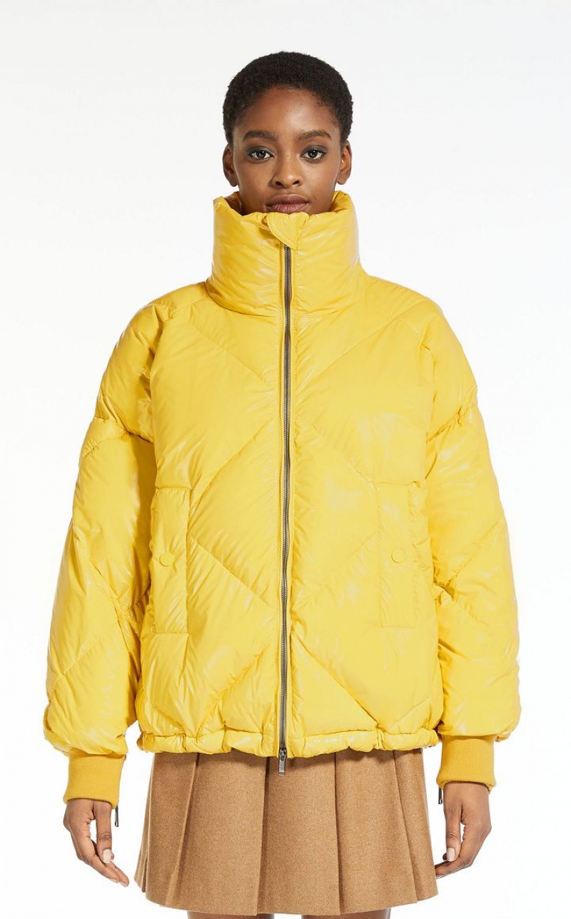 Down jacket in water repellent taffeta fabric featuring 100 g goose down padding. High neck, knitted cuff embellished long sleeves, welt pockets, an adjustable elasticated hem cord and an inner pocket. Volume defining diamond quilting. Zip fastening. Butterfly logo on the back of the collar. Length: 68 cm.