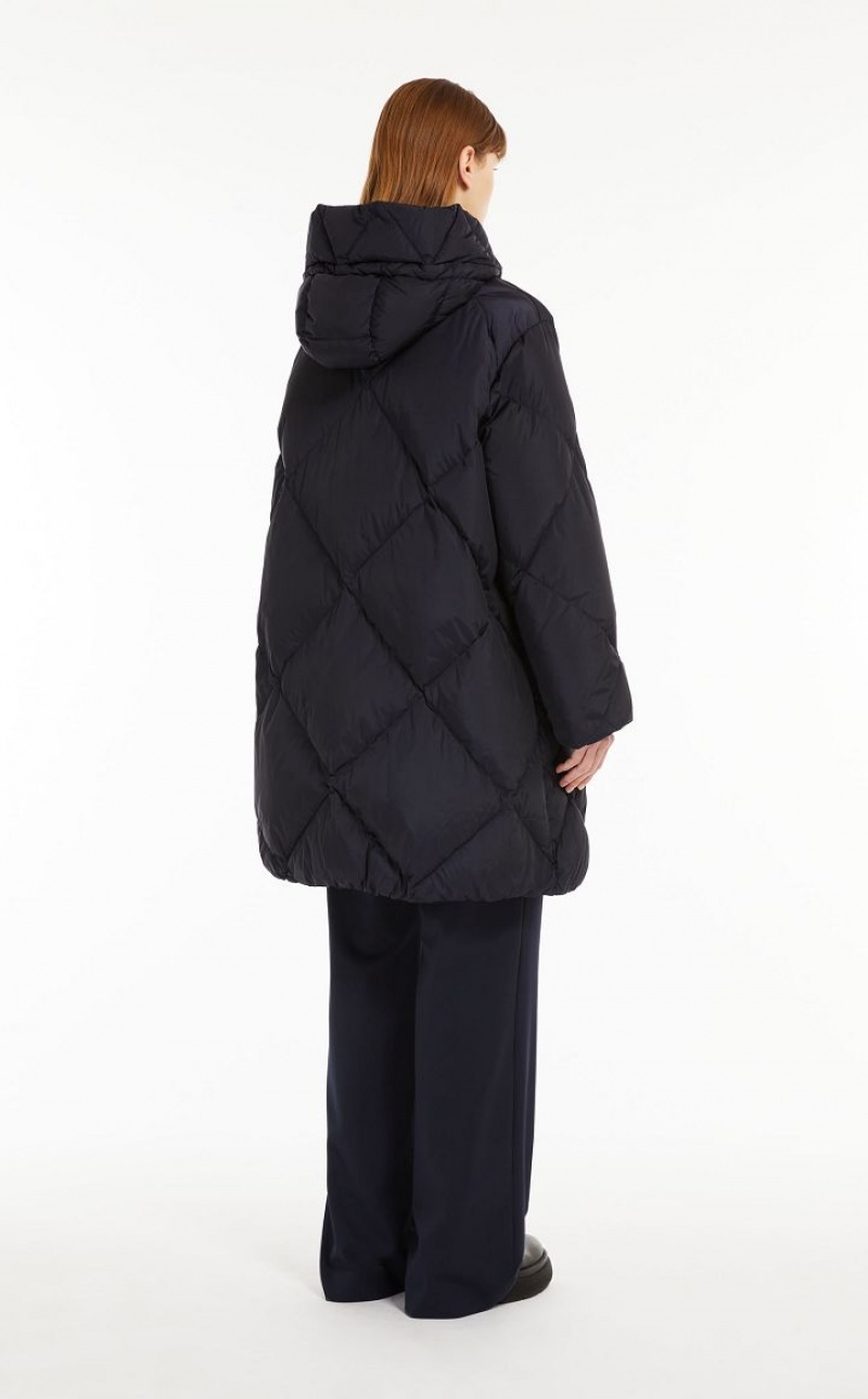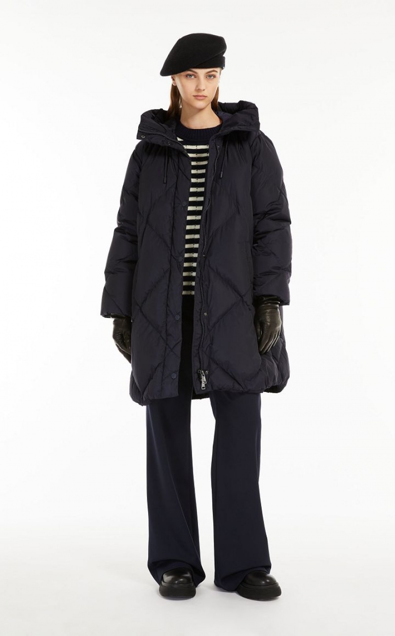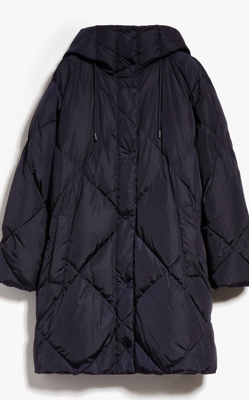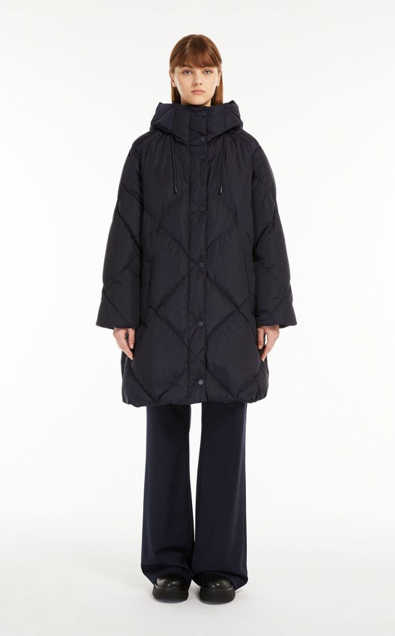 Quilted down jacket in water repellent taffeta fabric featuring 100 g goose down padding. Adjustable hood embellished collar, long sleeves and welt pockets. Zip and press stud fastening. Length: 95 cm.