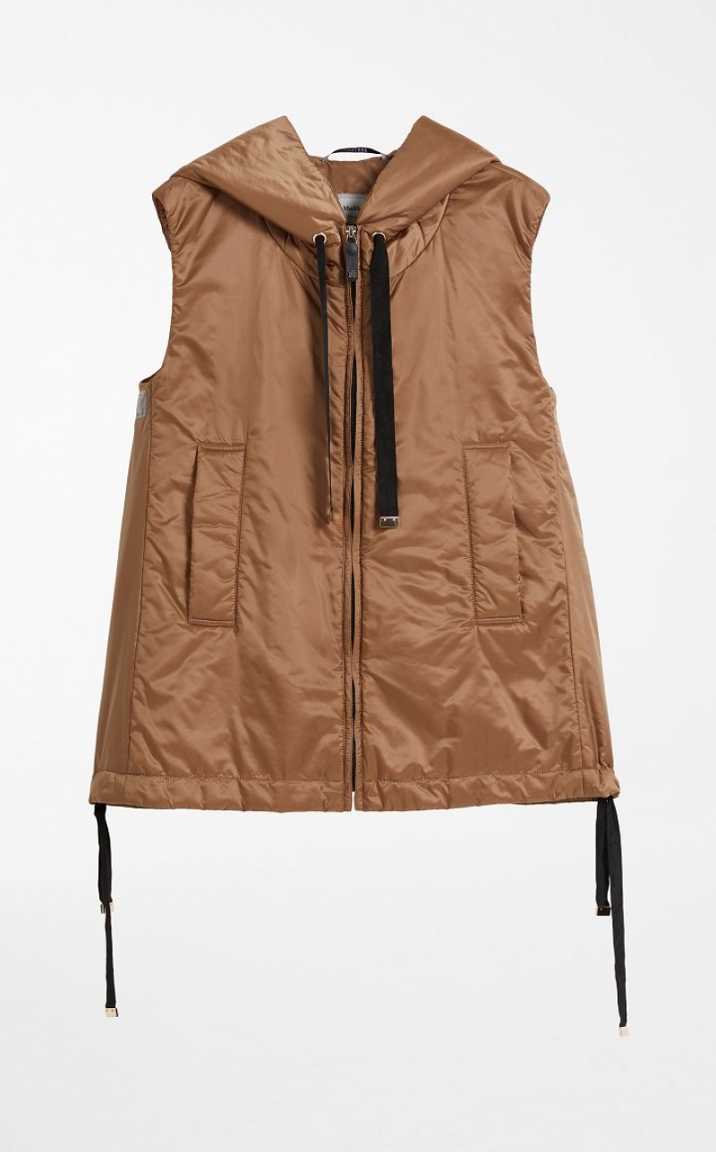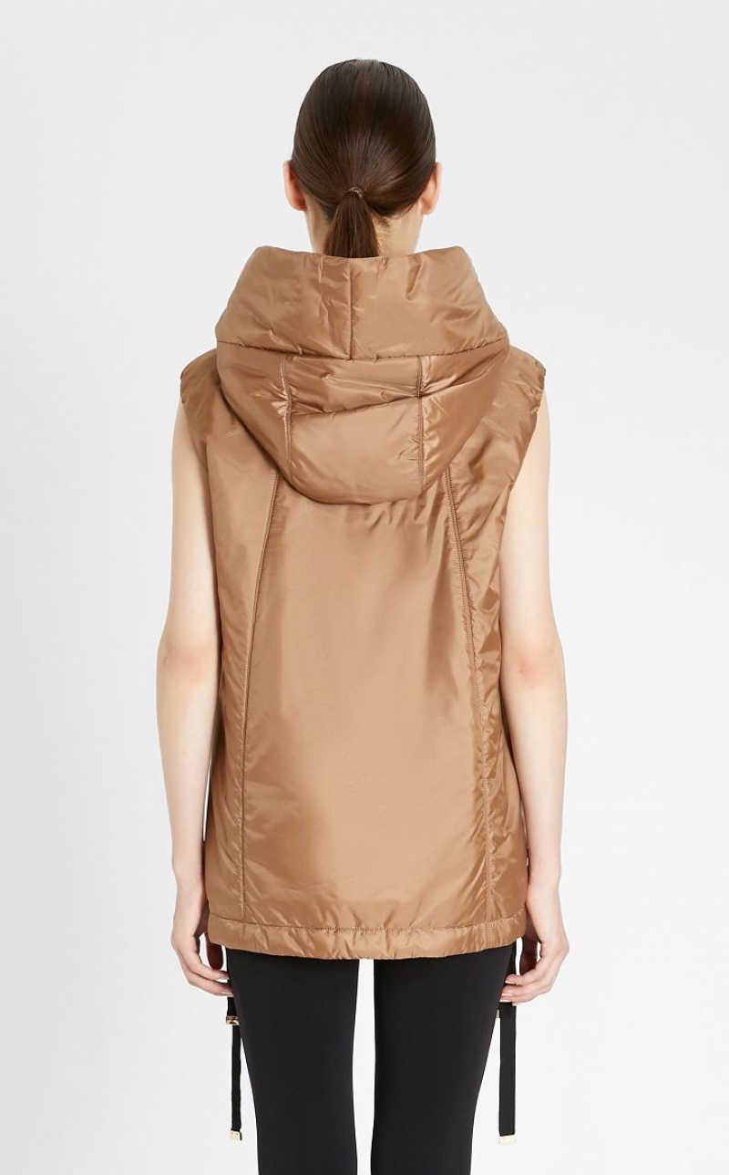 Short gilet in water-resistant technical canvas with a drawstring hood and welt pockets. Finished with drawstring hem and zip fastening. This style features Cameluxe padding: a new frontier for upcycling processes that involves recovering leftover pure camel cut-offs from the production of our legendary coats. The fabrics are reused to create a special padding capable of maintaining the same thermal insulation properties as virgin materials, without the need for further consumption of raw materials.