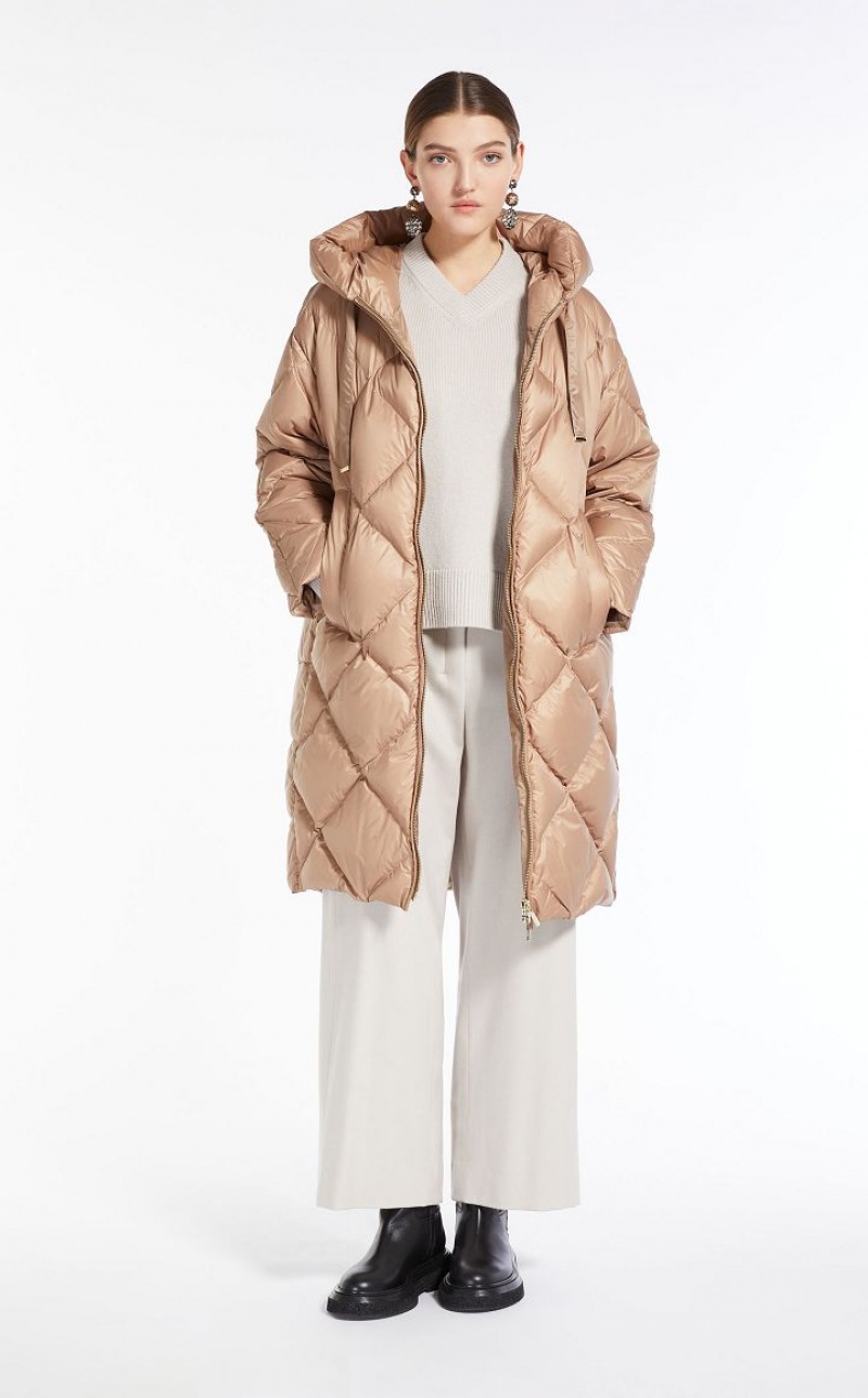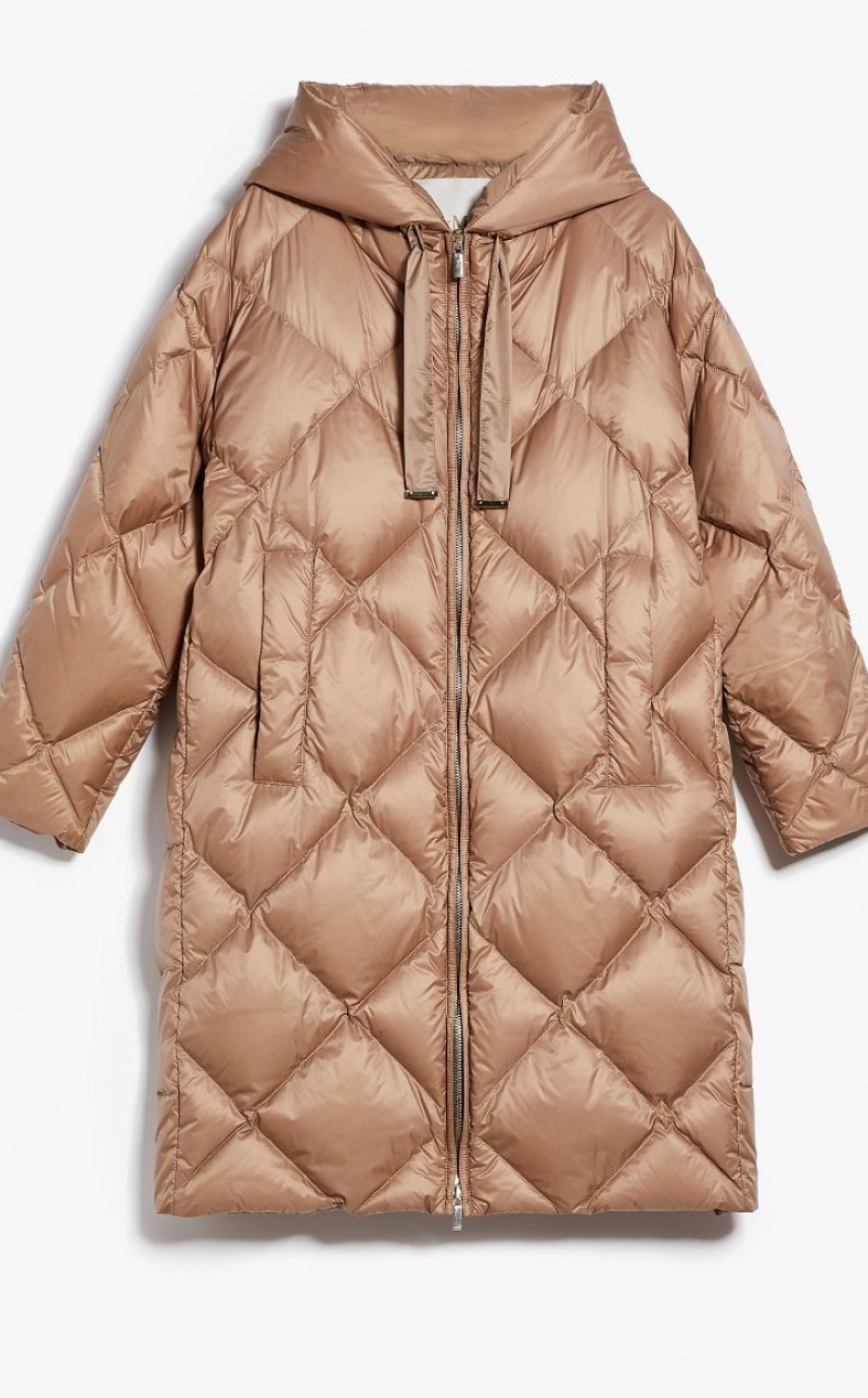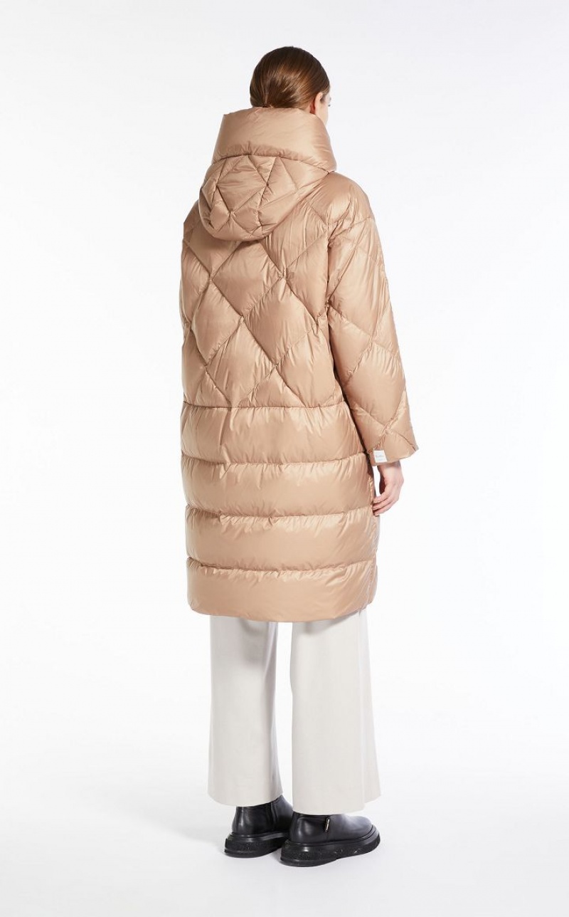 Midi parka in water-repellent iridescent nylon canvas featuring goose down padding, diamond-quilted pattern, a drawstring hood and welt side pockets. The horizontal-quilted detail on the rear hem adds the finishing touch. Metal zip fastening. Length: 98 cm.