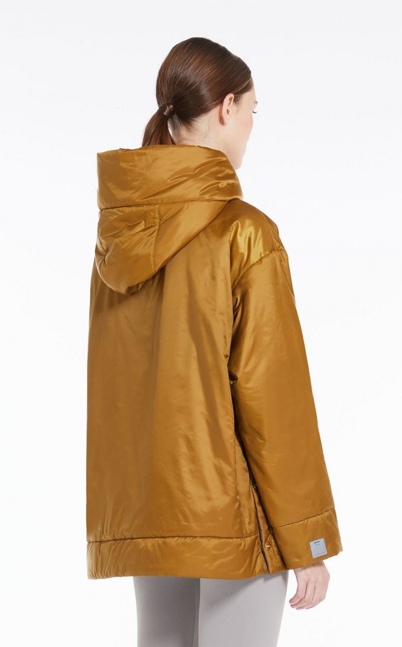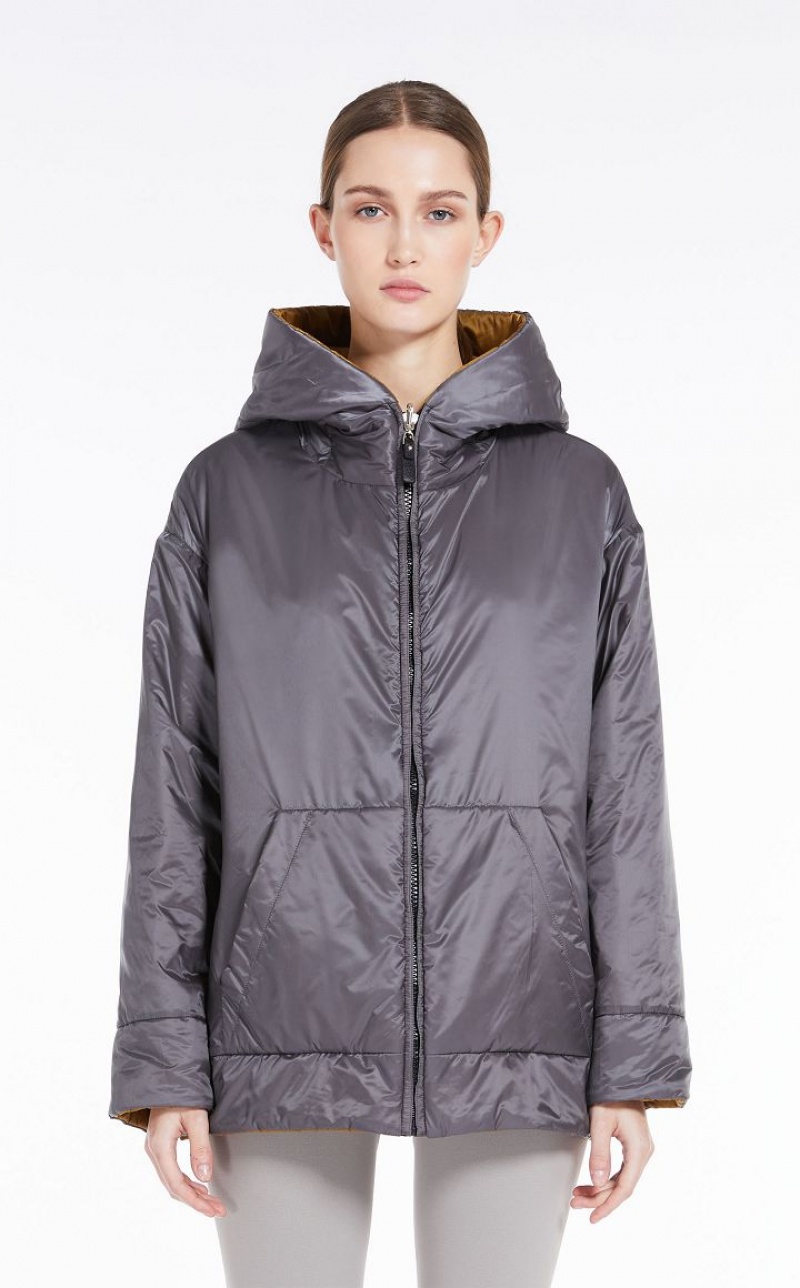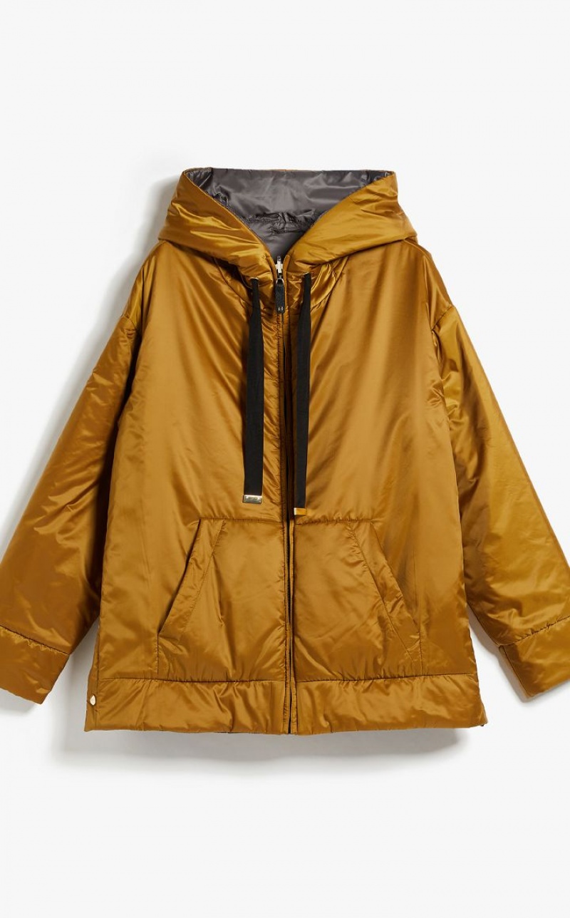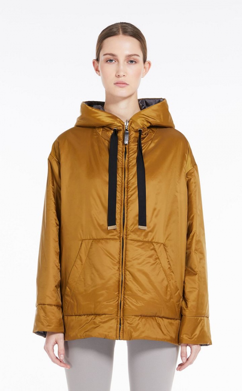 Reversible short padded jacket in water-repellent technical canvas featuring a hood and metal press stud-fastening side slits. Kangaroo front pockets. Zip fastening. The Cameluxe padding sets the garment apart: a new frontier as far as upcycling processes are concerned, since any surplus material leftover from the process of cutting the pure camel fabrics for our legendary coats, is recovered. These pieces of fabric are then reused to create a special padding material that boasts the same insulating properties as virgin materials, without needing to use any more raw materials. Length: 72 cm.