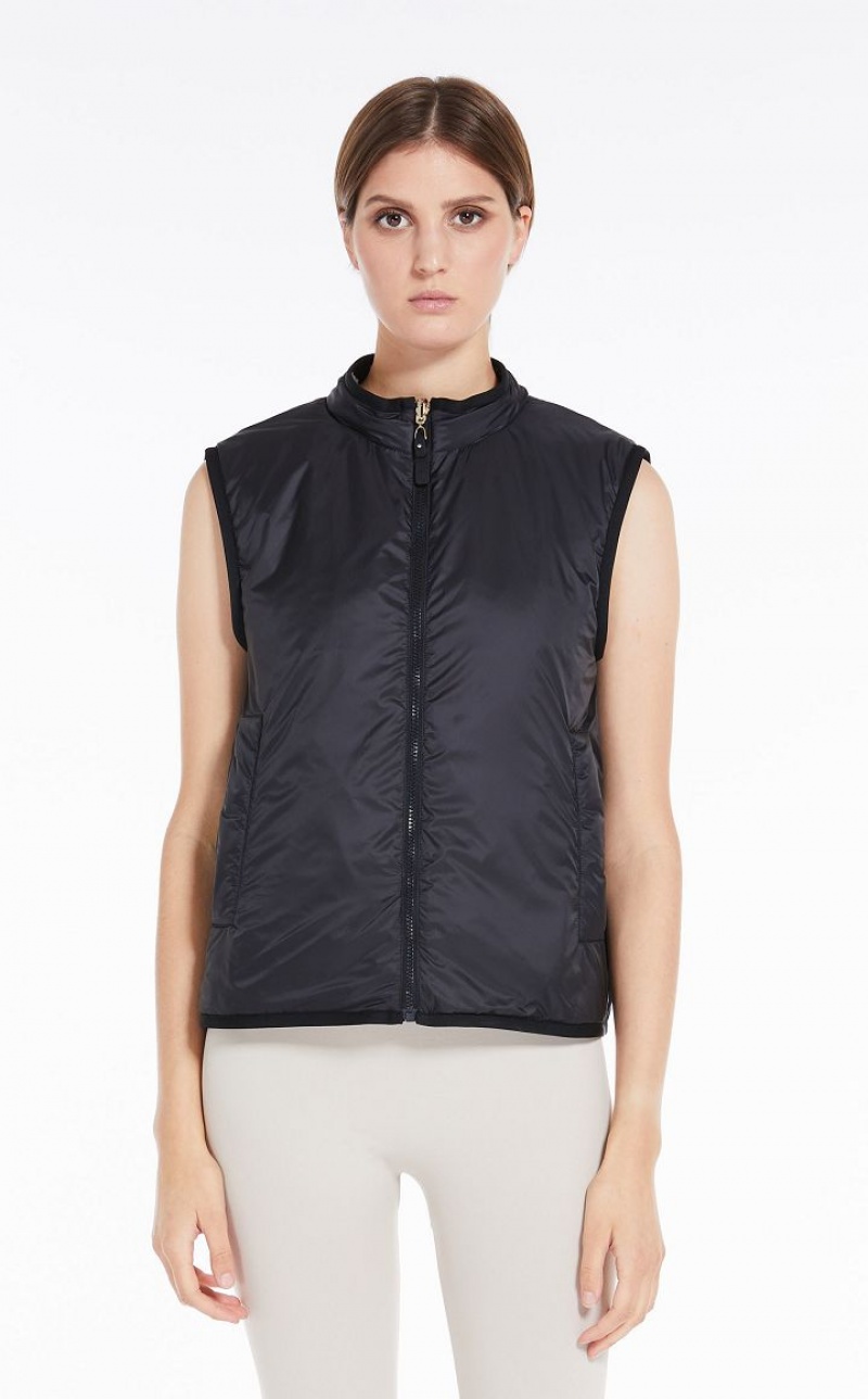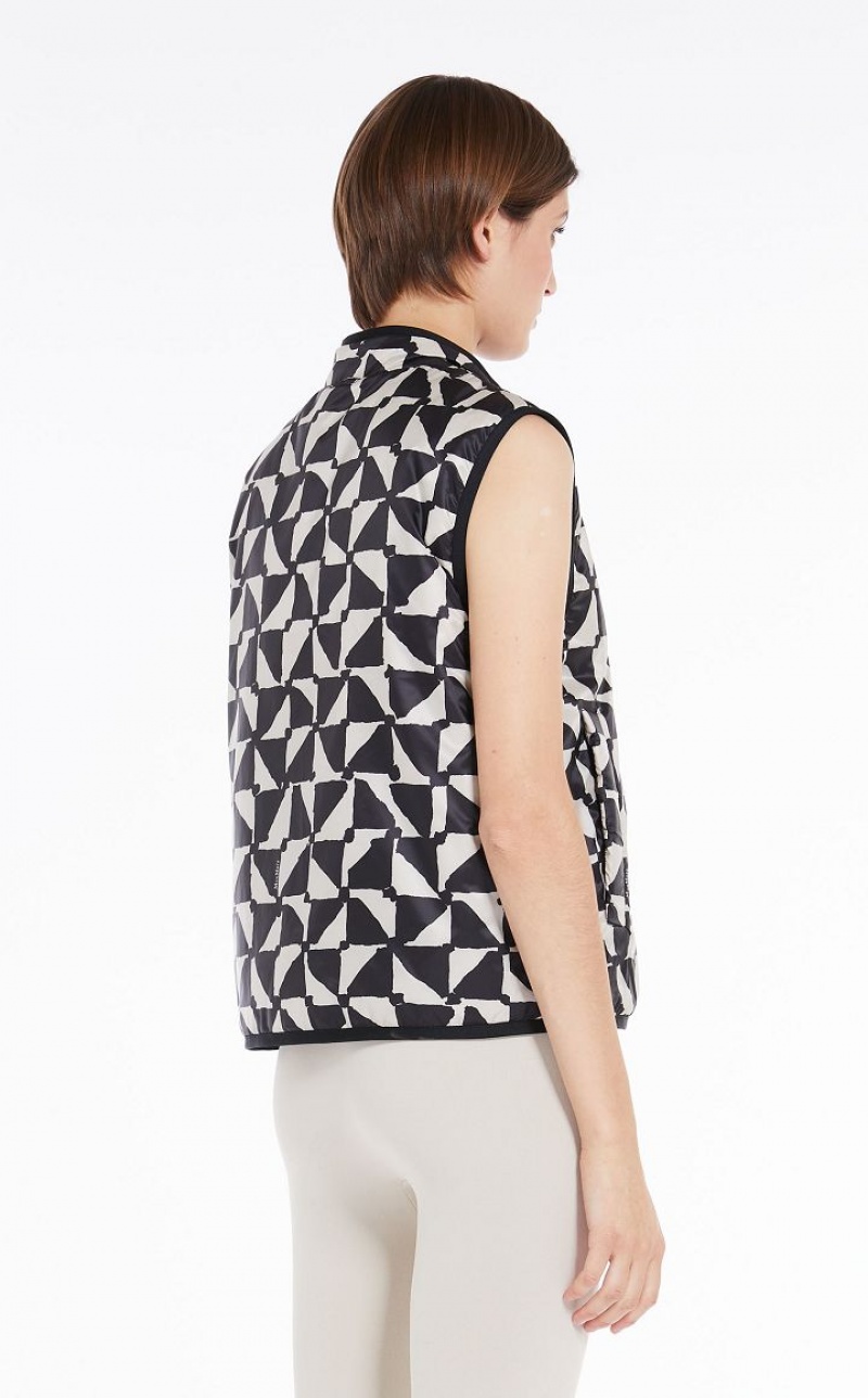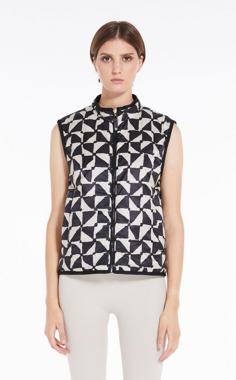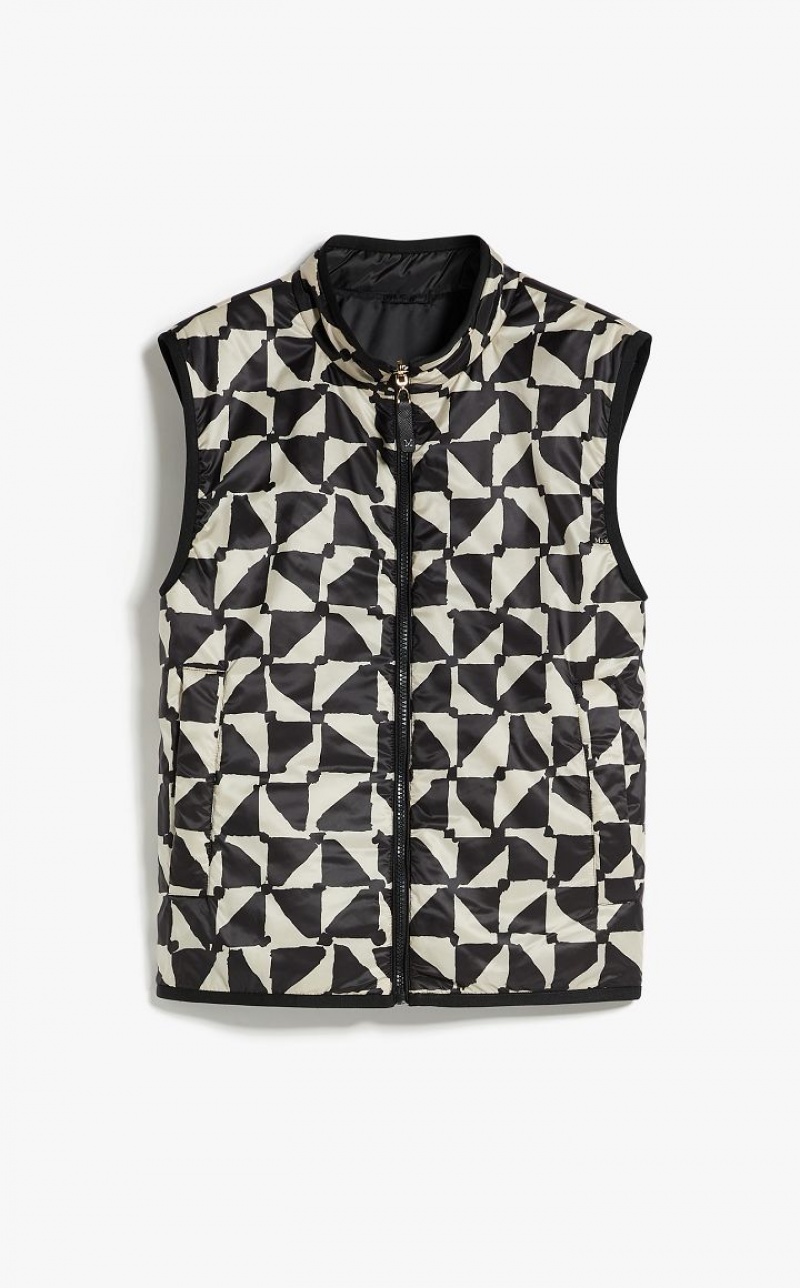 Reversible short gilet in water-resistant technical canvas, with stand collar, side pockets and front zip fastening. One side is printed with a two-tone geometric diamond pattern, the other is solid colour. Finished with matching piping on the edges. This style features CameLuxe padding: a new frontier for upcycling processes that involves recovering leftover pure camel cut-offs from the production of our legendary coats. The fabrics are reused to create a special padding capable of maintaining the same thermal insulation properties as virgin materials, without the need for further consumption of raw materials.