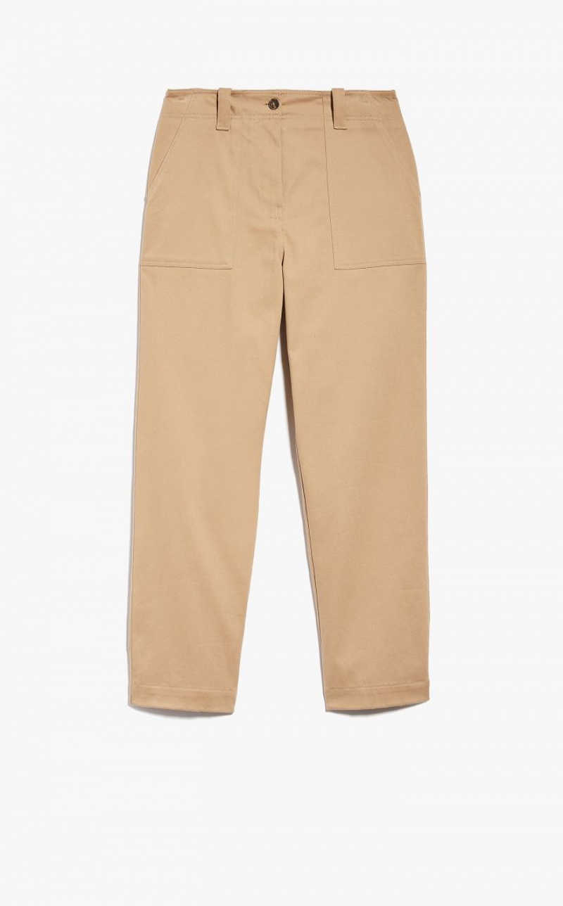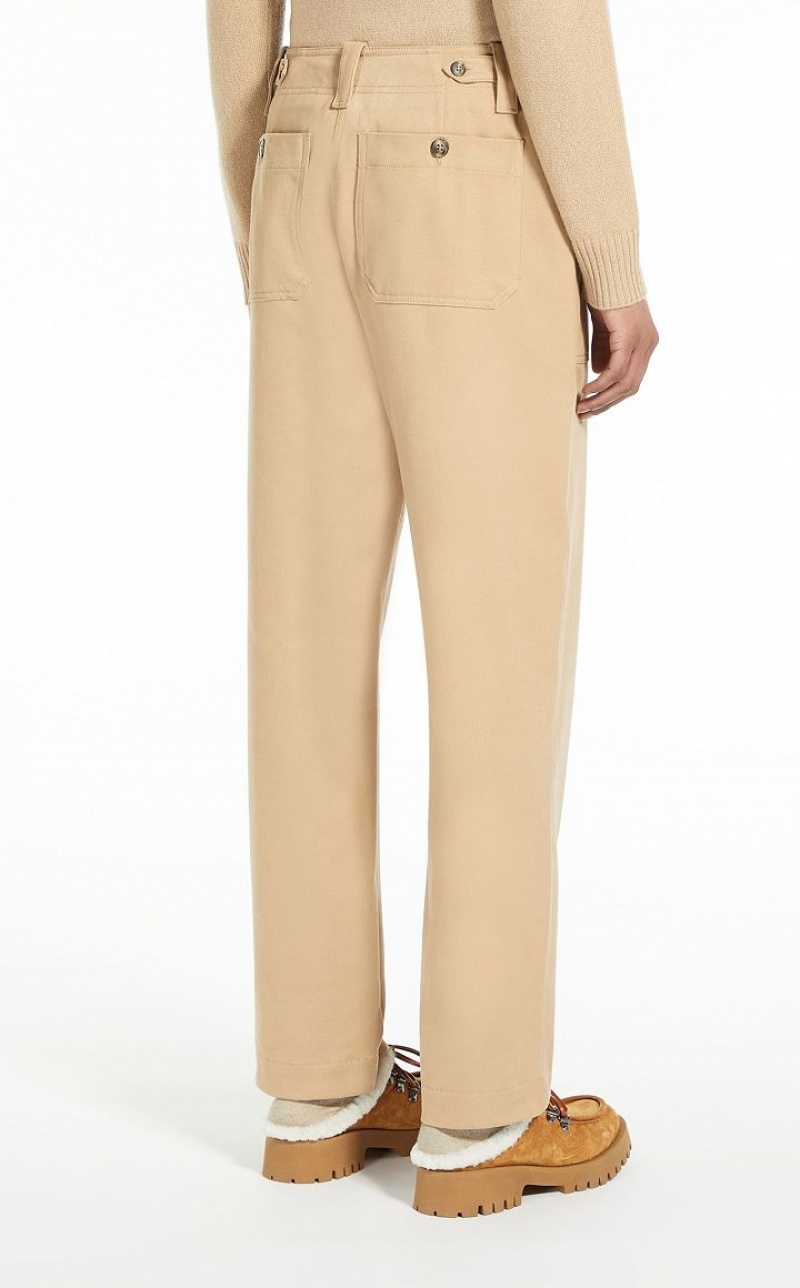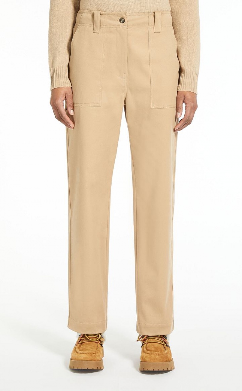 Straight fit trousers in cotton drill fabric featuring patch front pockets and buttoned flap adorned rear pockets. Zip and button fastening. Length: 105 cm.