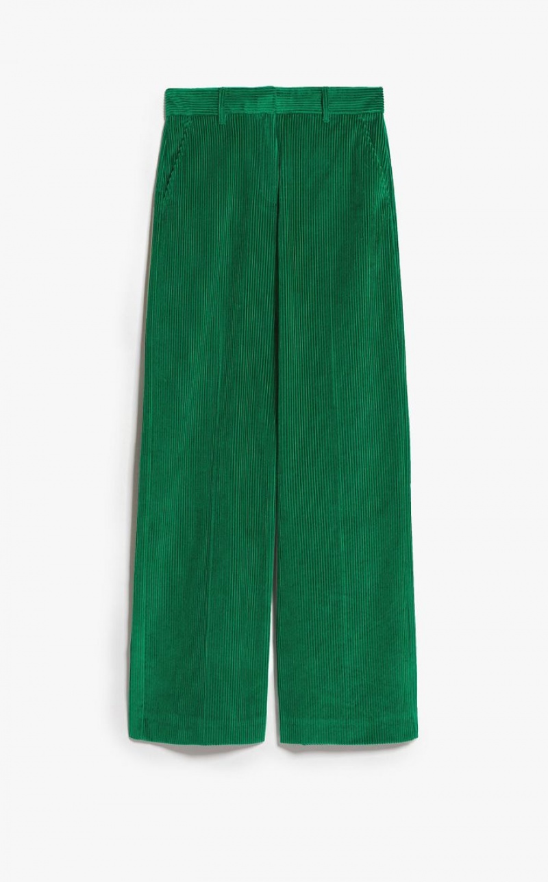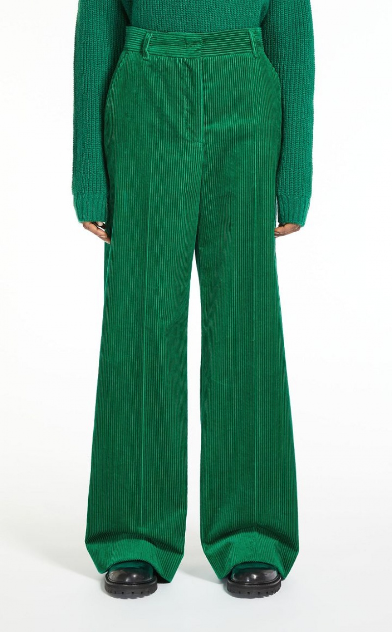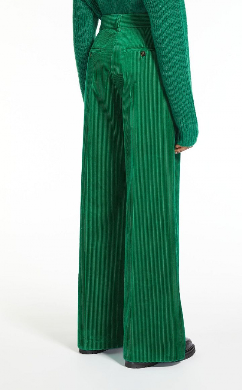 Palazzo trousers in pure cotton velvet fabric. Belt loop adorned waistband, central pressed pleat detail, slant front pockets, buttoned welt rear pockets and rear darts. Zip and hook and bar fastening.
