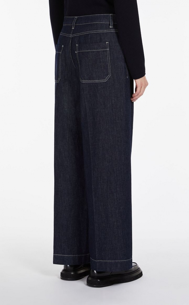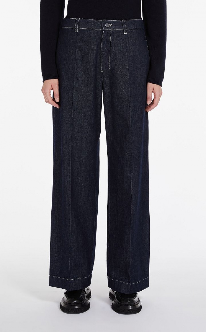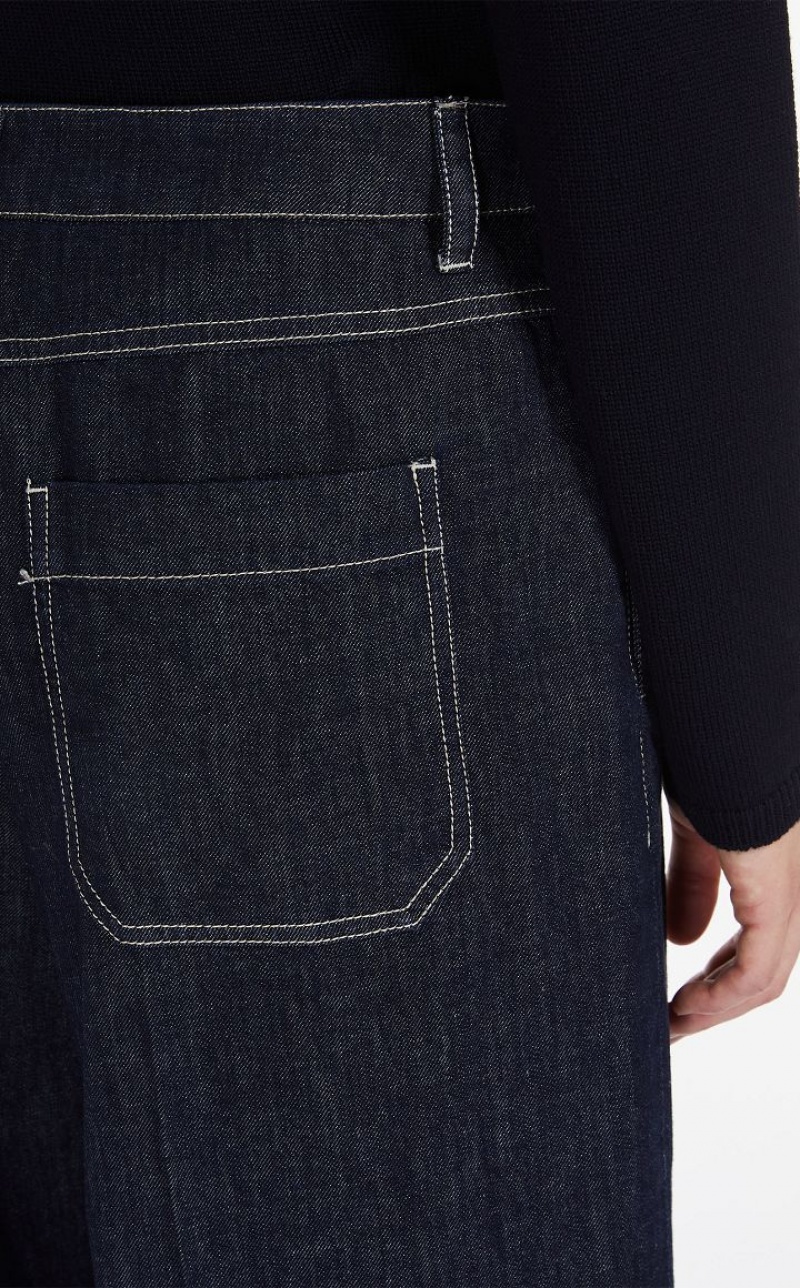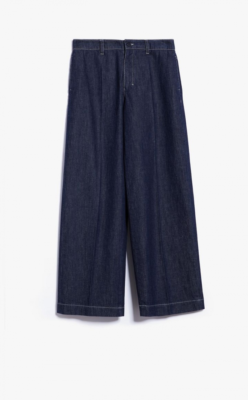 Five-pocket trousers with wide leg made of garment-treated cotton denim. The slightly stretchy fabric ensures a comfortable fit. Finished with classic details, patch pockets at the back and contrasting stitching. Fastening with snap button and zip with flap. Length: 111 cm.