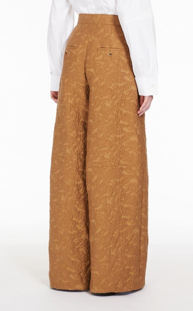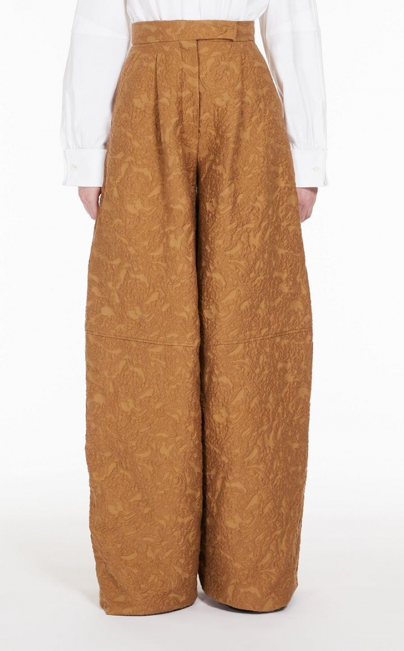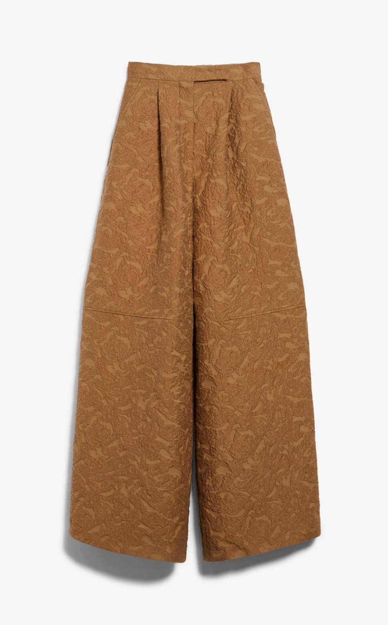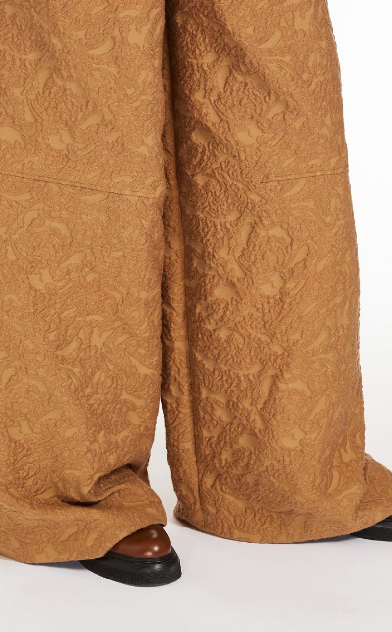 Trousers made of a luxurious cotton blend jacquard in a brocade design, featuring a wide silhouette with pleats at the knee that give the garment a particularly large volume with a sculptural effect. The style has a slightly high waist with pleats on the front, slant pockets on the sides and welt pockets with a button on the back. Fastening with high waistband tab, zip fly and small hook. Width at the hem: 40 cm.