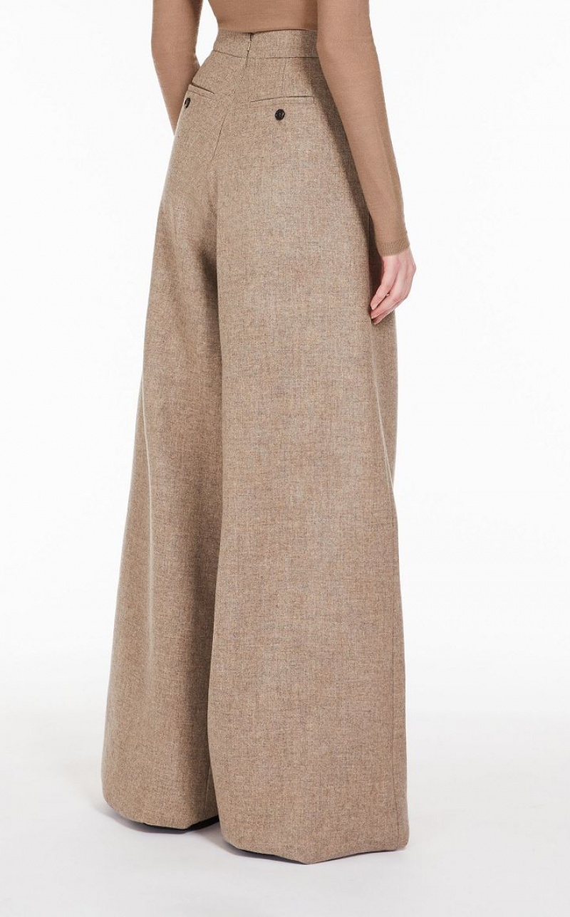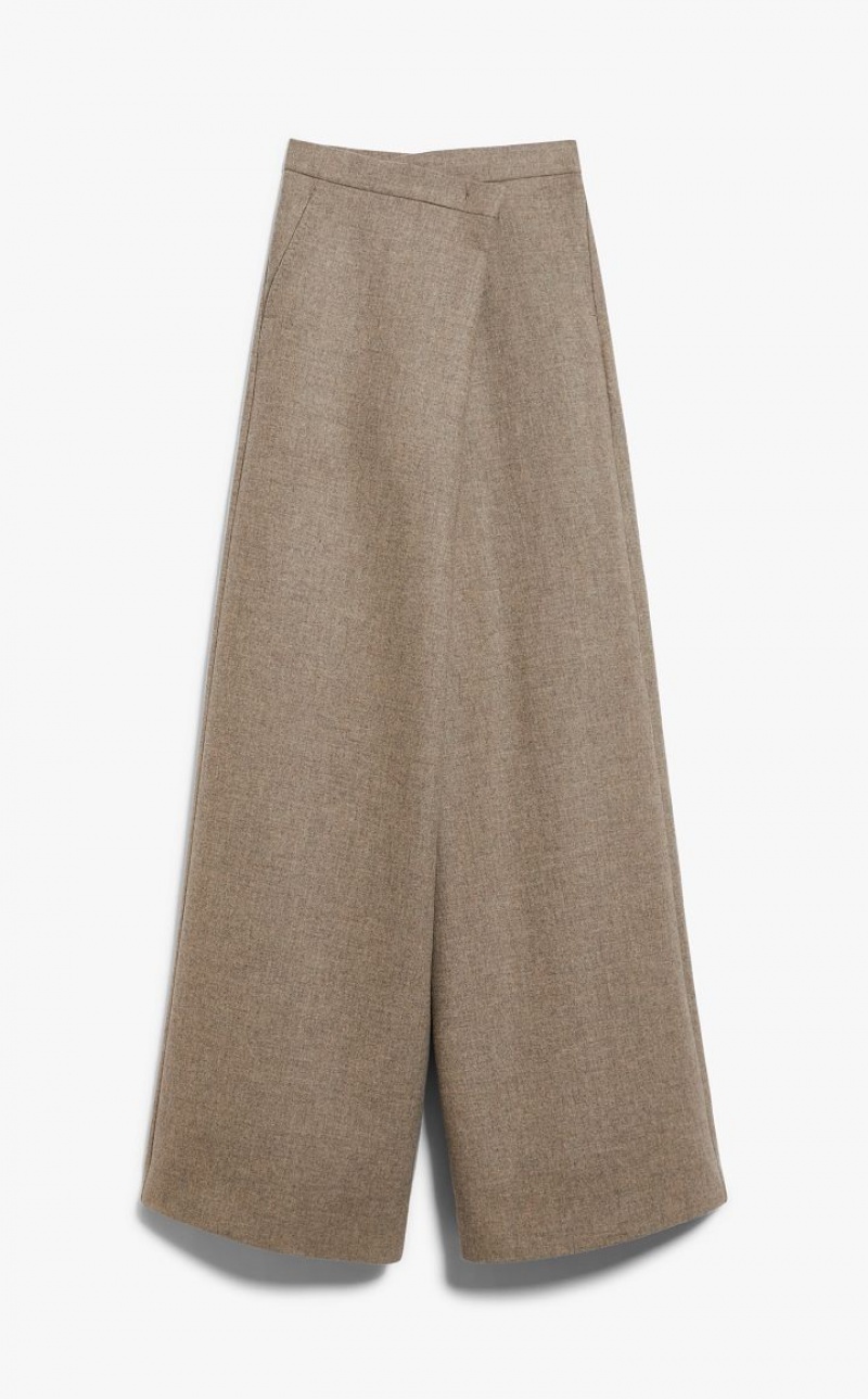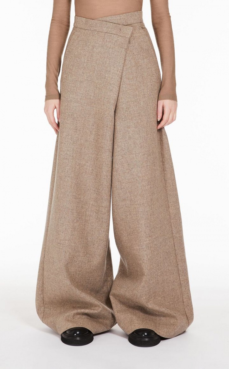 Wide trousers in wool and cashmere flannel, with a pleasantly soft texture. Style featuring a wide-leg silhouette and overlapping fastening that creates an oversized asymmetrical pleat at the front. Completed by slant pockets at the sides and small welt pockets with button at the back. Invisible zip fastening on the back. Width at the hem: 40 cm.