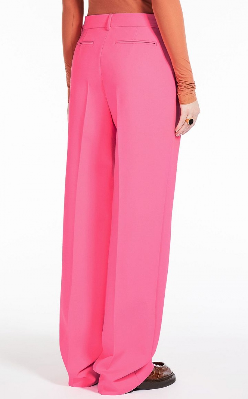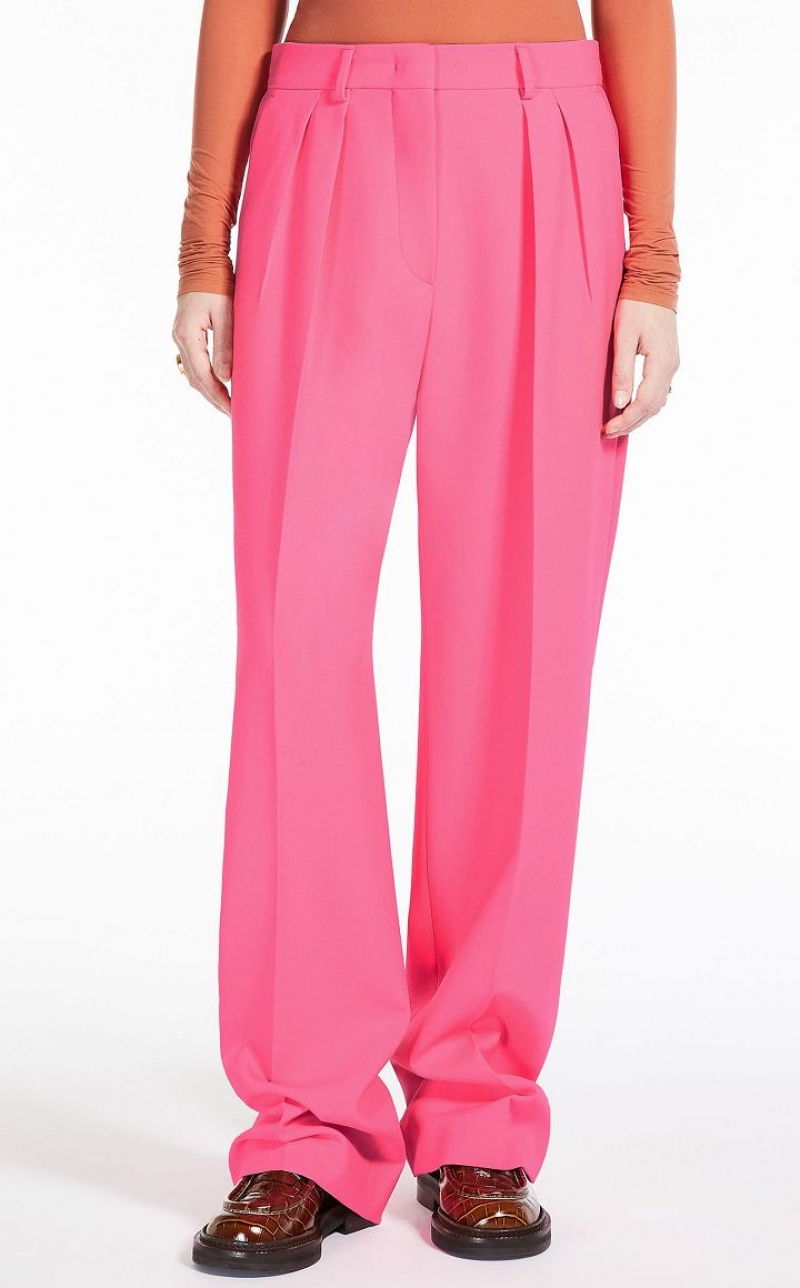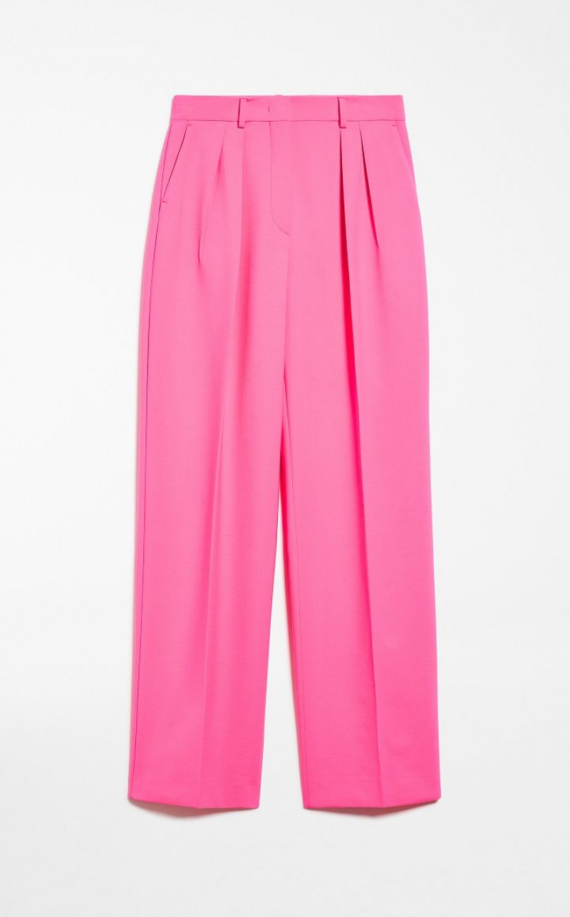 Wide-fit trousers made of stretch wool canvas. The construction is low-waisted, with double darts at the front that increase the volume of the legs. The customised internal waistband is inspired by men’s tailoring details, as are the slant pockets along the sides and the welt pockets on the back. Relaxed-fit leg with trouser crease front and back. Length: 123 cm.