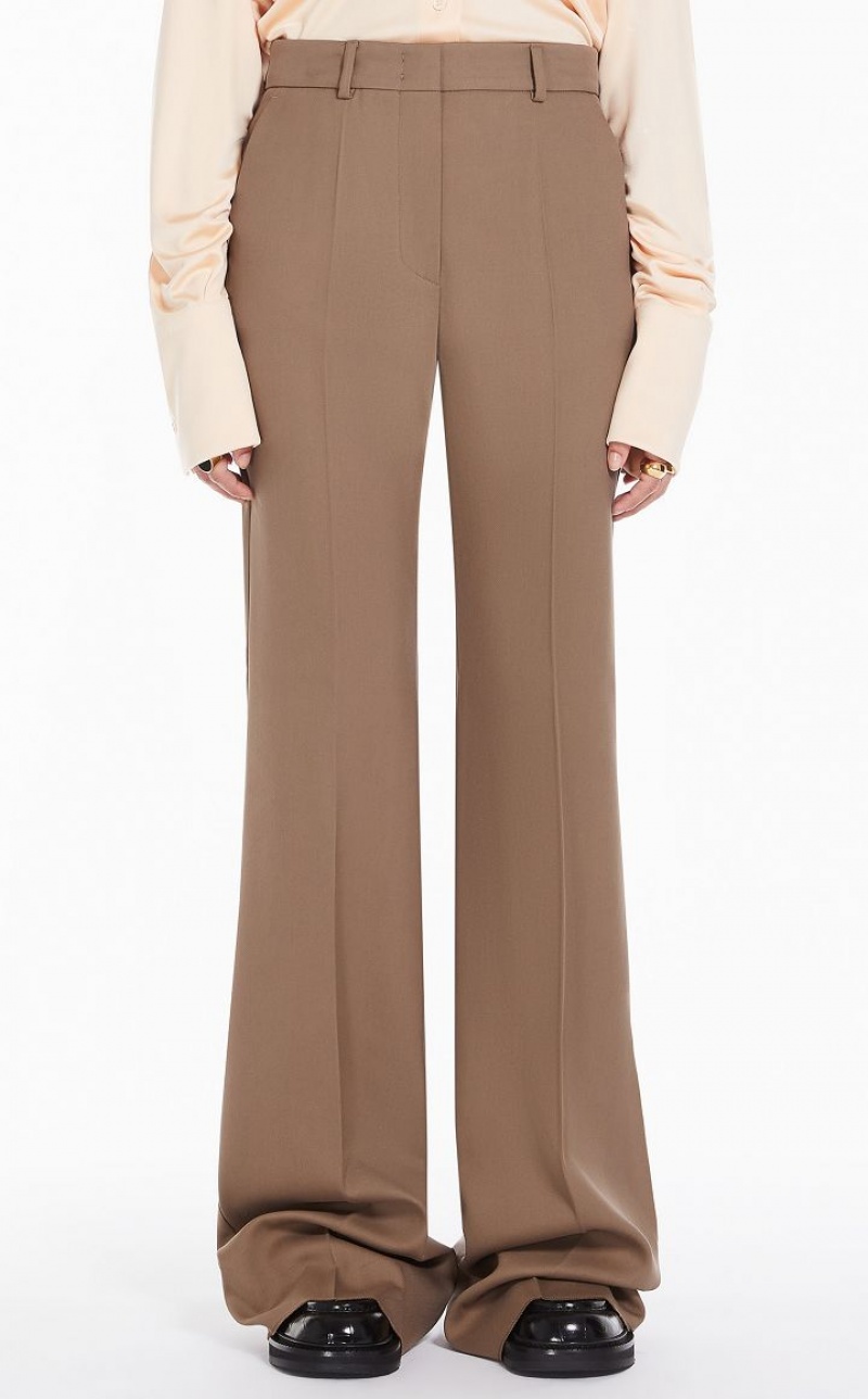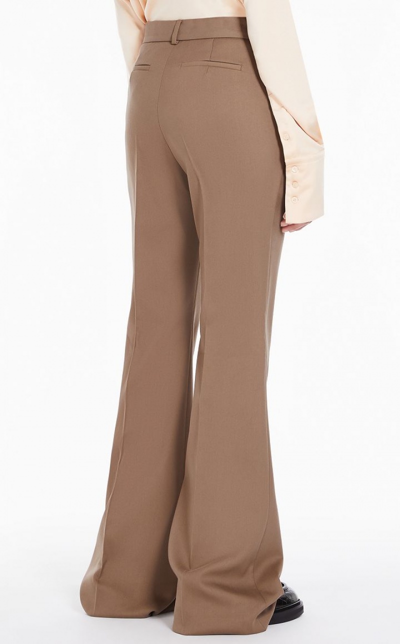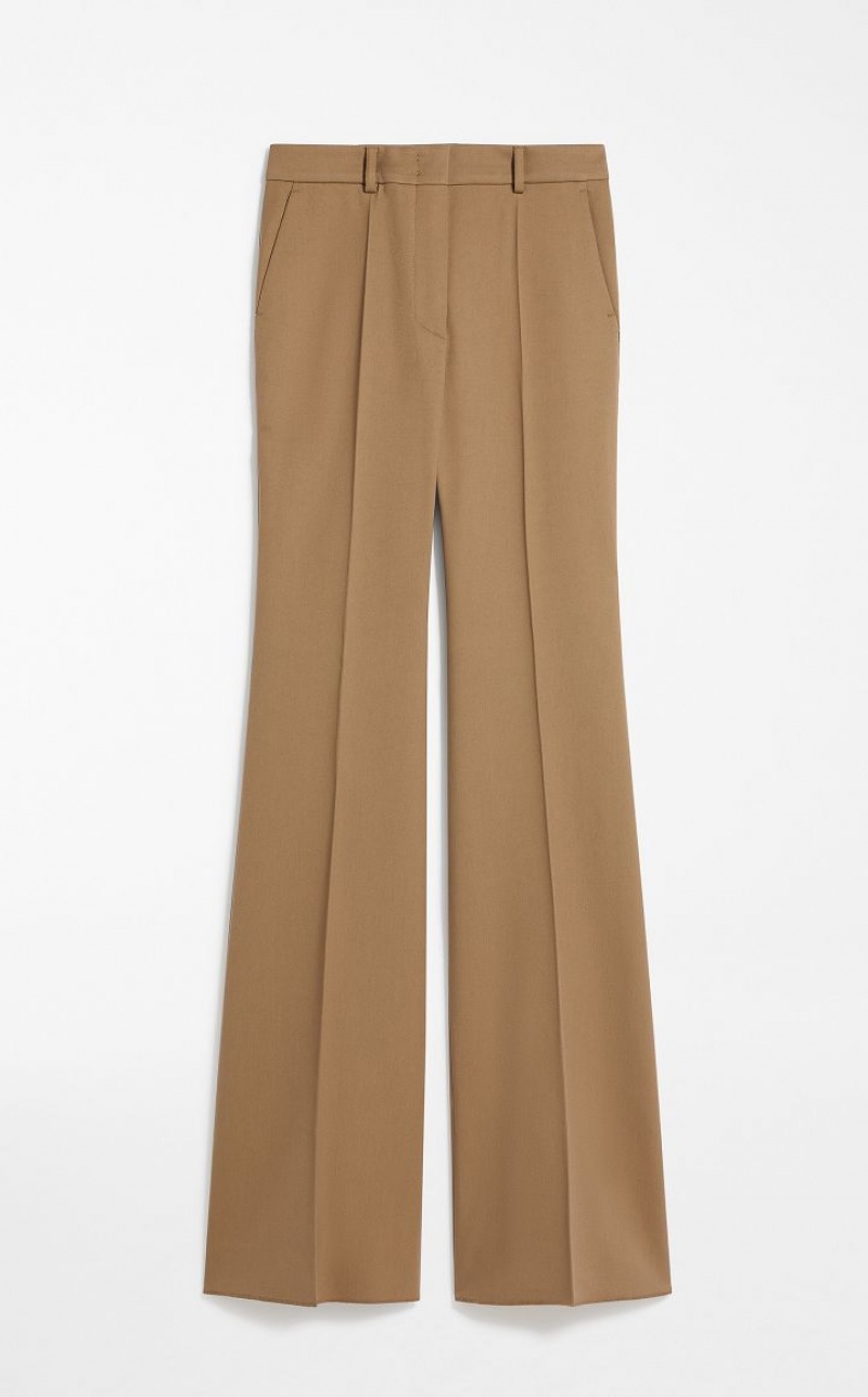 Tailored-look trousers, with a wide, fluid leg defined by trouser crease front and back. Waistband with belt loops, slanted side pockets and back welt pockets.