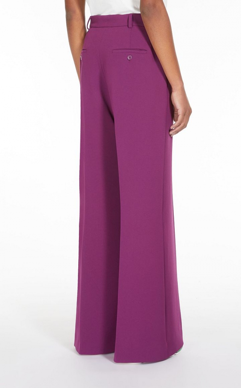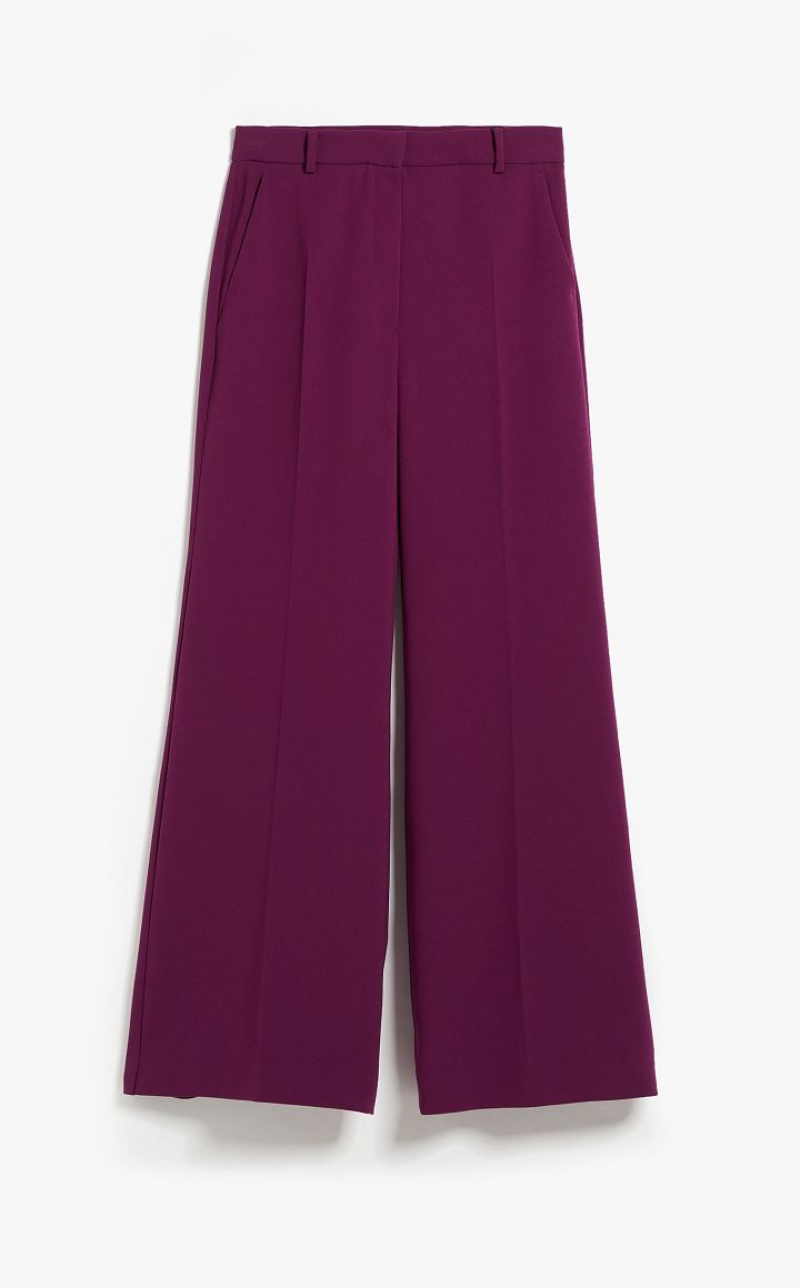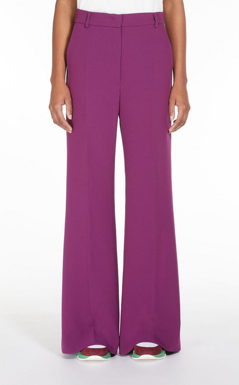 High-waisted trousers in soft cady, featuring a bell-bottom silhouette and pressed crease on the leg. This style has slanted pockets on the sides and welt pockets on the back. Fastening with deep band at the waist, zip with flap and hook.