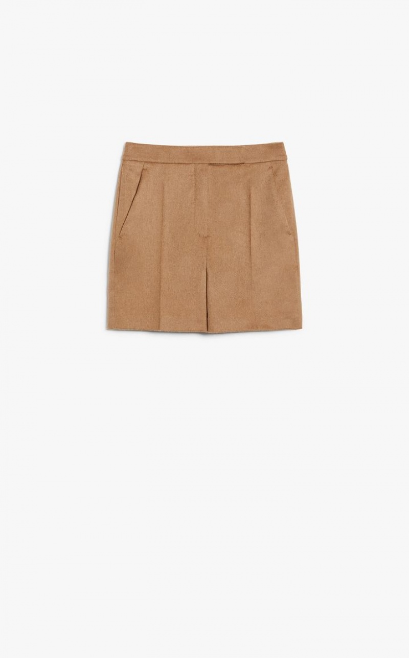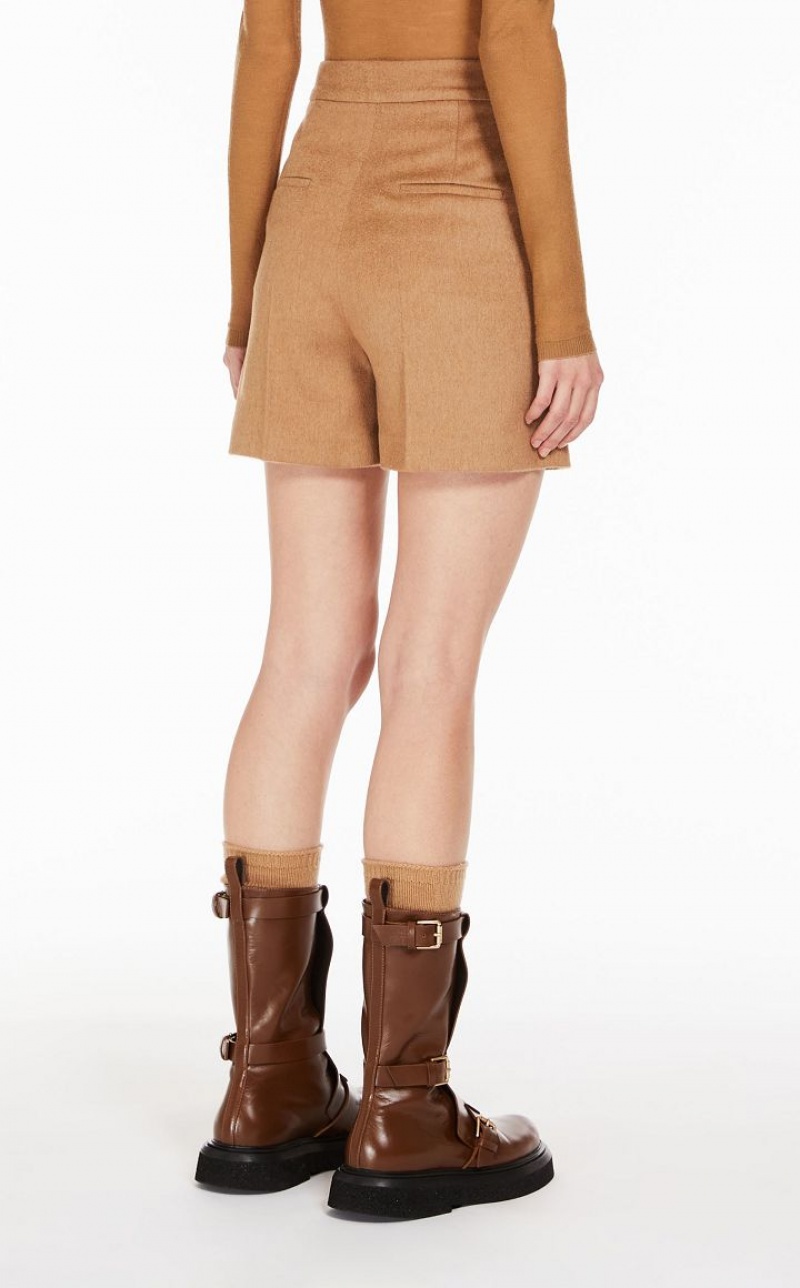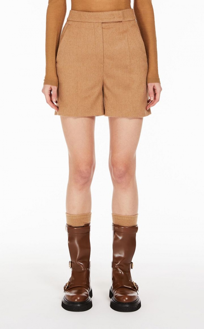 Slightly low-waisted shorts, made of luxurious, sable-trimmed pure camel fabric. Tailored cut with a trouser crease, slant pockets at the sides and back welt pockets. Fastening with high waistband tab, zip fly and small hook. Lined. Length: 40 cm.