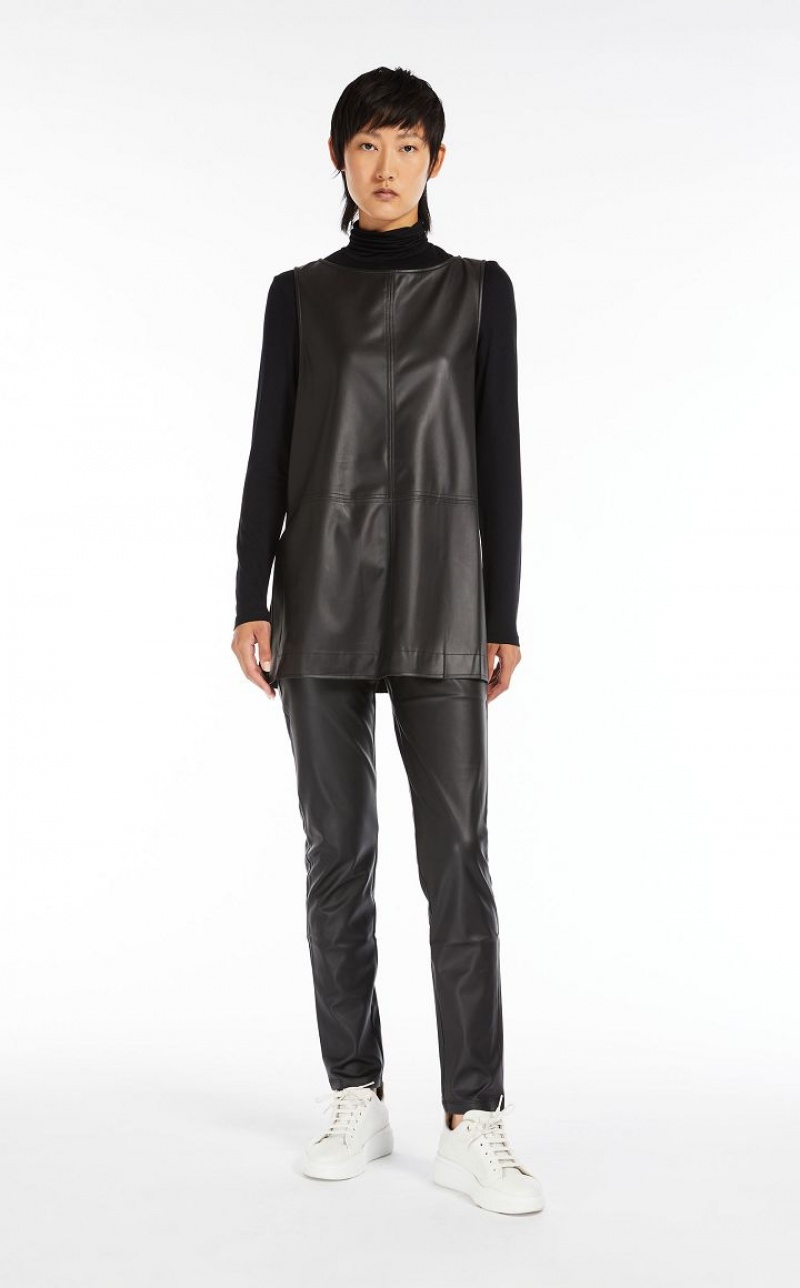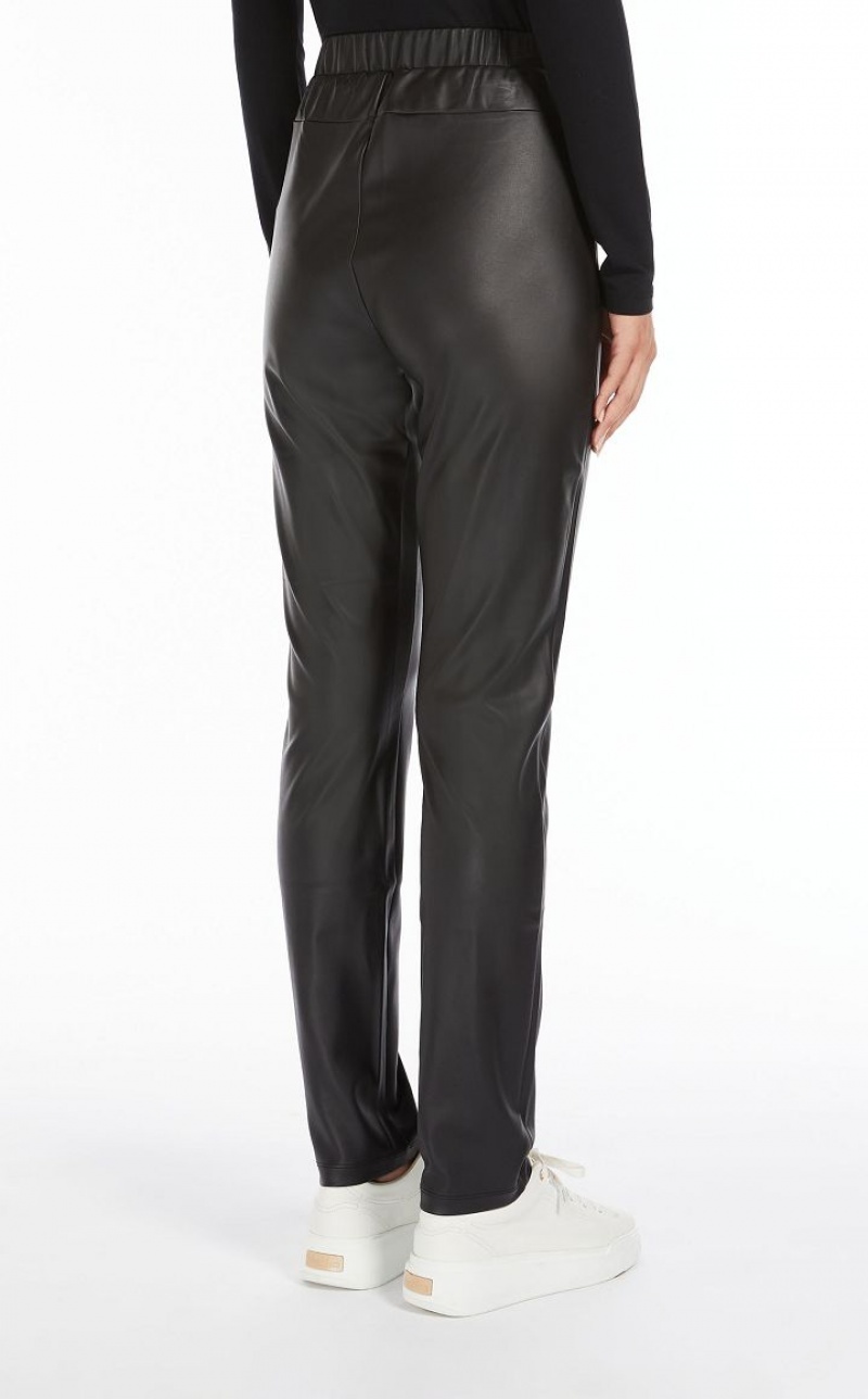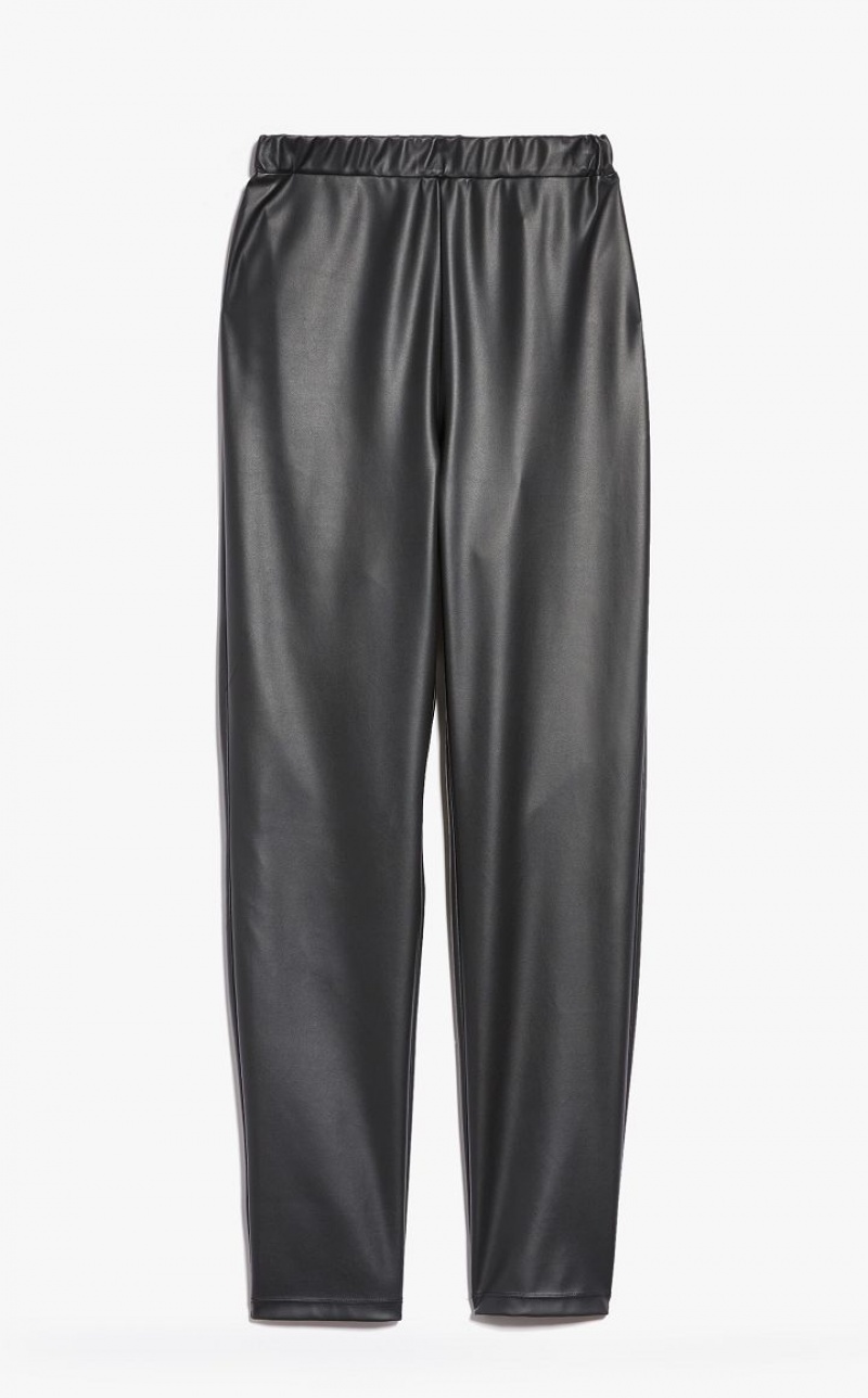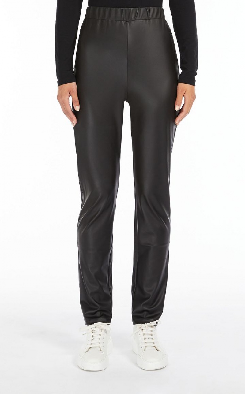 Coated-jersey leggings featuring an elasticated waist and straight line on the leg. Length: 106 cm.