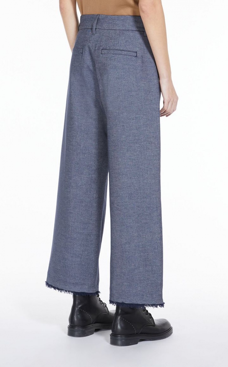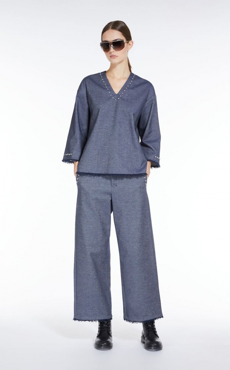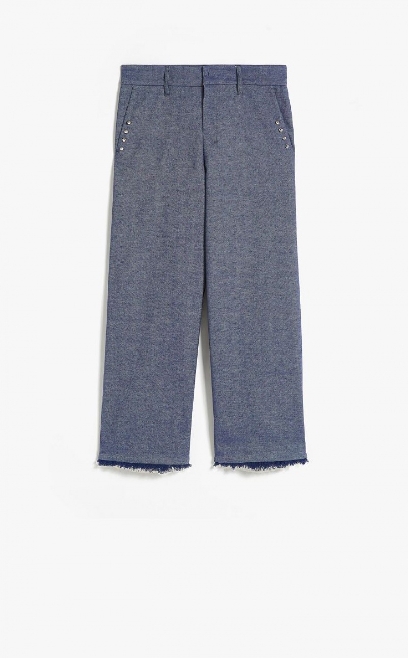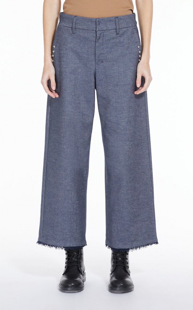 Slightly flared trousers in denim-look stretch cotton fabric. Fringed detail-embellished hem and stud-embroidered pockets. Fly-covered zip fastening. Length: 99 cm.