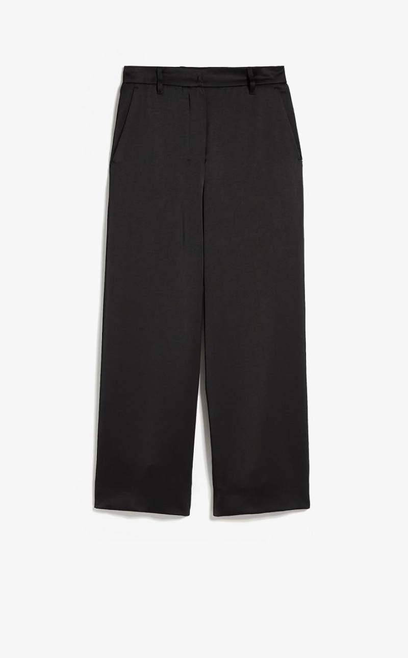 Straight-leg trousers in viscose-blend satin fabric featuring welt rear pockets. Extended waist tab, complete with a placket-covered zip and hook-and-bar fastening. Length: 96 cm.