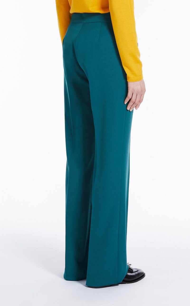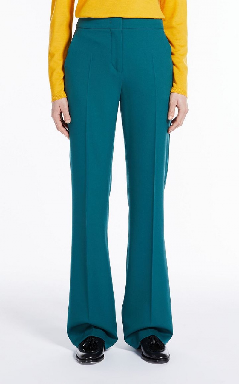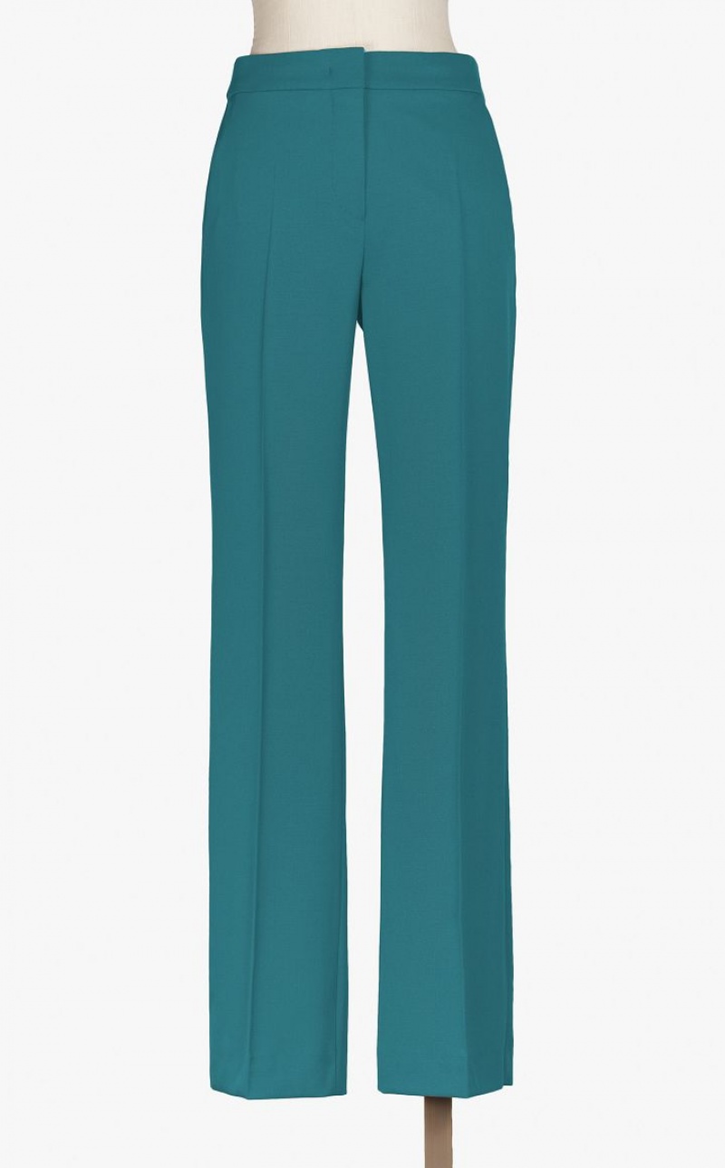 Trousers with a straight leg slightly flared at the hem, made of fine, slightly elastic granité wool. The fabric, made from combed wool fibres that are extremely soft to the touch and have a refined look, boasts a wavy, semi-matte texture suitable for all seasons. The masculine-inspired tailored construction is completed by a trouser crease on the leg and pockets on the sides. Fastening with wide customised waistband, flap with zip and small hook.