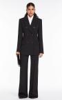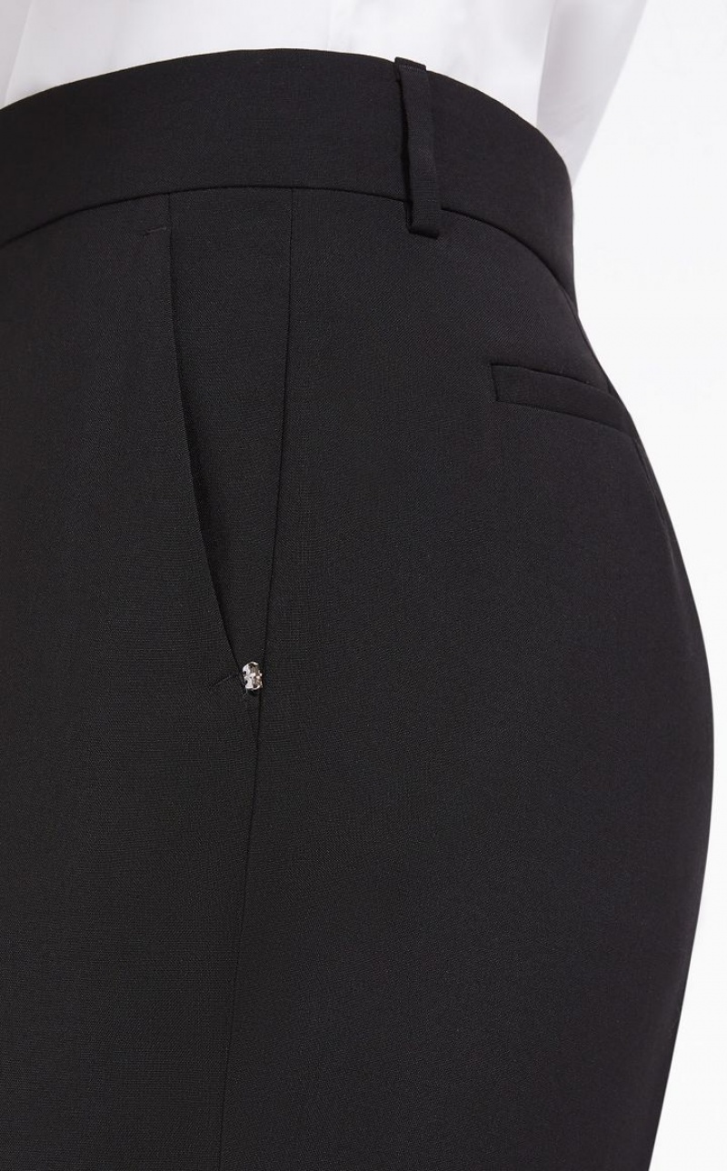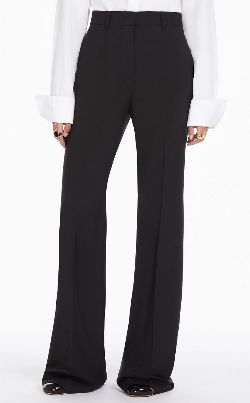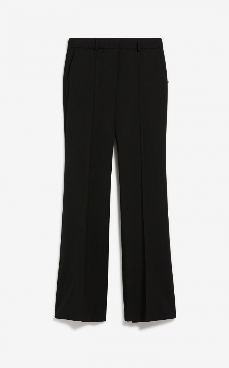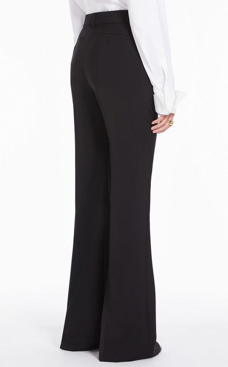 Flared trousers in flowing, natural-stretch pure wool plain-woven fabric. The construction is inspired by menswear, with covered buttoning at the waist and waistband with belt loops and branded internal tape. The slanted side pockets, welt pockets on the back. Flared, with trouser crease front and back.