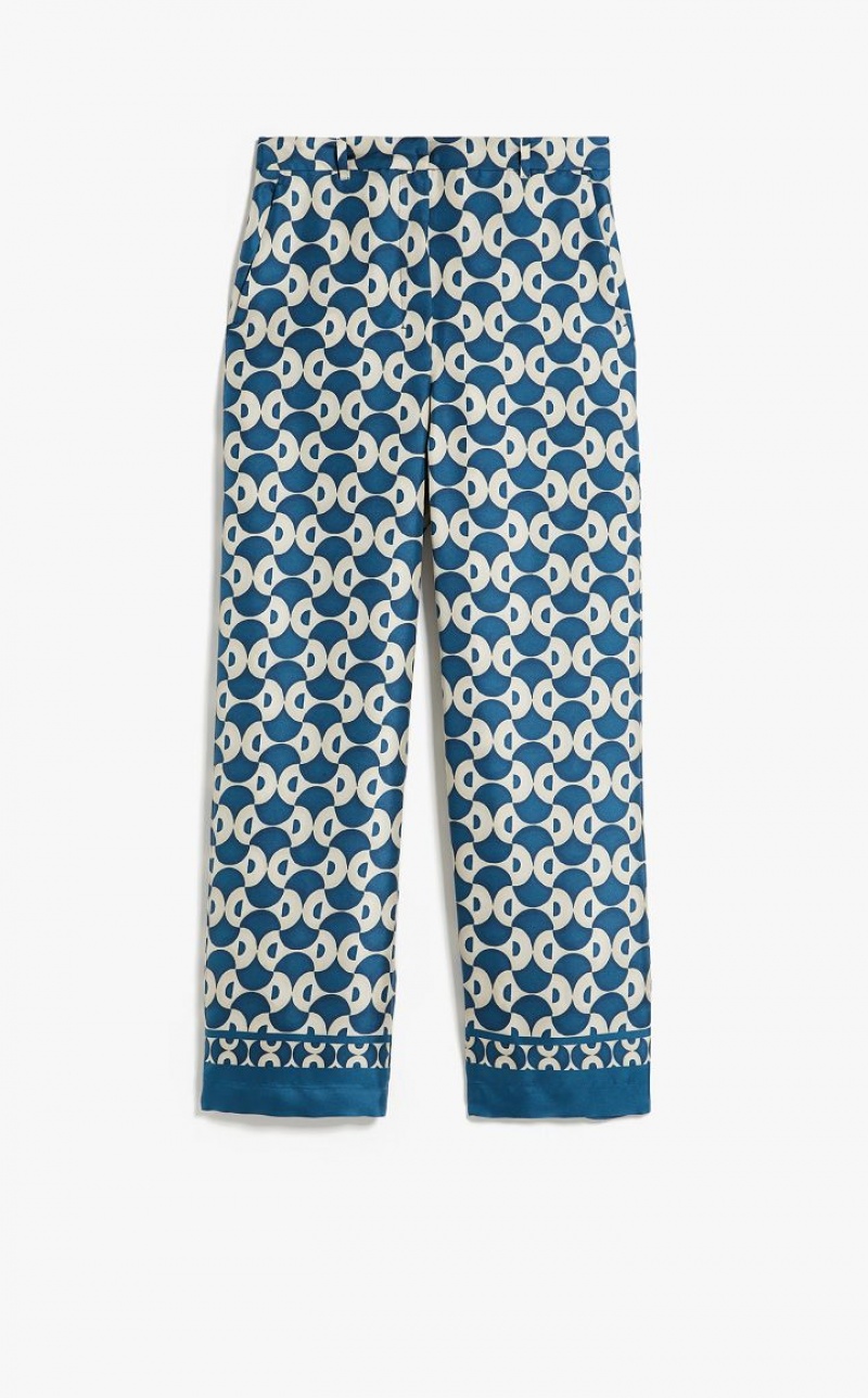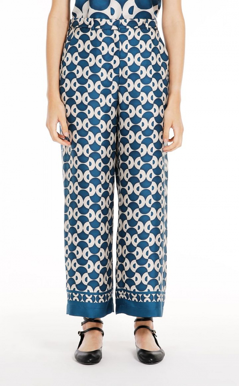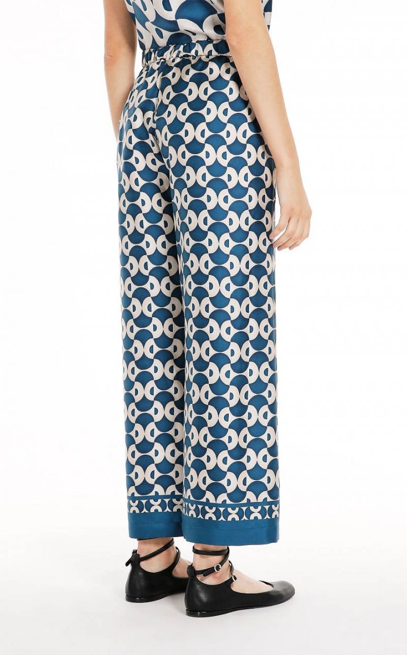 Long trousers in fine printed pure silk twill fabric featuring a fluid silhouette and an elasticated waistband. The model boasts printed band-embellished leg hems, in addition to bias-cut pockets, and a fly-covered zip and hook-and-bar fastening. Length: 99 cm.