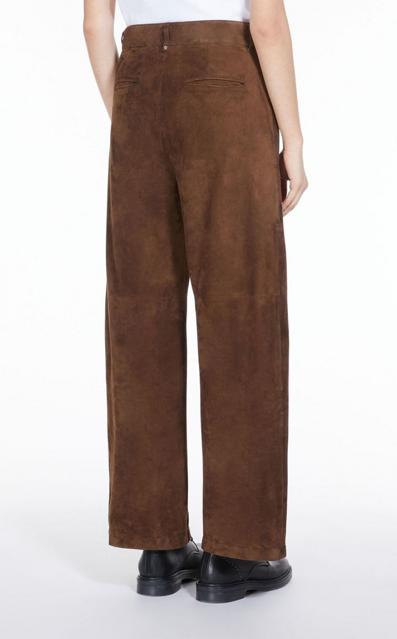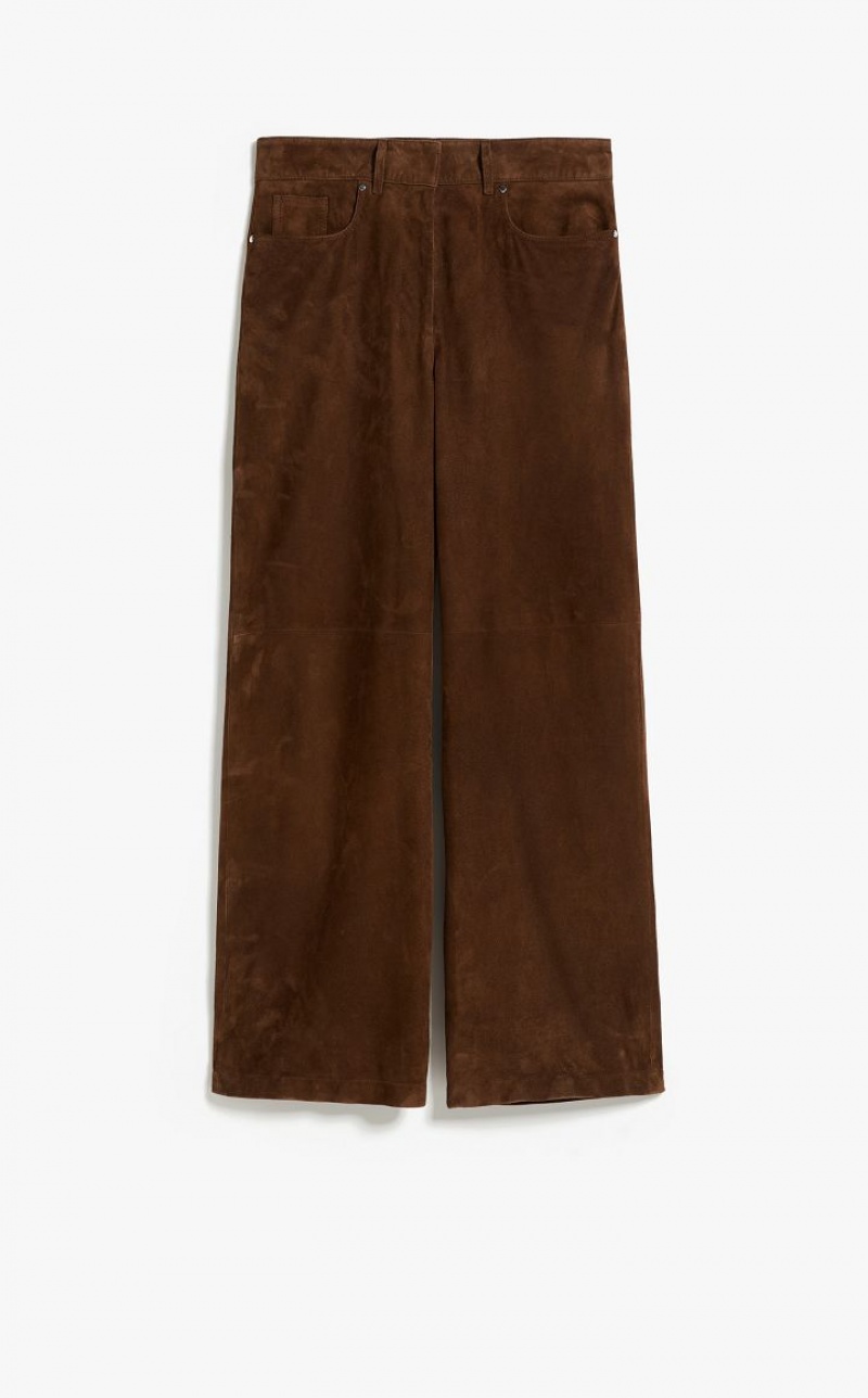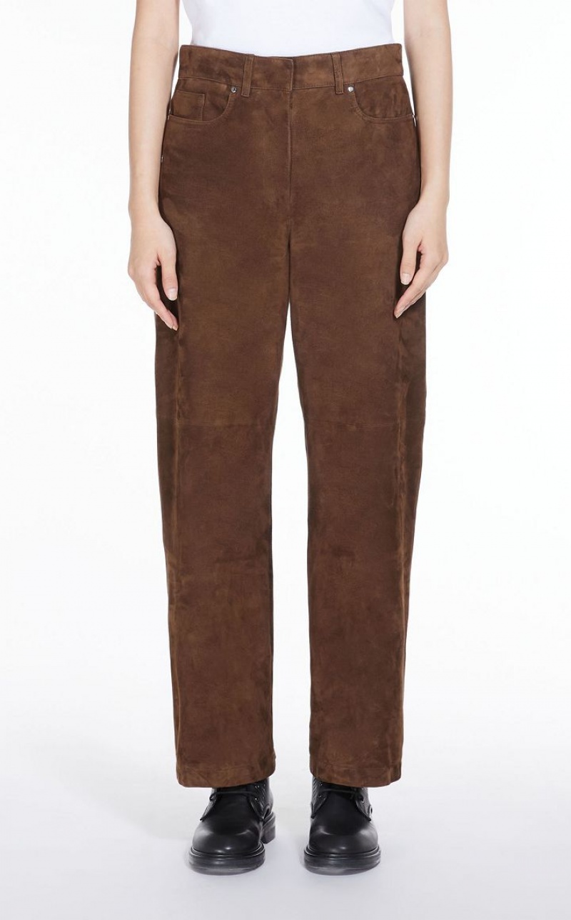 Long soft suede trousers featuring a slightly flared cut and 5-pocket style. Concealed zip fastening. Length: 103 cm.