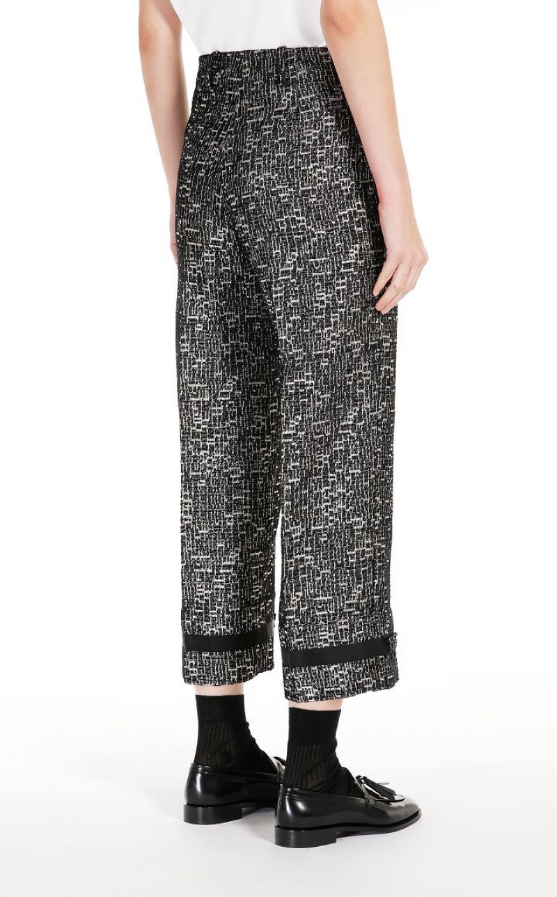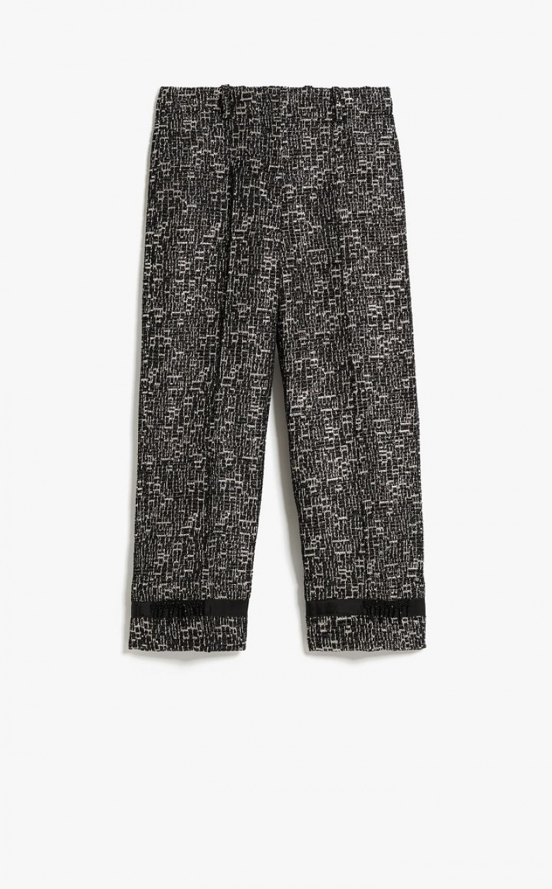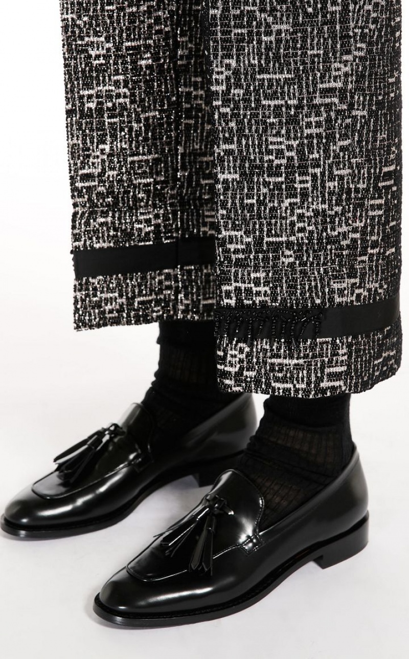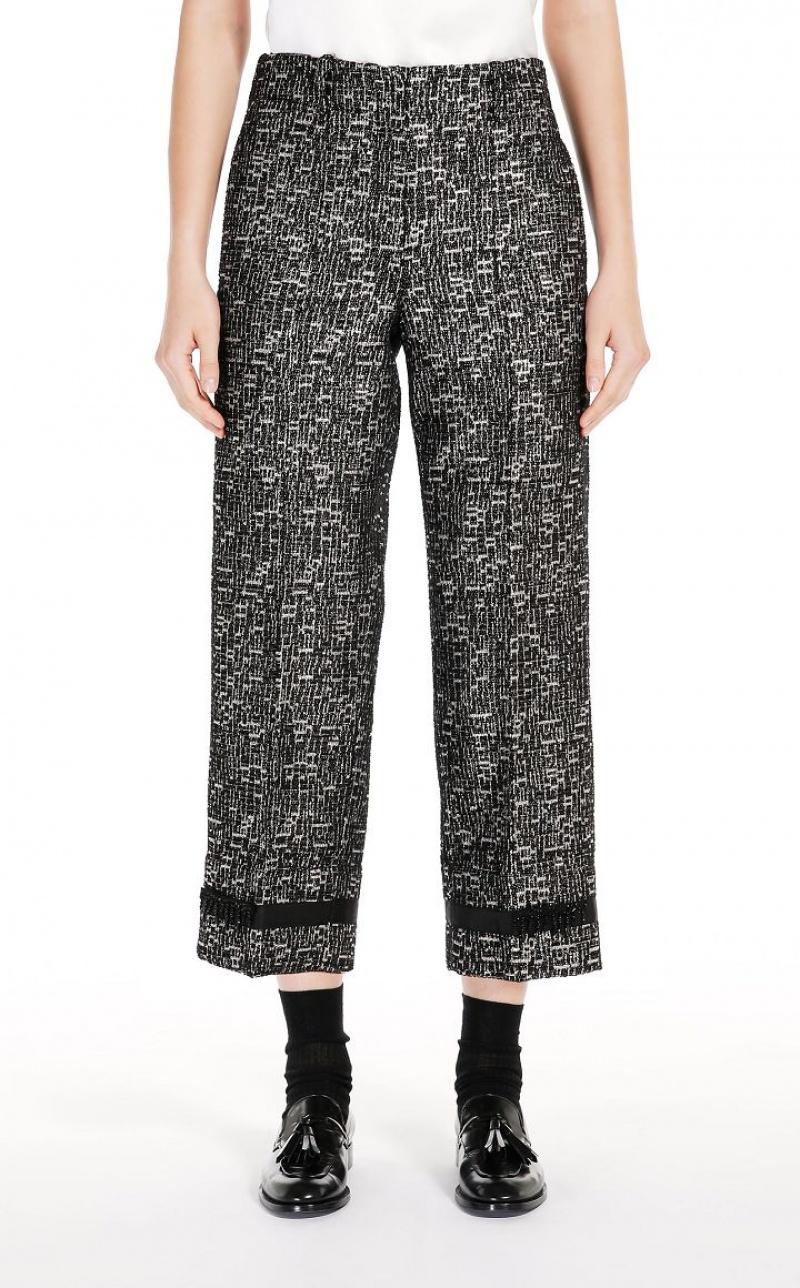 Long trousers in fine cotton jacquard and lamé fabric featuring a black ribbon at the leg hems, in addition to removable beaded fringe detail on the front. Concealed zip fastening. Length: 95 cm.
