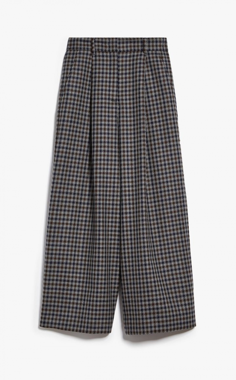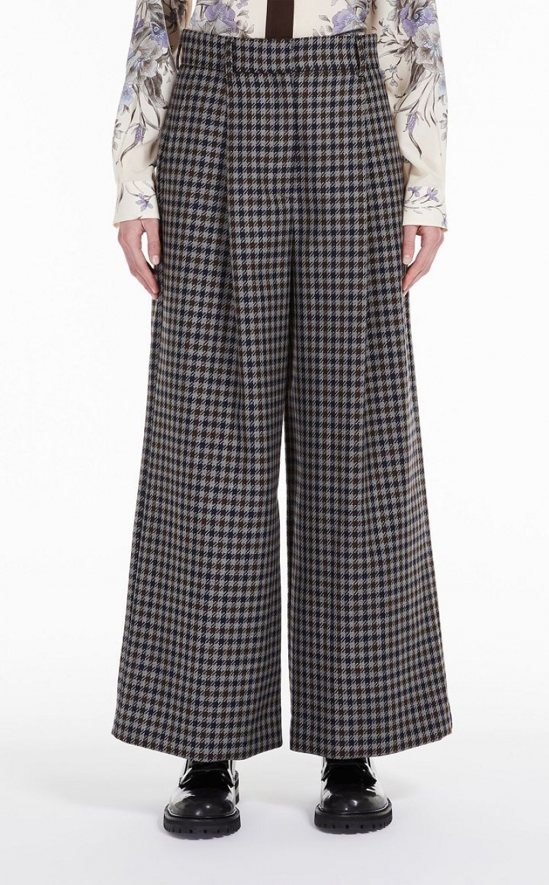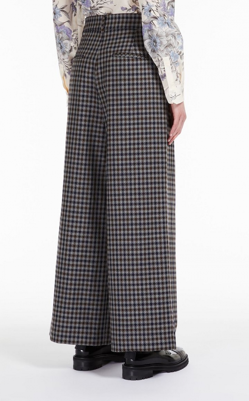 Palazzo trousers in wool and cotton basketweave fabric. Belt loop and dart embellished waistband, slant front pockets and buttoned welt rear pockets. Zip and double hook and bar fastening.