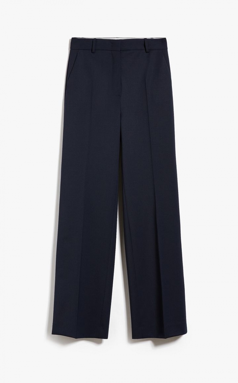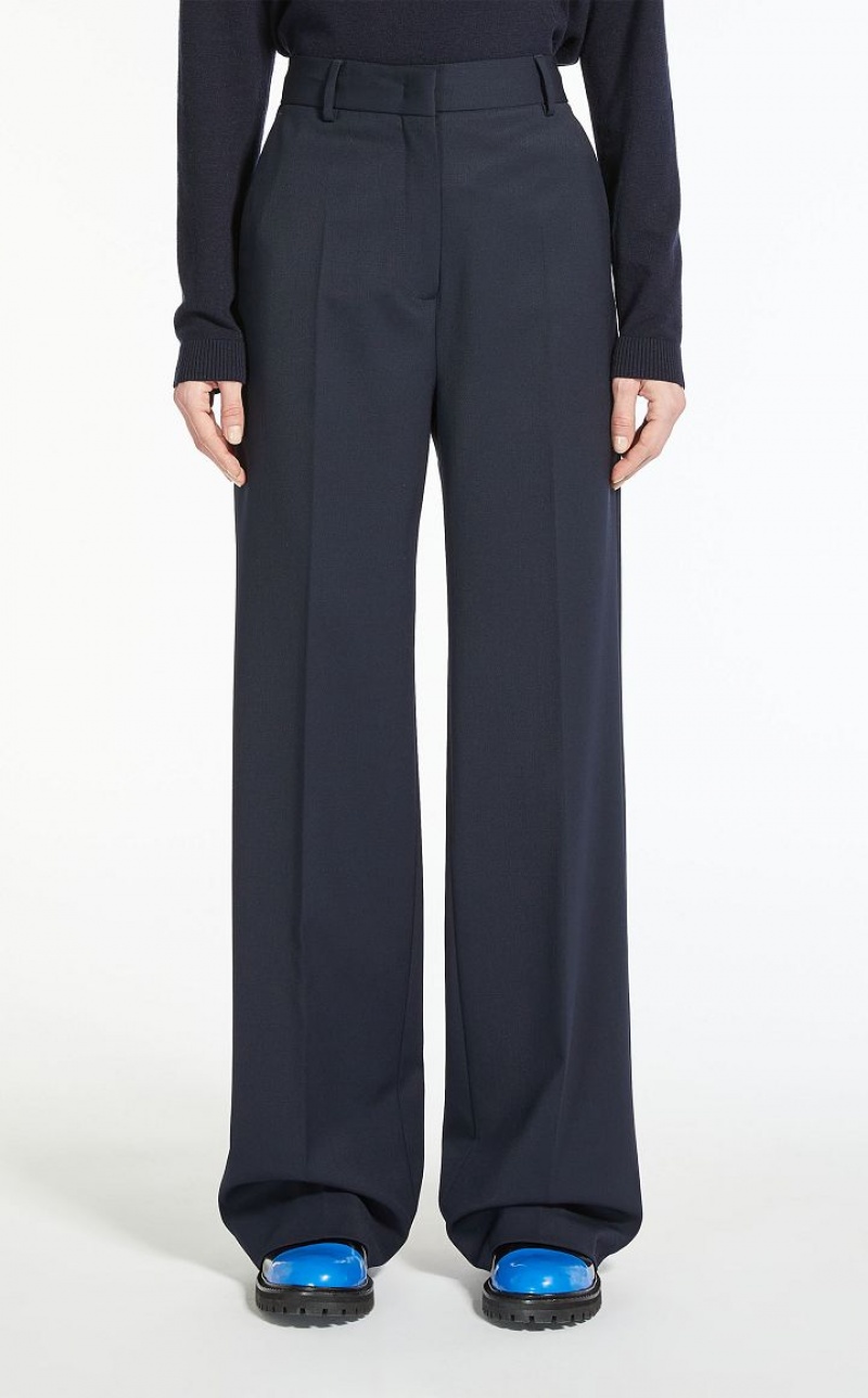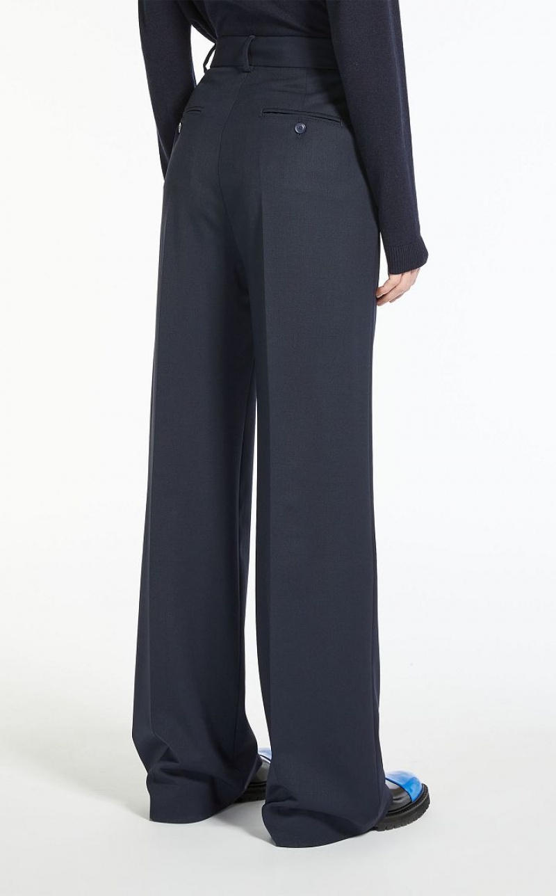 Wool and technical fabric palazzo trousers. Waistband, central pressed pleat detail, slant front pockets and buttoned welt rear pockets. Zip and hook and bar fastening. Length: 113 cm.