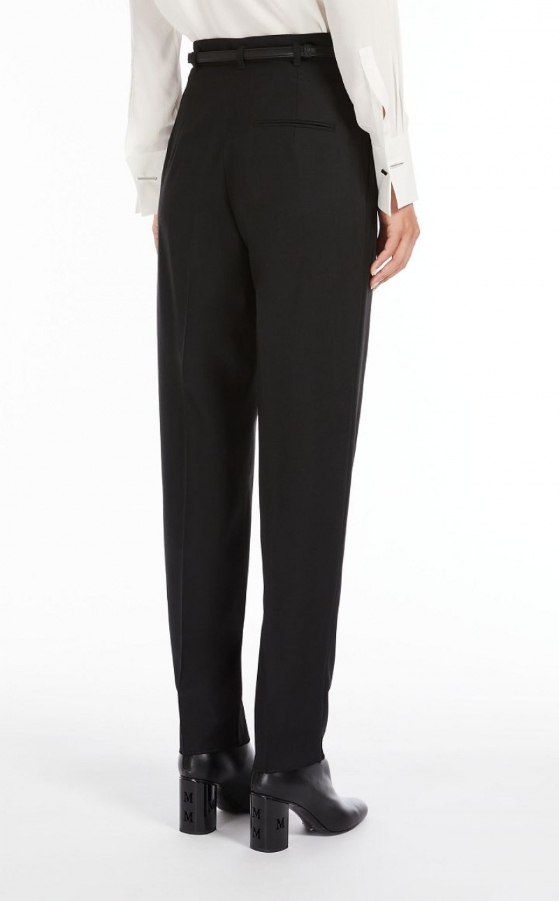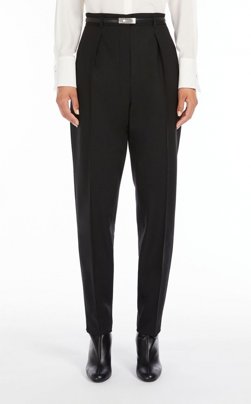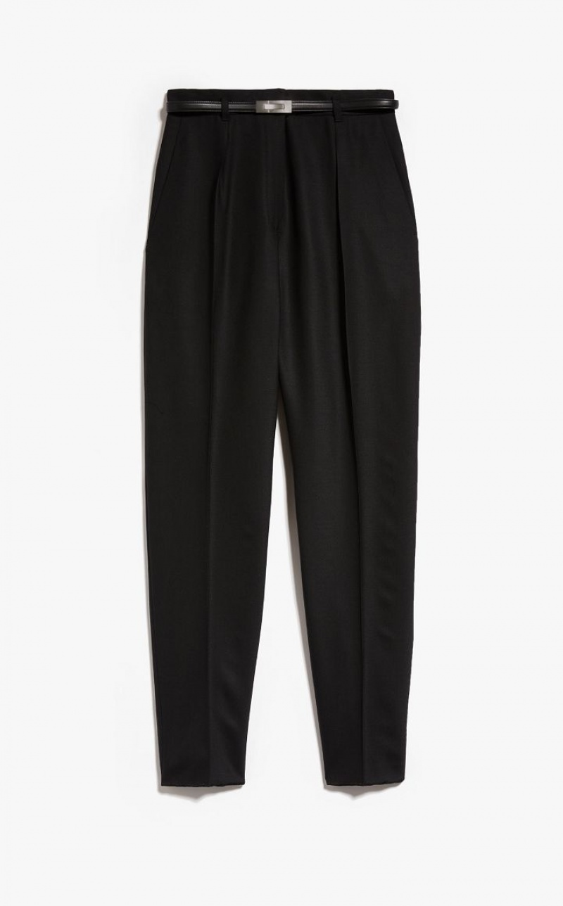Wool twill carrot-fit trousers cropped above the ankle. Style with matching belt, pleats on the front and trouser crease down the leg. Slant pockets at the sides and welt pockets at the back. Fastening with high waistband tab, zip fly and small hook. Length: 100 cm.