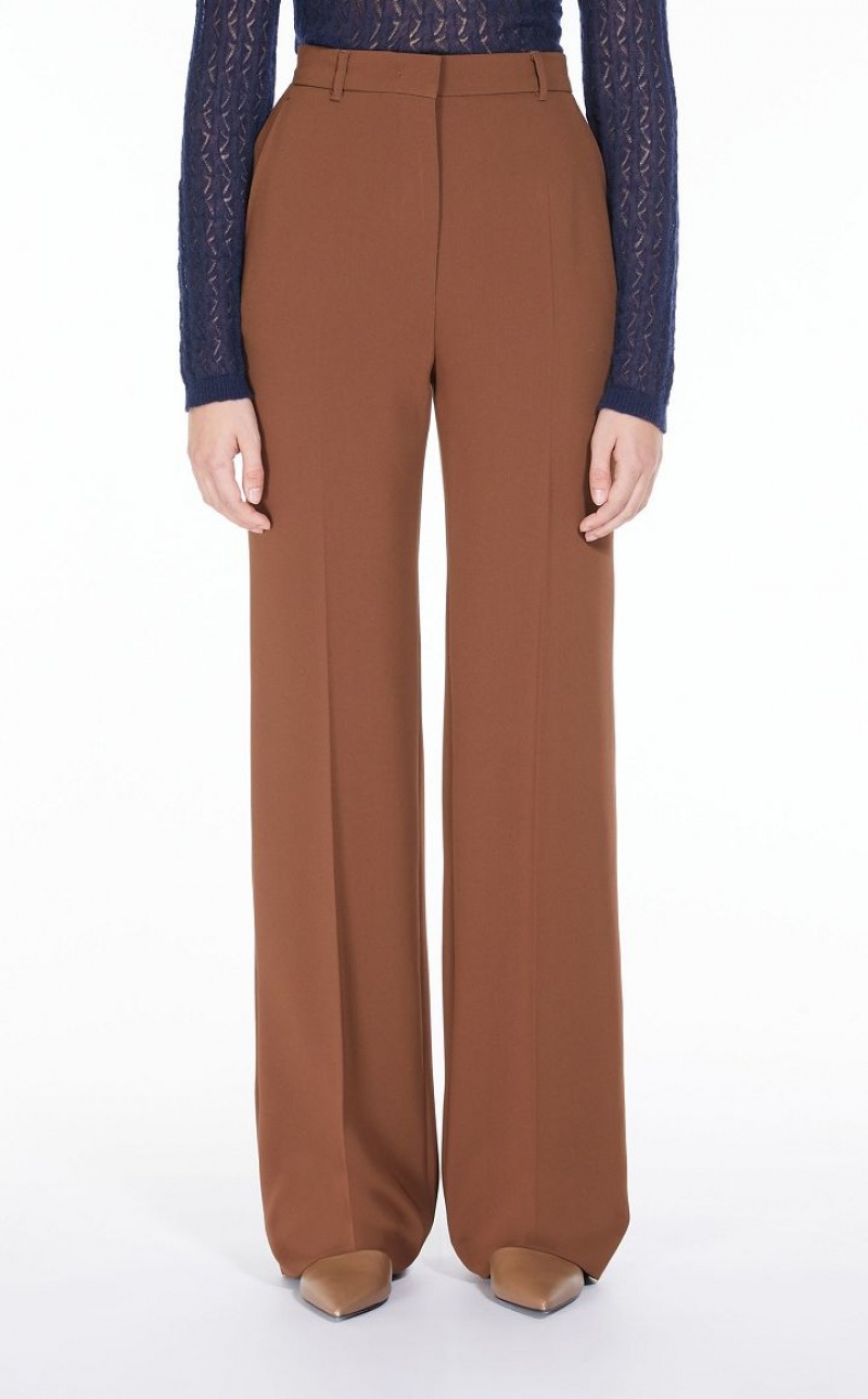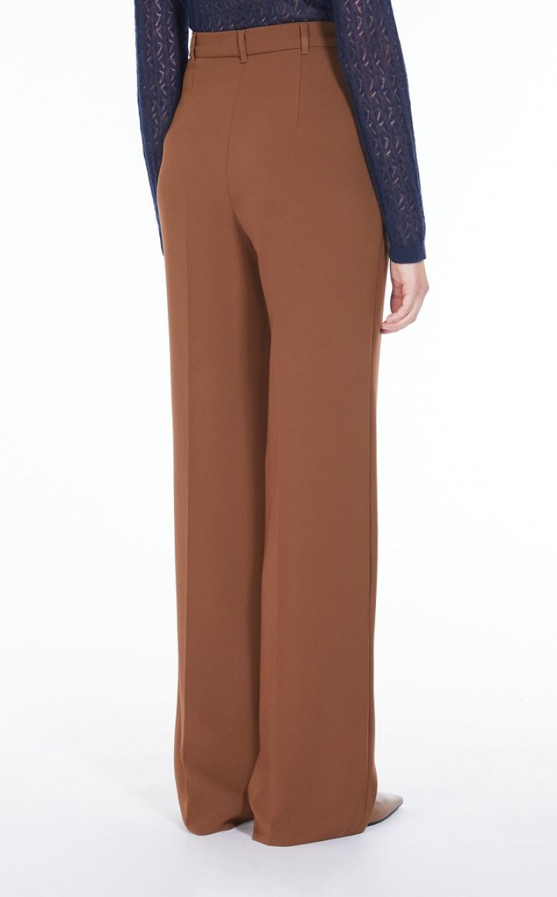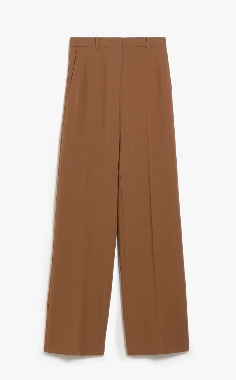 Long trousers in technical cady fabric featuring a tailoring-inspired straight fit. The model boasts bias-cut front pockets, belt loops at the waist and pressed pleat detail on the leg. Extended waist tab, complete with a placket-covered zip and hook-and-bar fastening. Length: 118 cm.